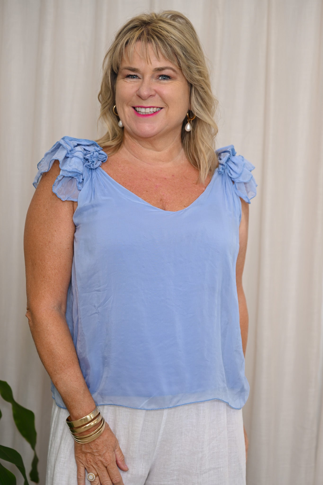 Ideal for warm-weather dressing, the Abby Top can be styled with tailored pants or a skirt for events, dinners, or evenings out, or paired with denim or linen shorts for effortless daytime wear. Its airy fabric and relaxed fit make it well suited for holidays, garden parties, or brunch by the coast, while the soft frill detailing adds an elegant touch that transitions seamlessly from day to night.