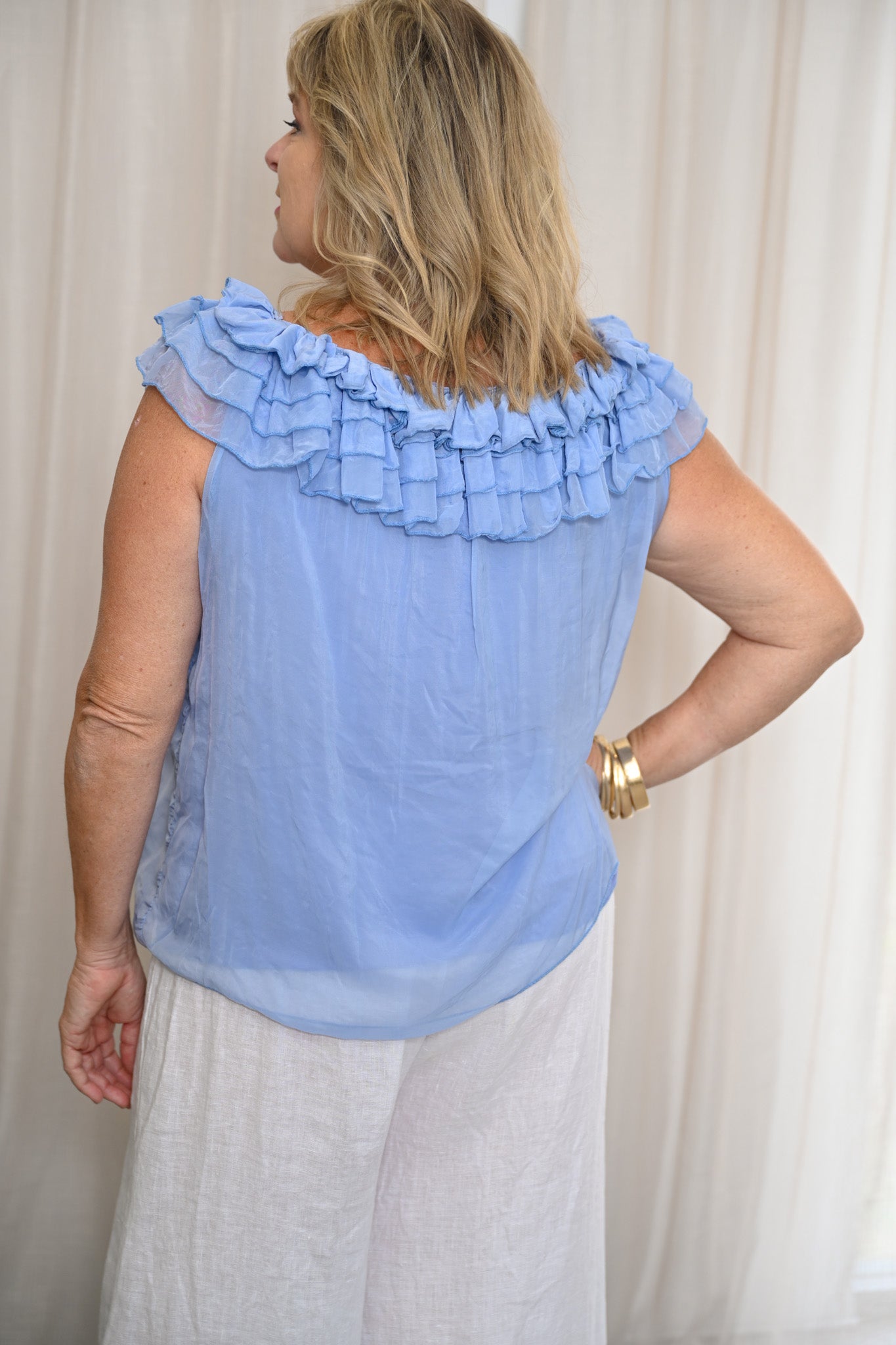The Abby Top in Azzuro is crafted from a lightweight silk blend outer with a soft, stretchy attached lining for comfortable wear. Designed with a flattering v-neckline and a generous boxy silhouette, this sleeveless style drapes effortlessly on the body. Six delicate layers of frill flow from the shoulder and continue around the back, adding movement and a feminine finish. The relaxed neckline allows the top to be worn on or off the shoulders, offering versatile styling options. Finished in Azzuro, a fresh light blue shade, this piece is perfect for elevating both casual and dressed-up looks.
