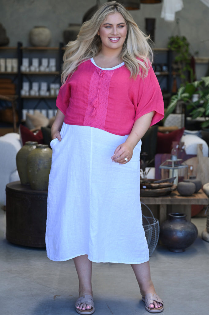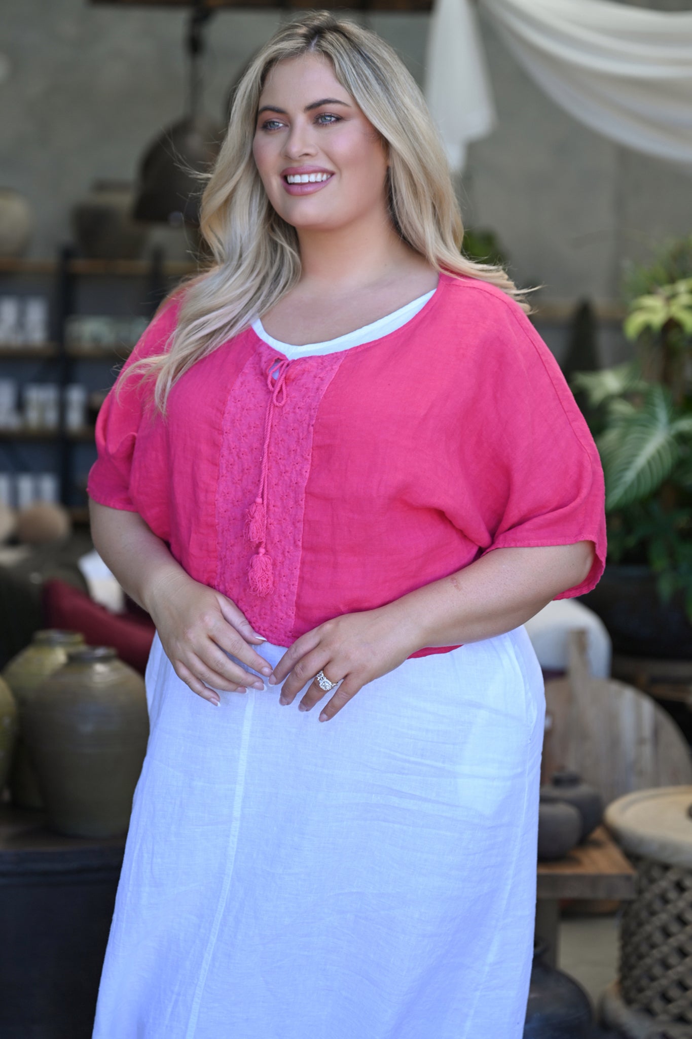 The Alanna Top in fuchsia brings a vibrant pop of colour to your wardrobe, crafted from 100% Italian linen for a soft, breathable feel. Its cropped, boxy silhouette offers a relaxed fit that pairs beautifully with high-waisted skirts or trousers, creating a look that’s both effortless and contemporary.