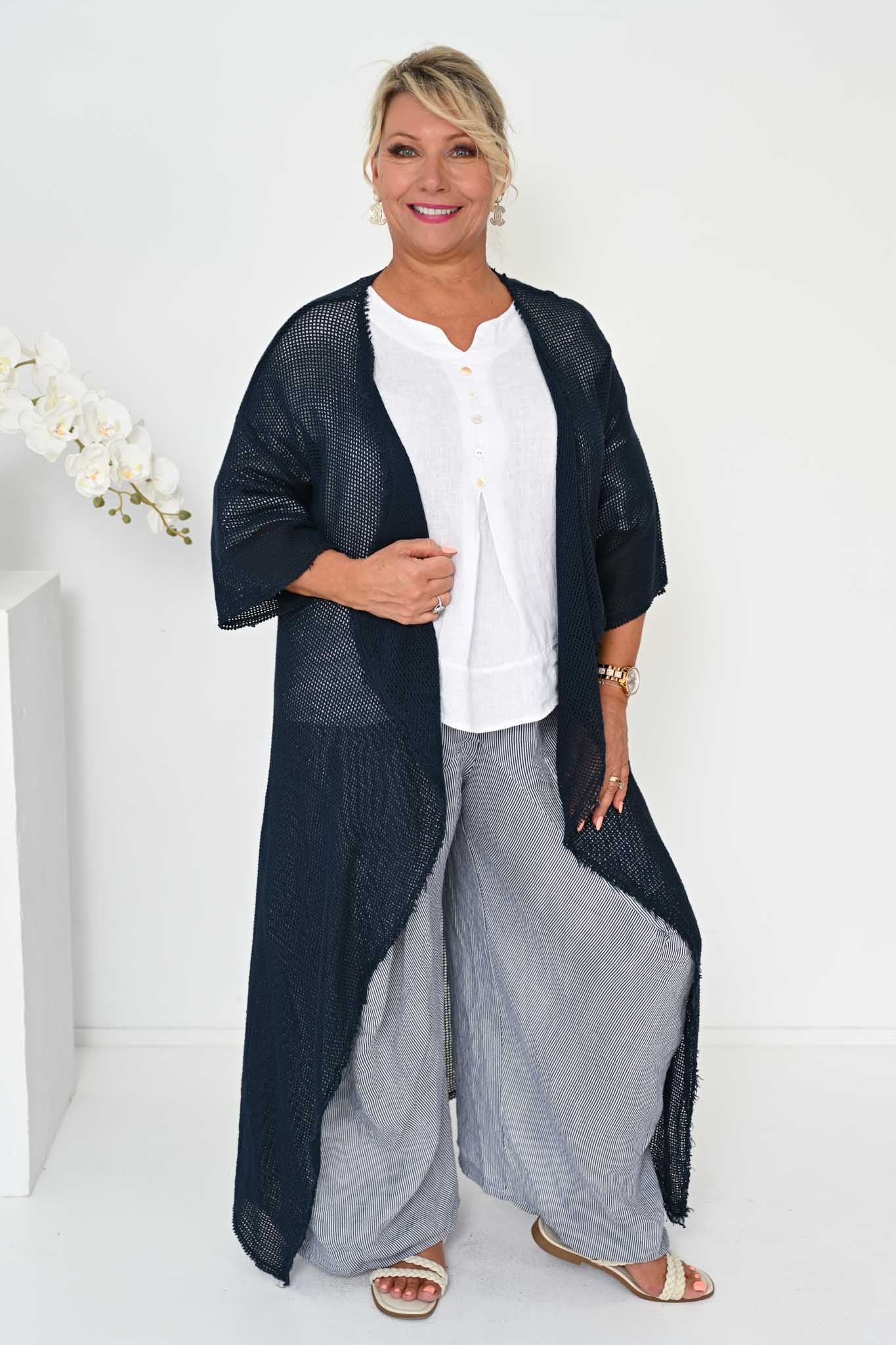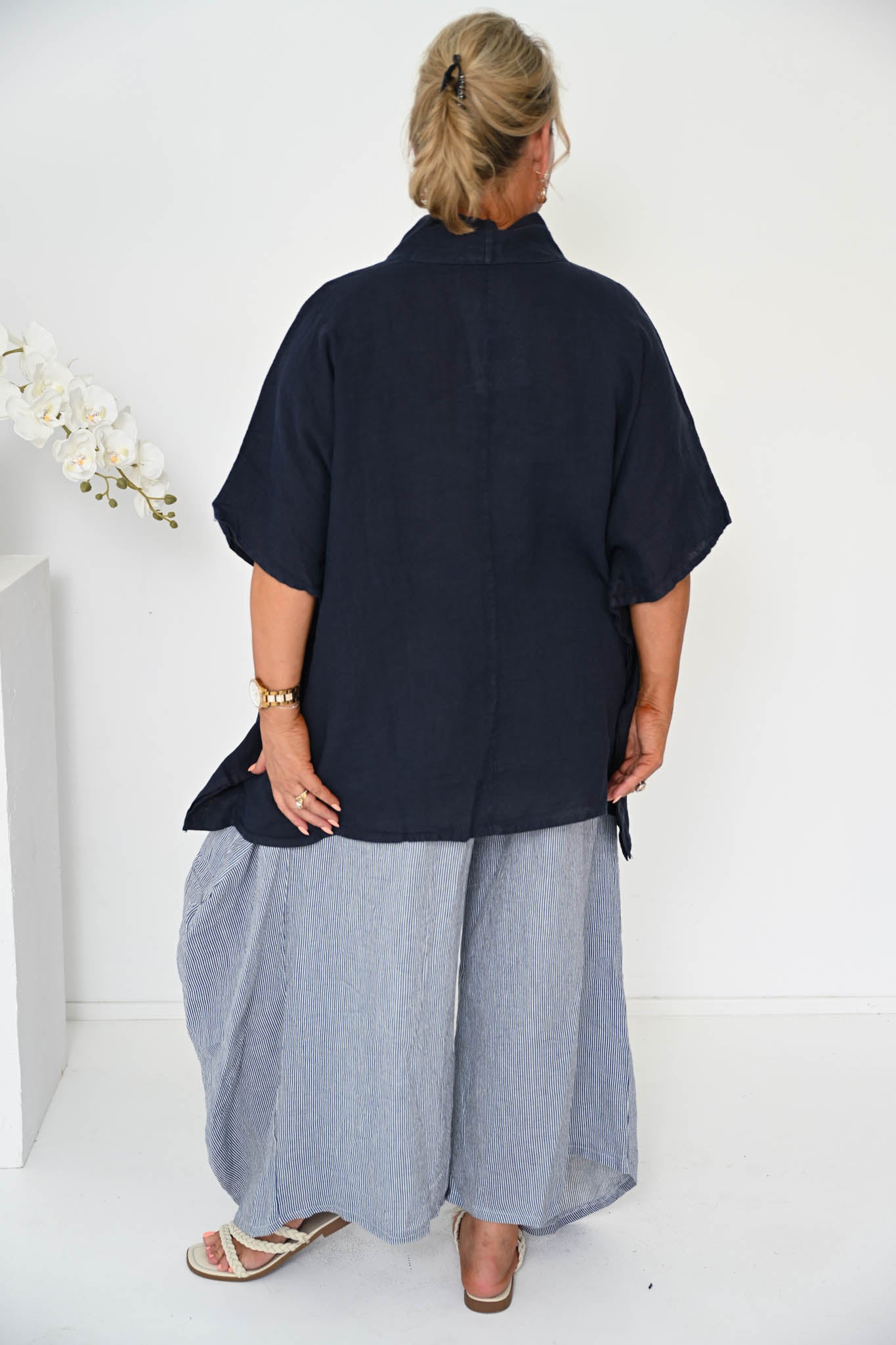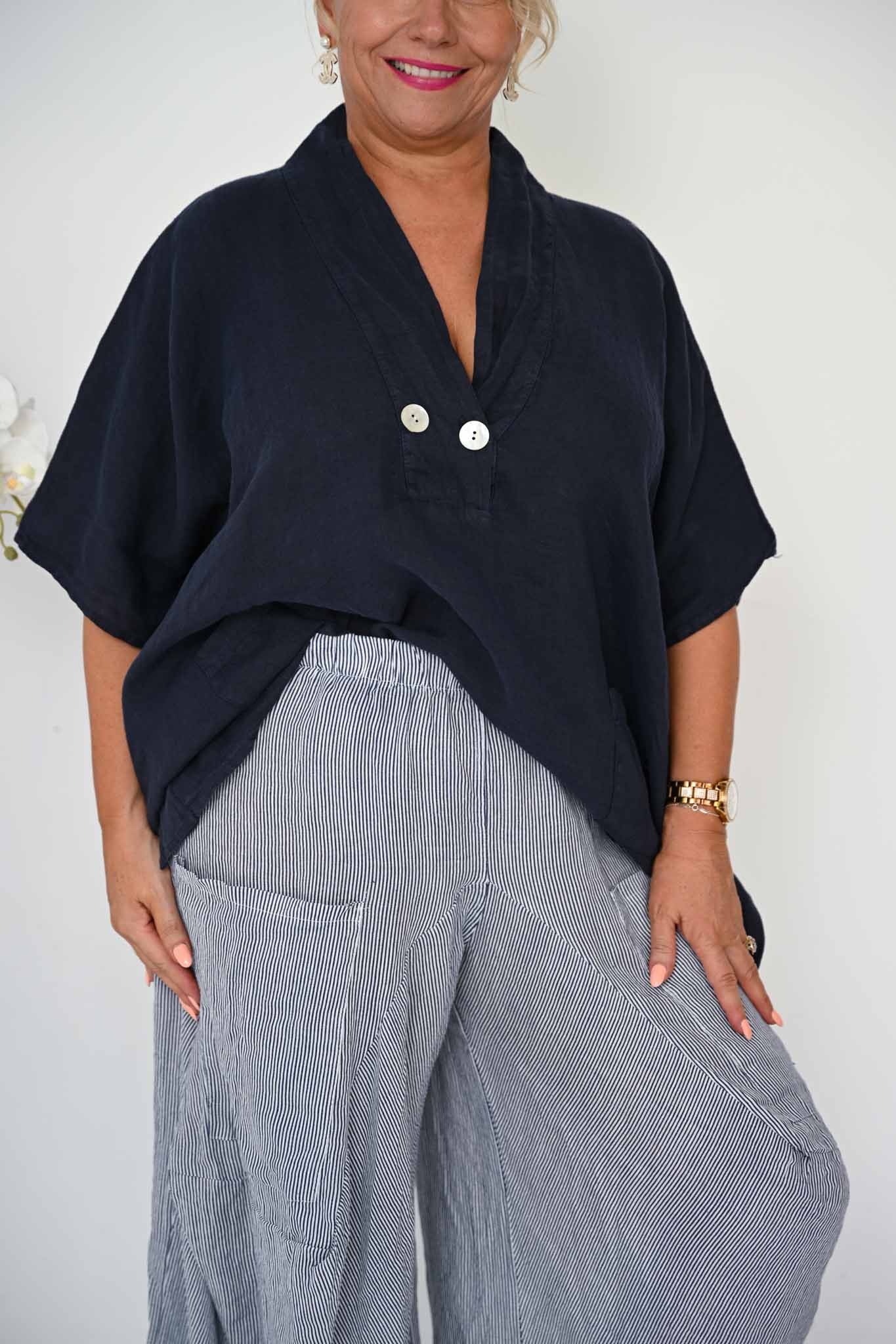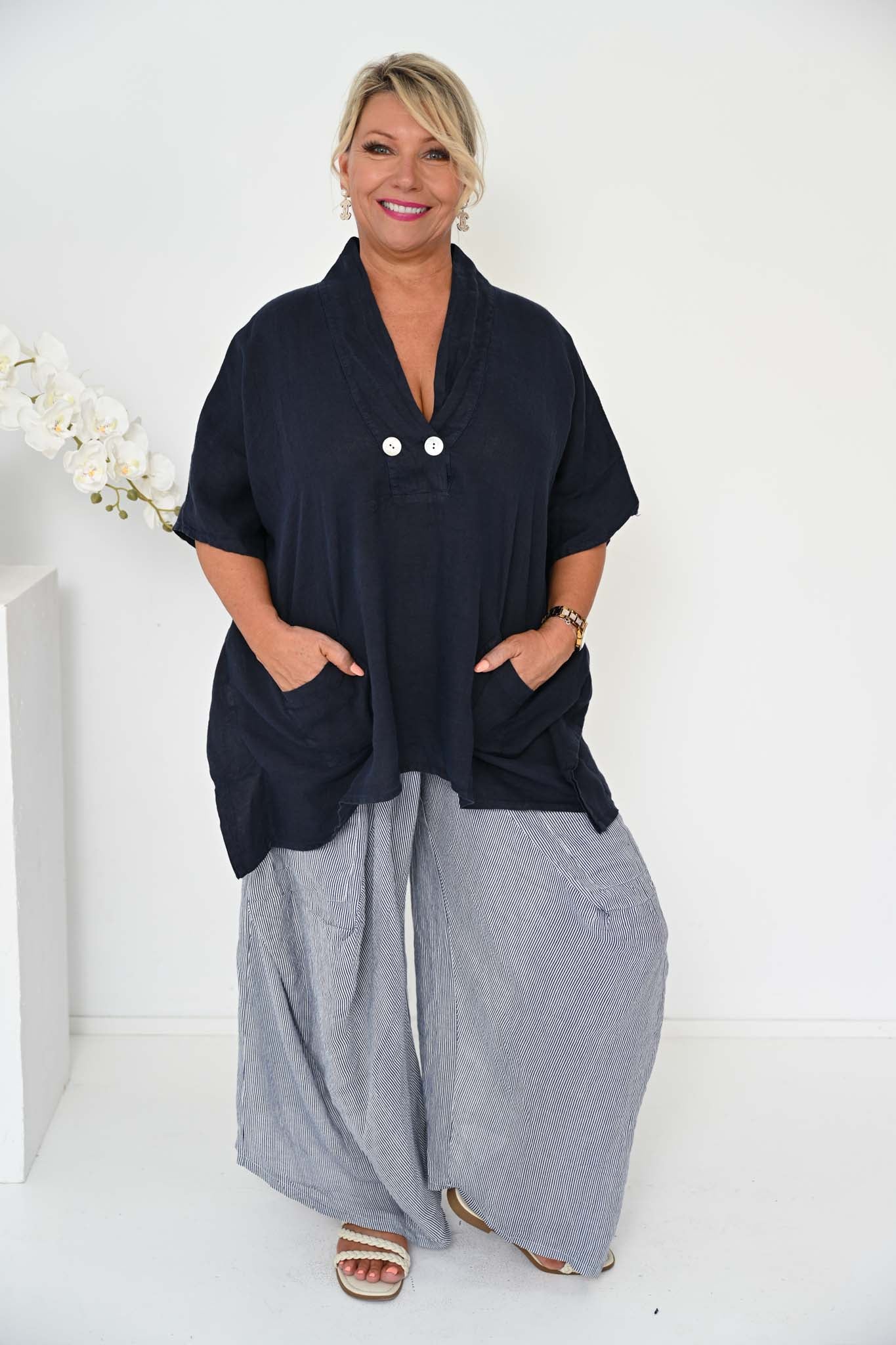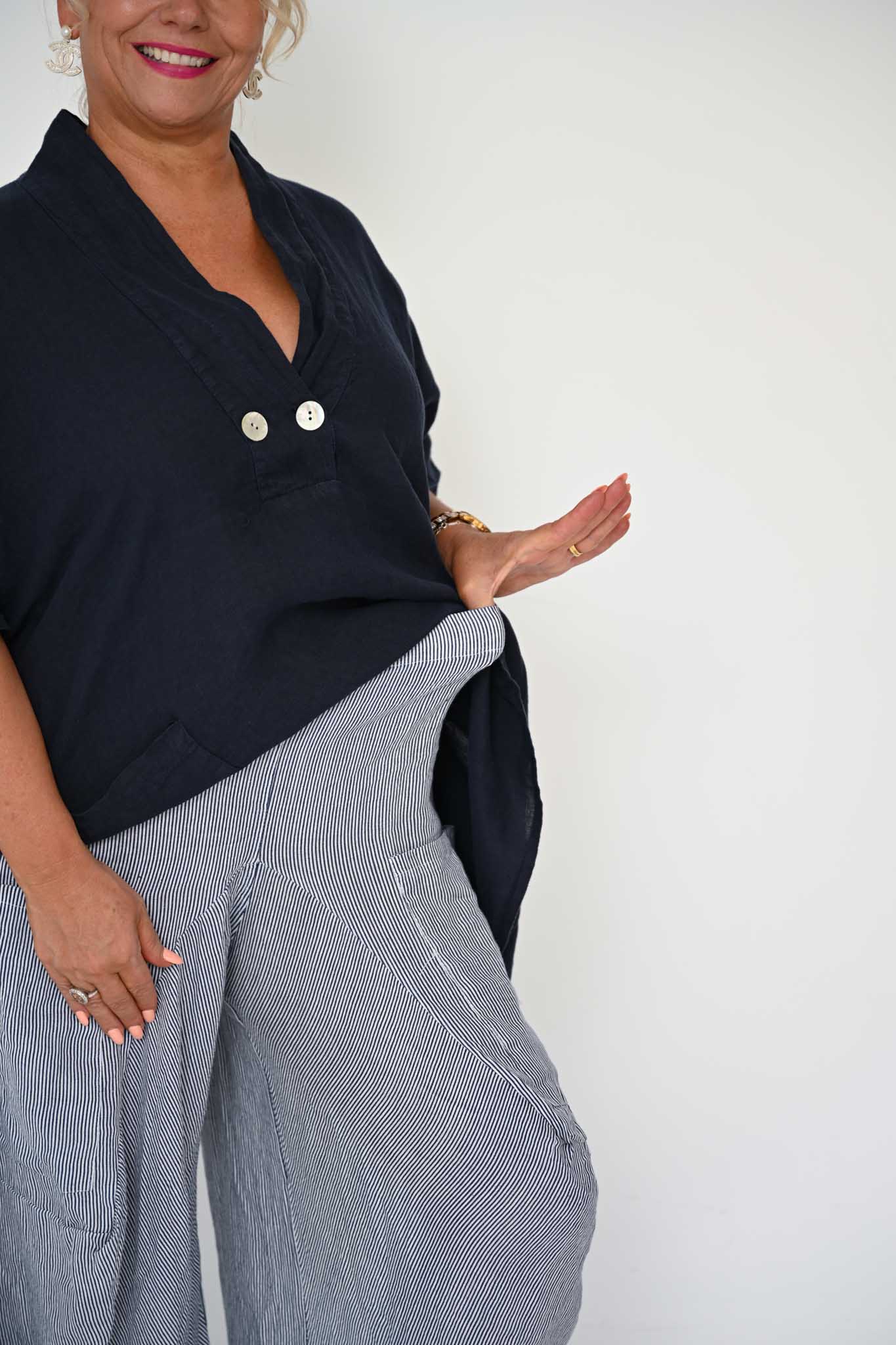 The Alicia Pant is a statement-making silhouette crafted from breathable Italian linen. Featuring a subtle thin navy stripe, these pants combine relaxed comfort with artful tailoring for a modern, elevated look.