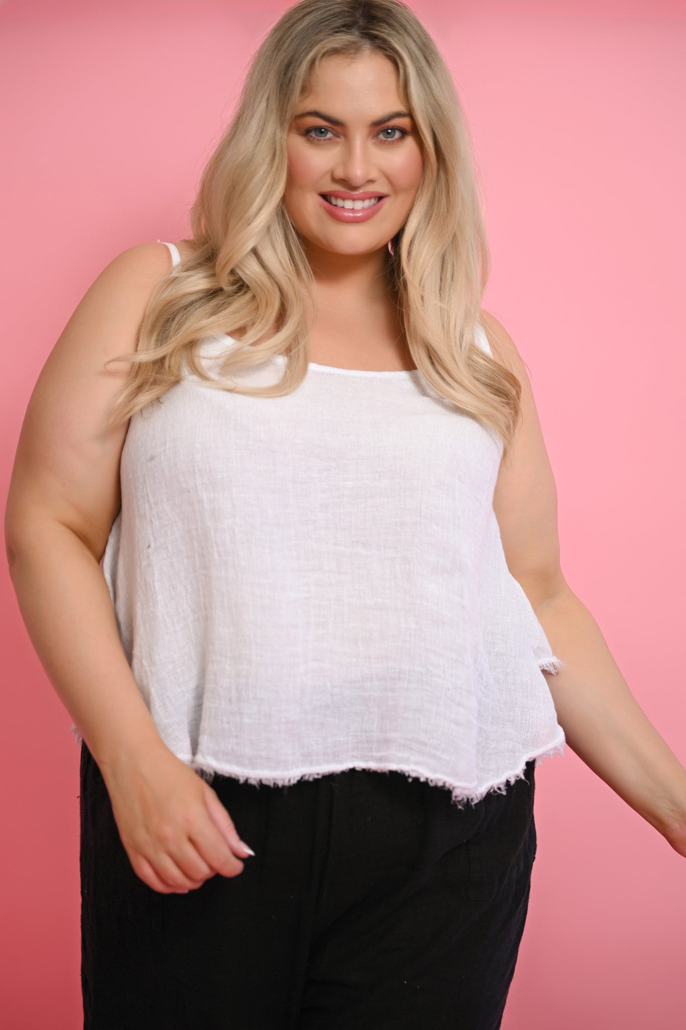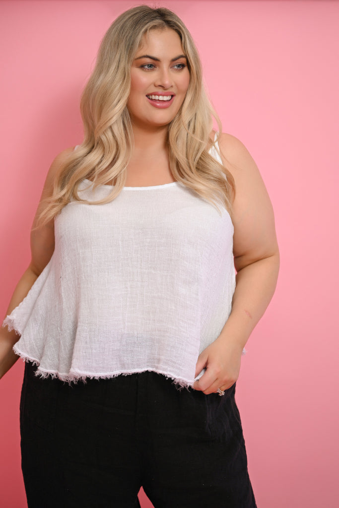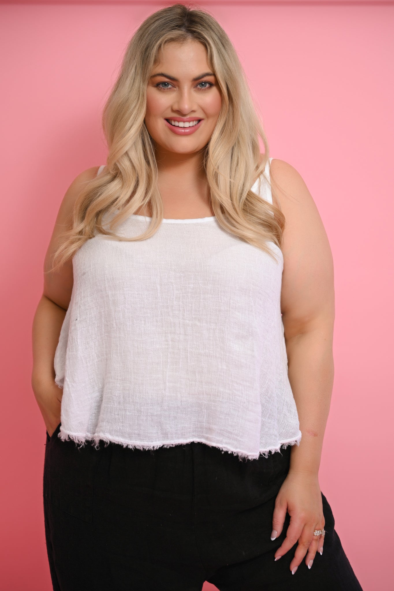 The Amity Singlet is a lightweight, breezy top crafted from open-weave linen in crisp white. Designed with an A-line silhouette, it drapes effortlessly over the body, creating a relaxed, airy shape. Adjustable shoestring straps and a tie at the back of the neck allow for a customizable fit, while the round neckline and frayed hem add subtle, casual detailing.