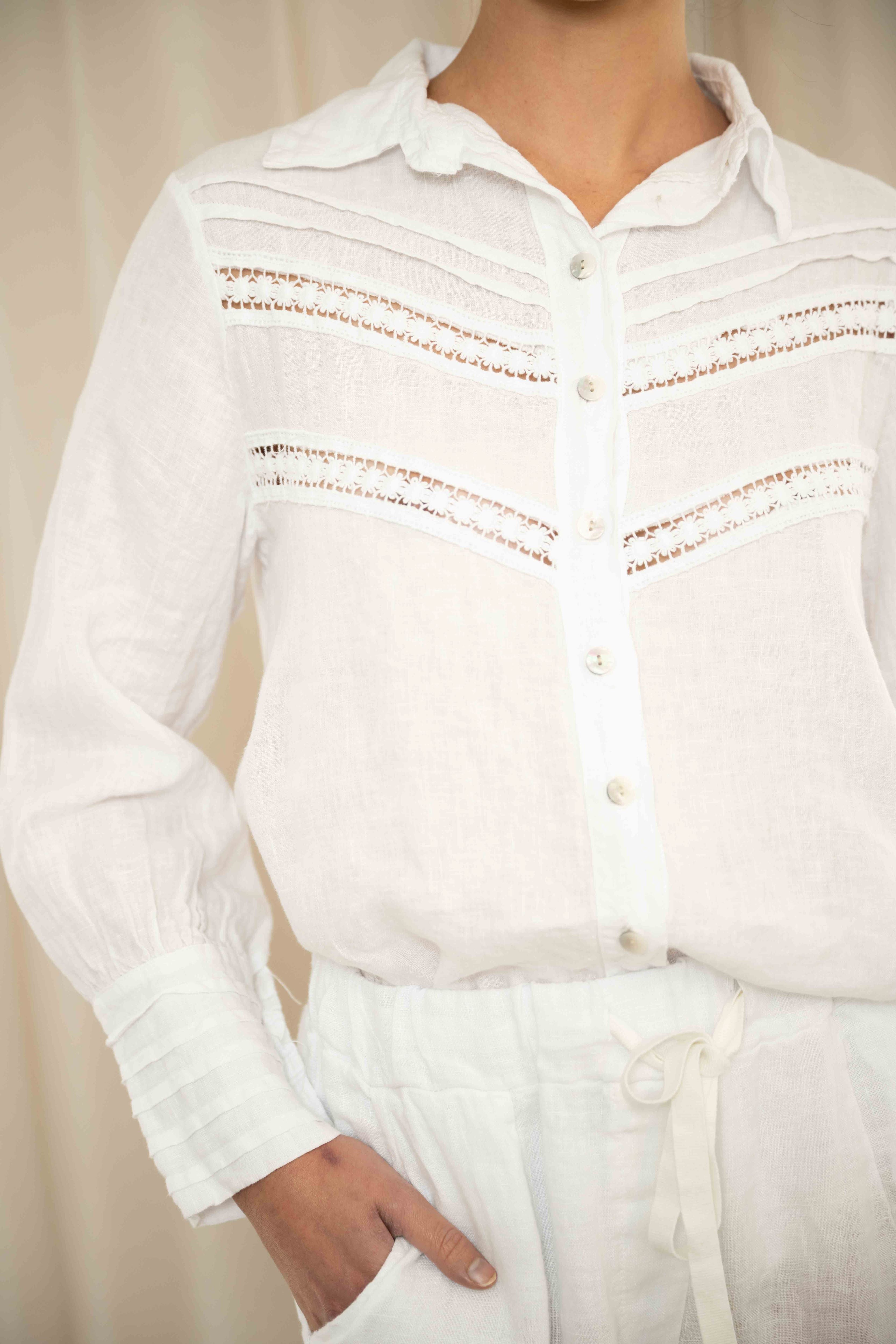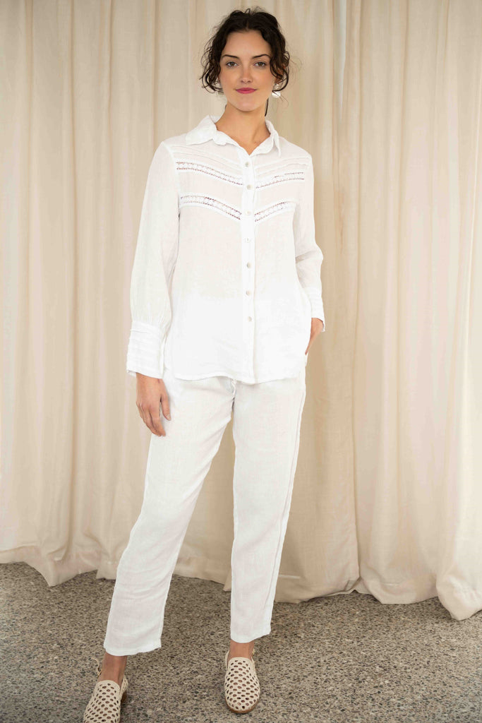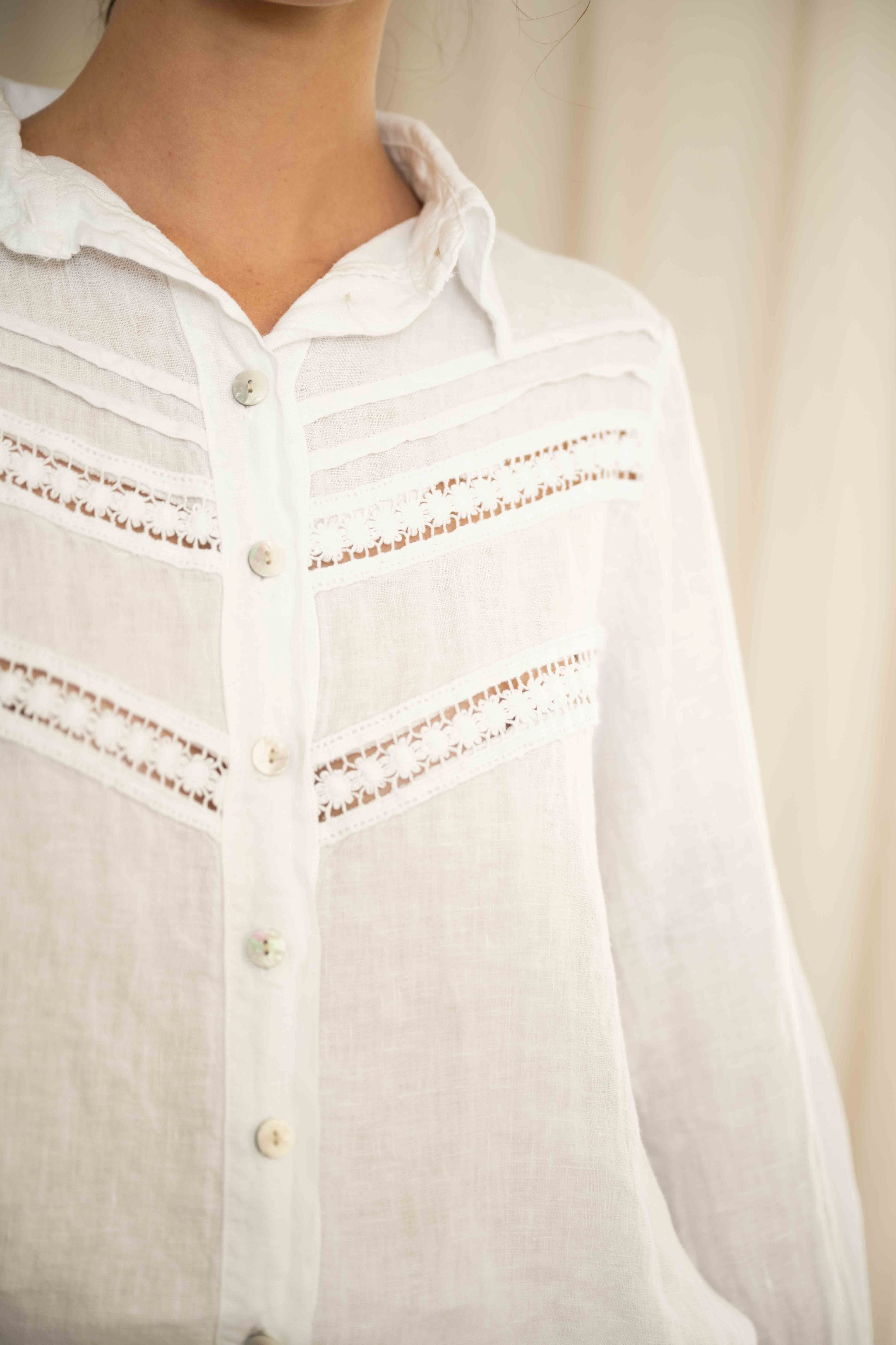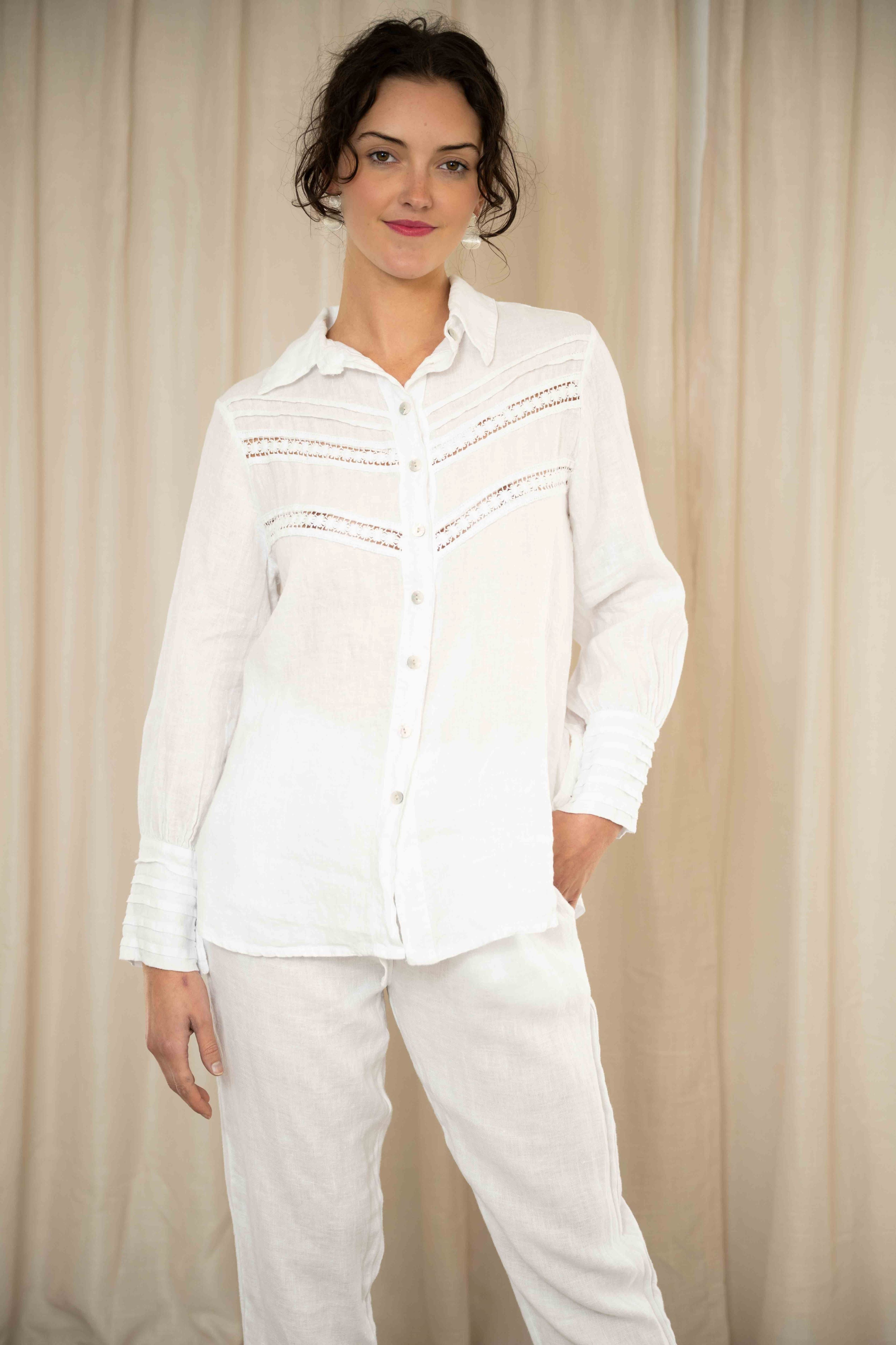 The Angelina Shirt in 100% linen is a romantic reimagining of a classic collared shirt, blending tailored structure with thoughtful, feminine detail. Designed with a gentle fluidity, it features a long sleeve silhouette and a softly curved hemline that adds shape and ease to the overall fit.