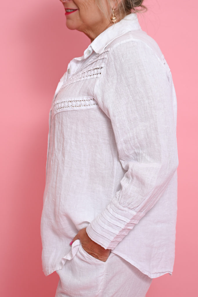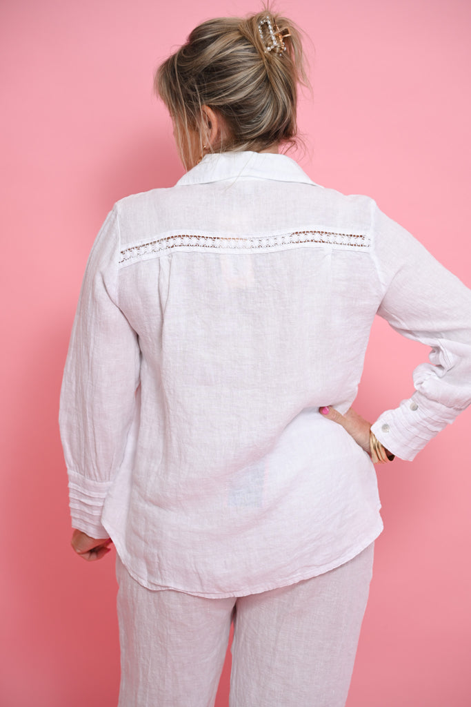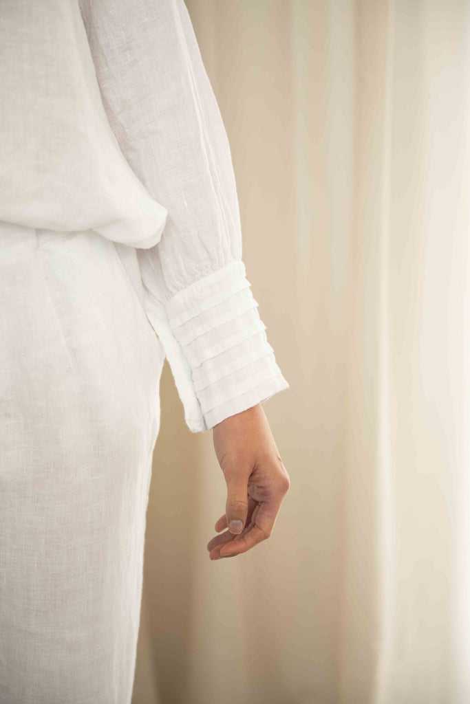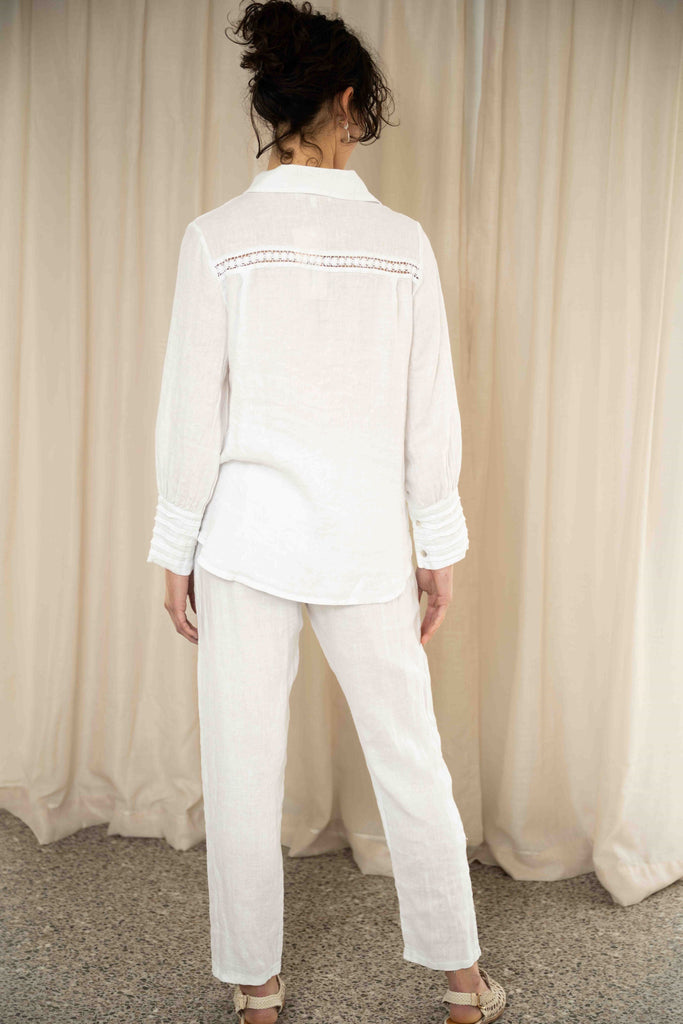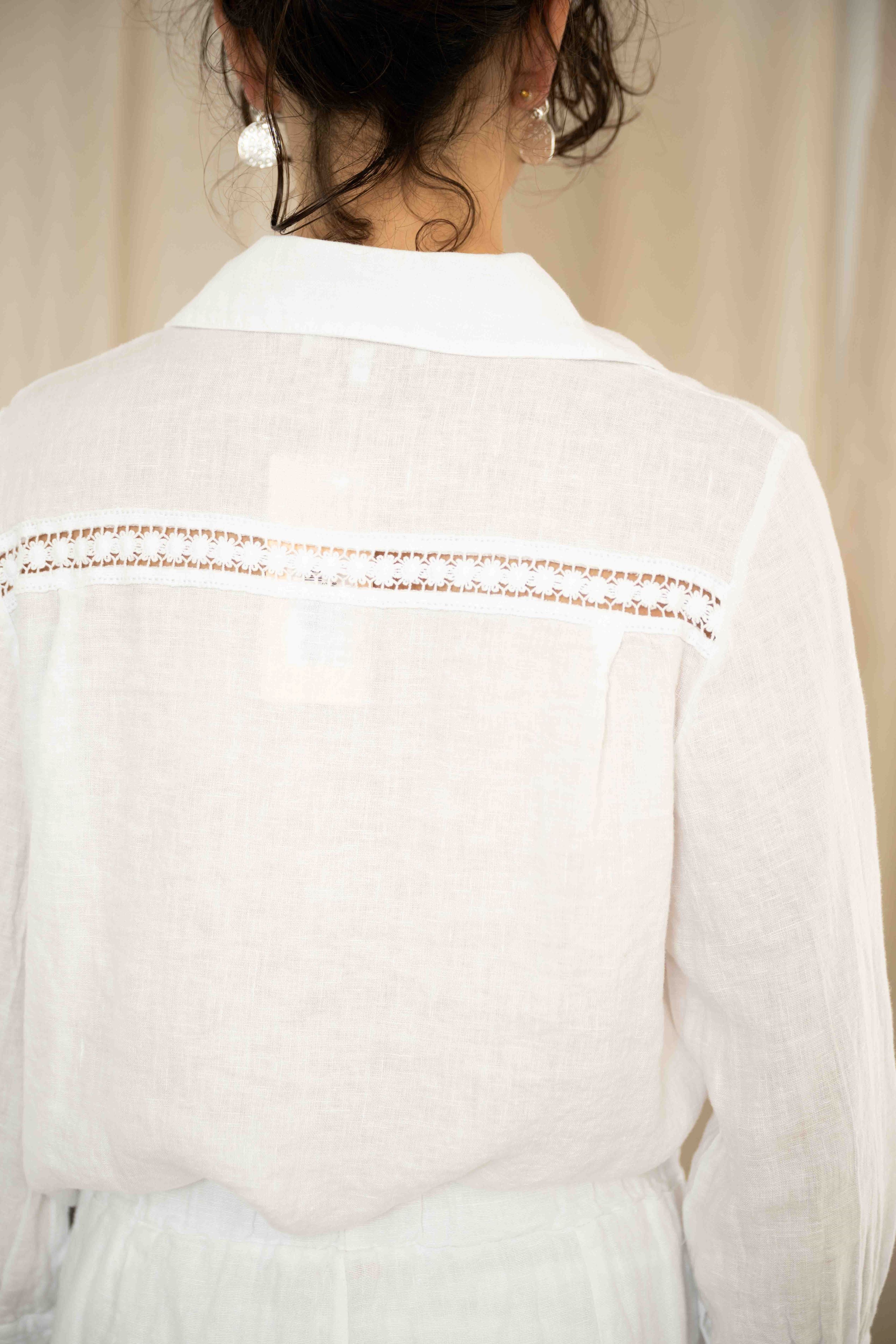 The Angelina Shirt in 100% linen is a romantic reimagining of a classic collared shirt, blending tailored structure with thoughtful, feminine detail. Designed with a gentle fluidity, it features a long sleeve silhouette and a softly curved hemline that adds shape and ease to the overall fit.