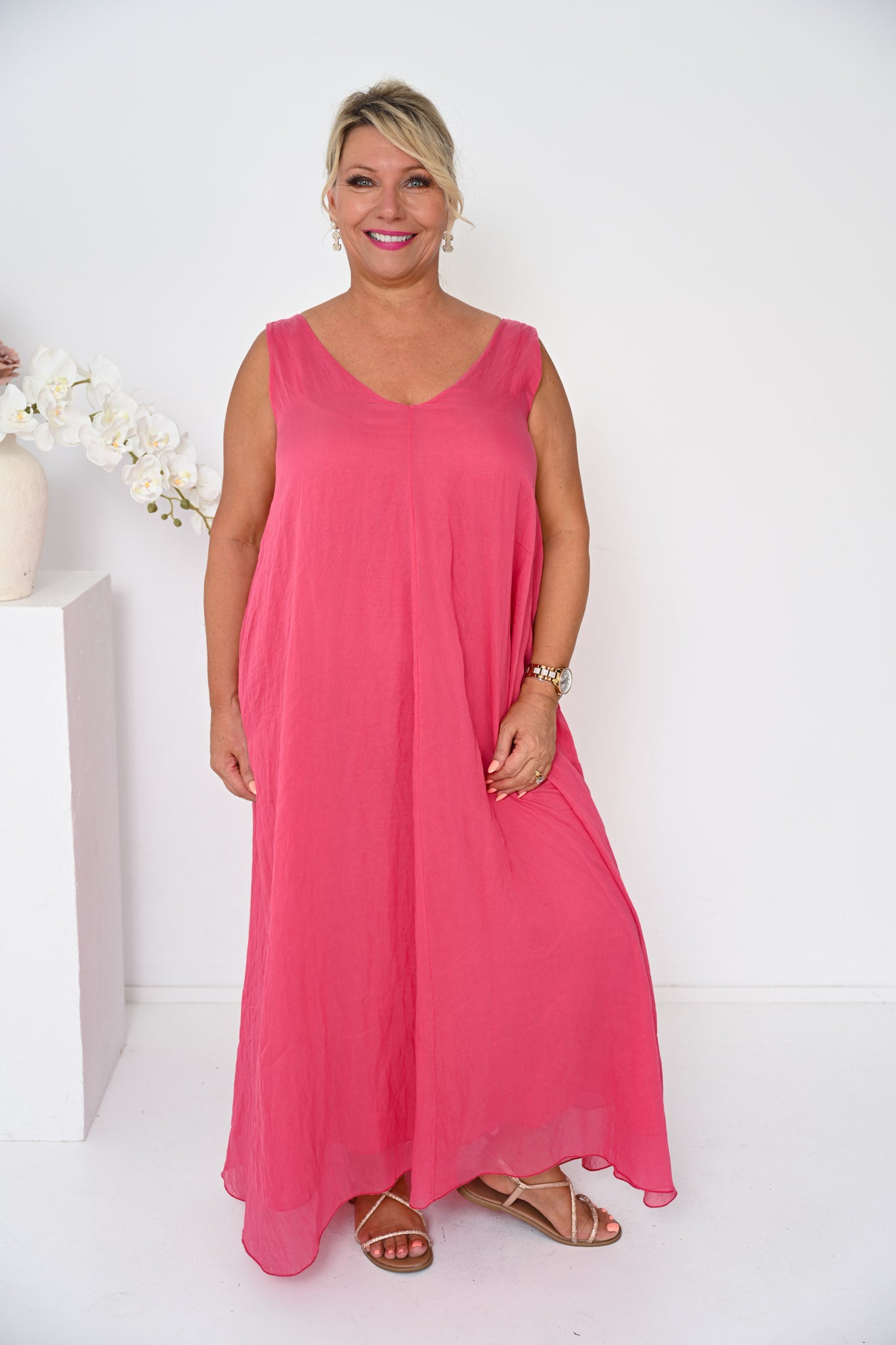 Featuring a flattering V-neckline and a sleeveless design, the Aria Dress falls into a beautifully wide, free-flowing shape that offers generous proportions and an easy, graceful fit. Designed to celebrate curves and provide all-day comfort, its relaxed cut allows for movement without clinging.