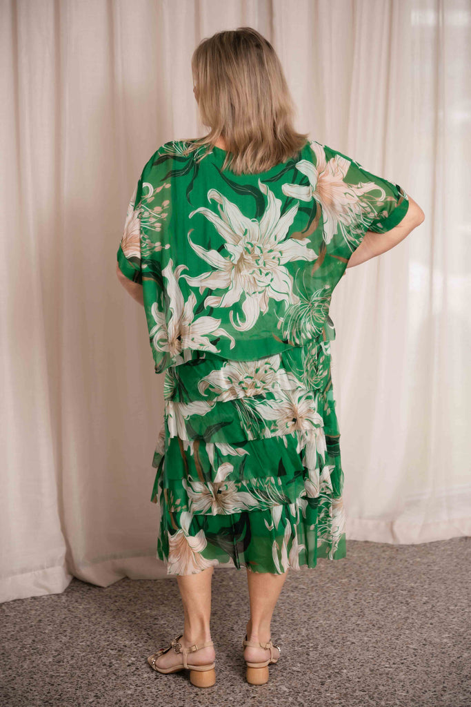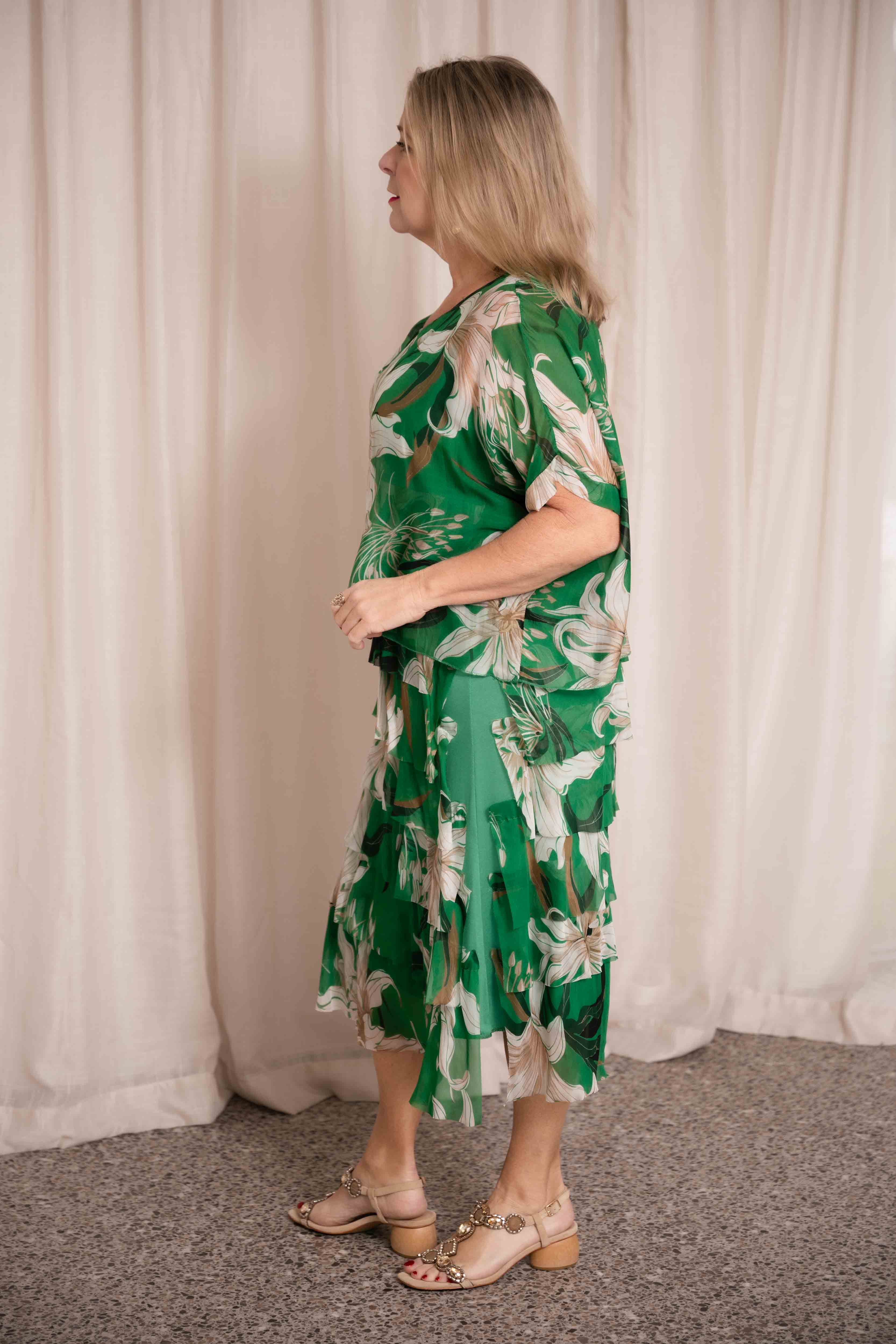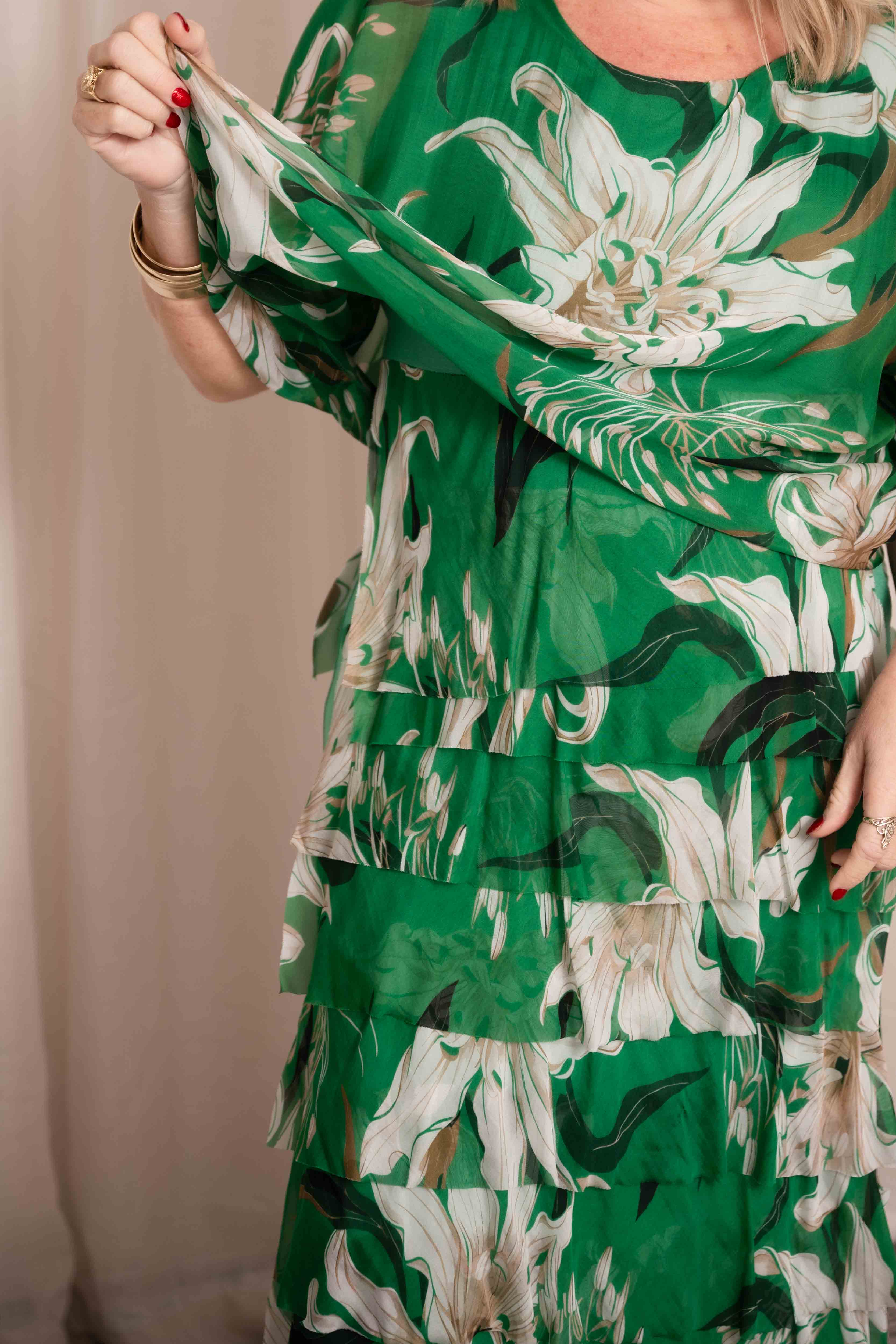 The bold green base is brought to life with a striking floral print in tones of deep blue and rich brown, adding depth and dimension to this statement piece. It’s a colourway that feels confident and fresh — perfect for garden parties, daytime events, or warm-weather evenings that call for something extra.