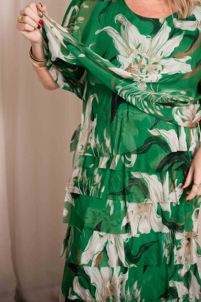 Vibrant and full of movement, the Athena Dress in Green is a bold yet elegant piece that brings effortless sophistication to any occasion. Made in Italy, this beautifully tailored design features a sheer silk outer layered over a soft viscose lining, offering lightness, breathability, and fluidity in every step.