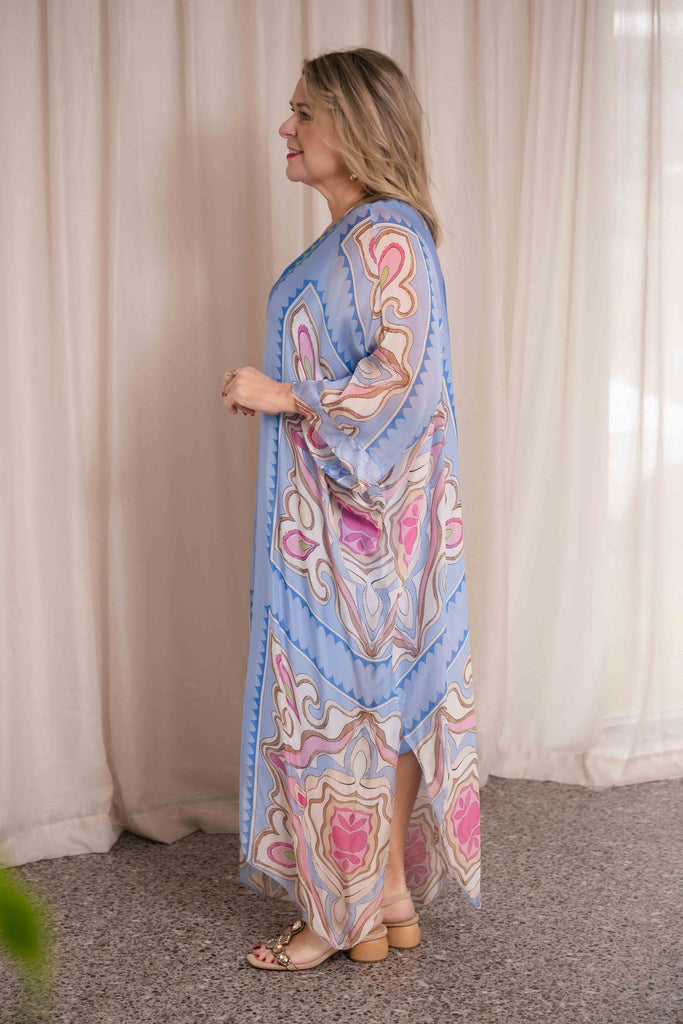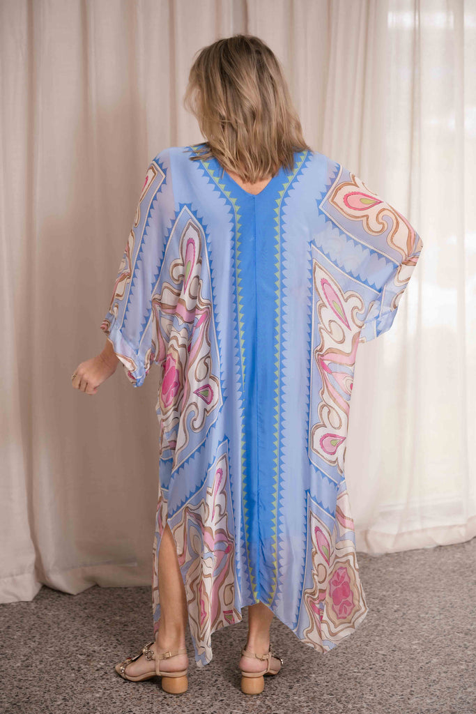 The print is a fresh take on bold — featuring a deep, cool-toned blue with pops of soft pink that dance across the fabric. A striking front stripe draws the eye vertically, elongating the form, while the asymmetrical hemline adds a touch of edge and movement.
