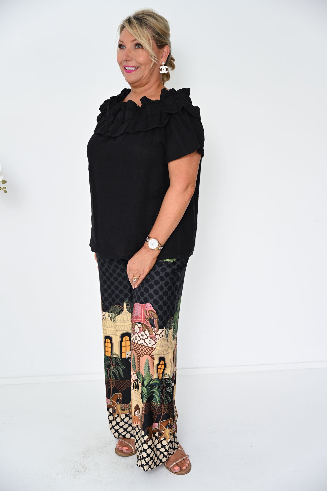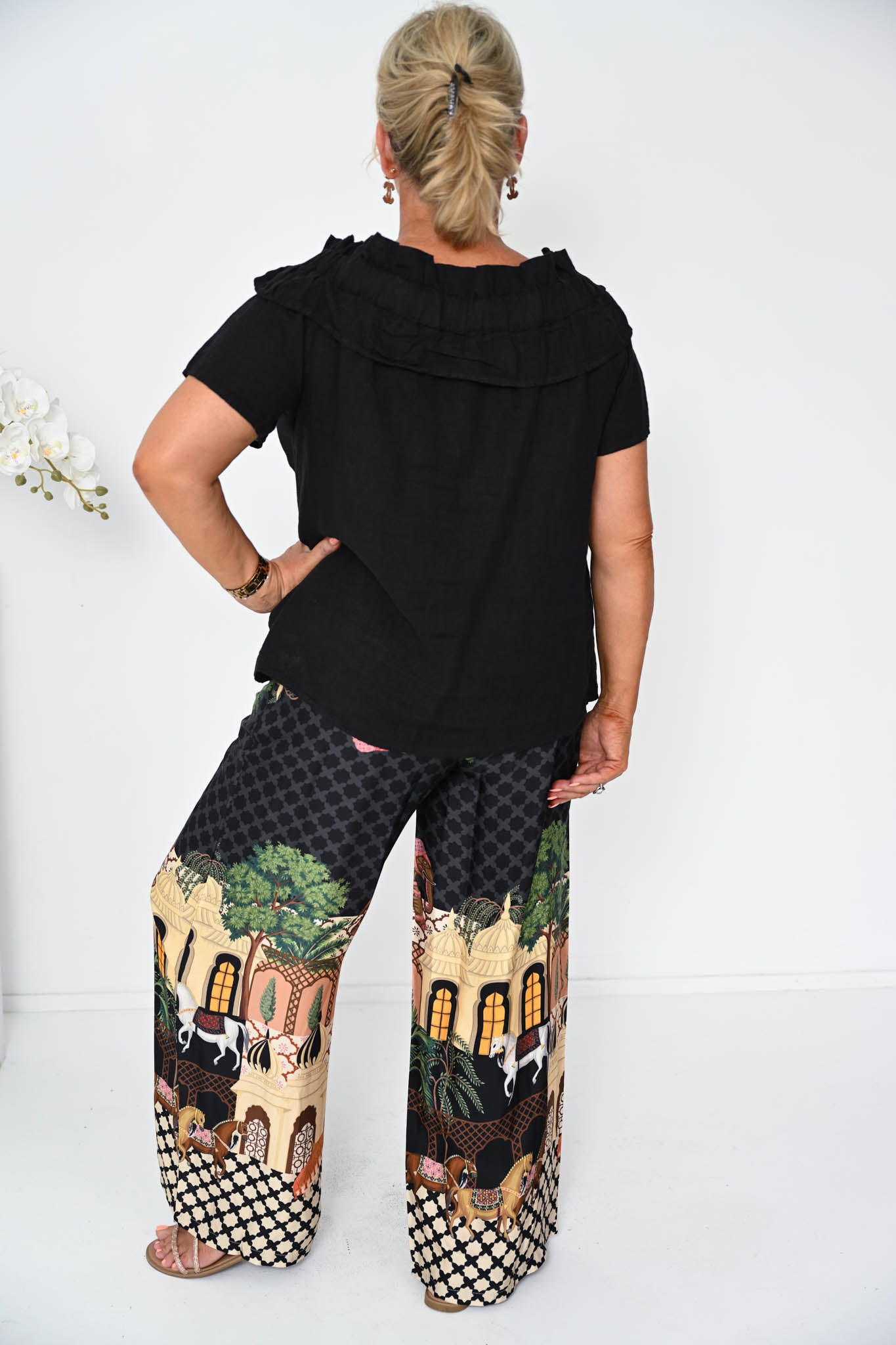 Cut in a relaxed, boxy shape with short sleeves, this design feels light and breathable while offering an effortlessly flattering drape. A softly gathered, elasticated frill frames the boat neckline, creating subtle texture and a gentle statement that highlights the neckline with graceful movement.