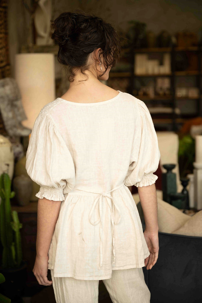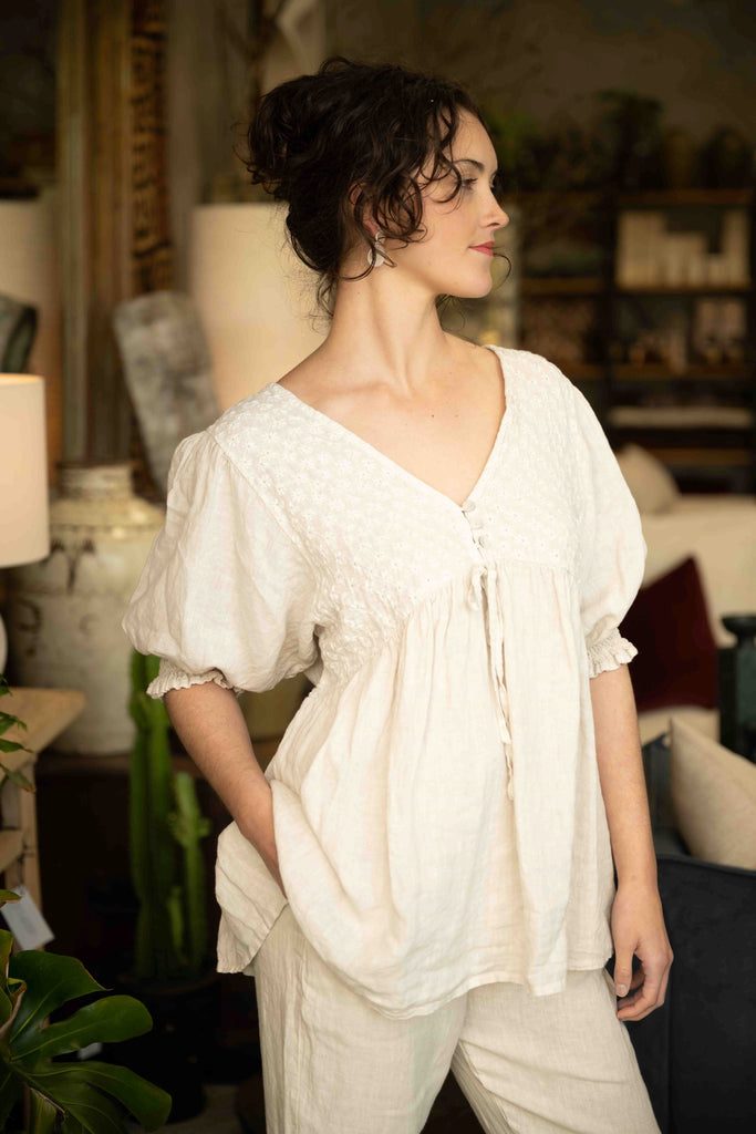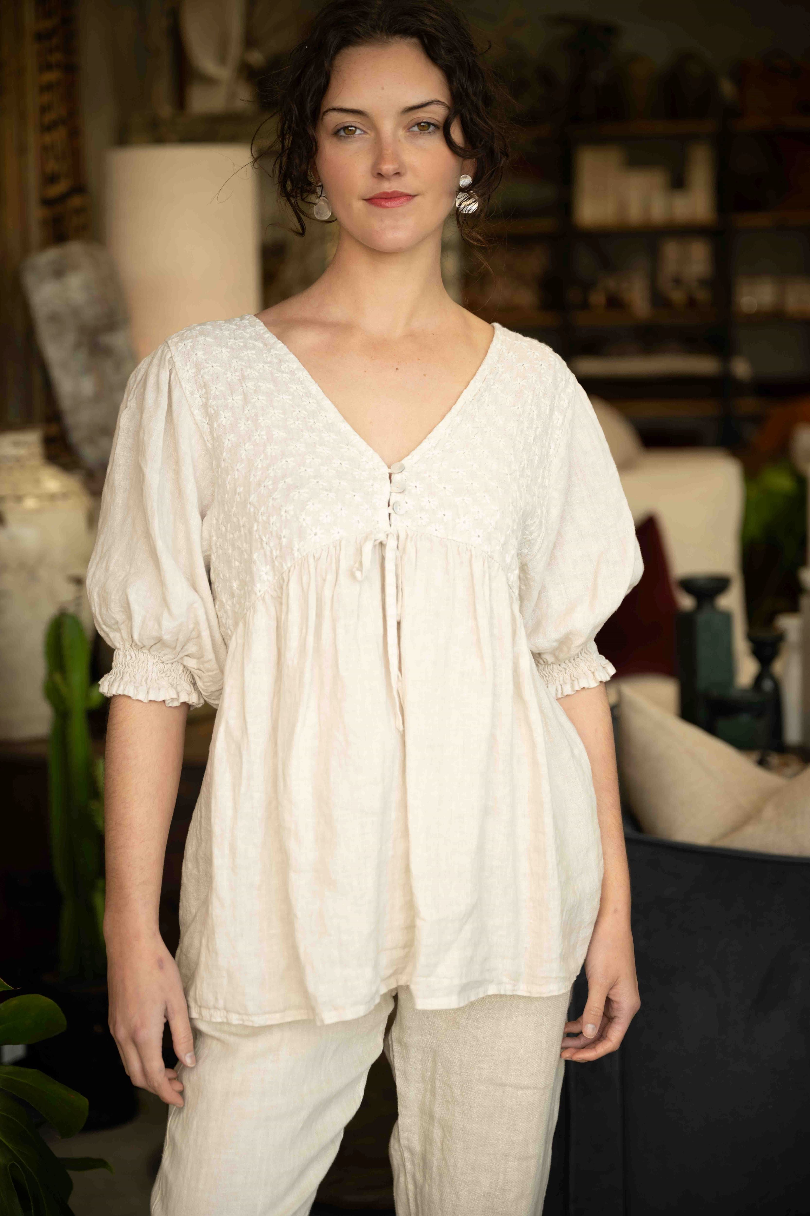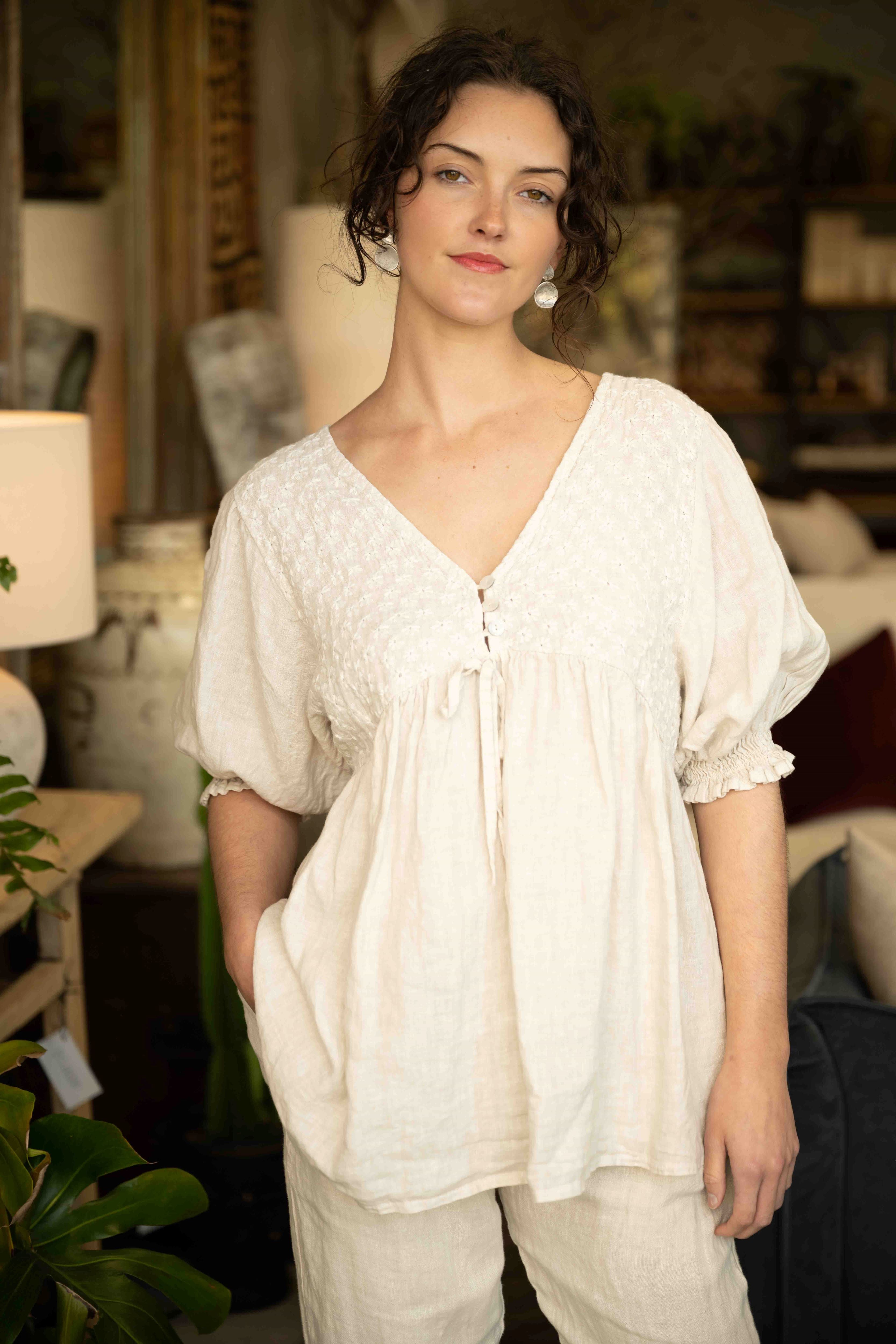 Effortlessly romantic and timelessly chic, the Bailey Top combines softness and structure together in perfect harmony. Crafted from breathable 100% linen in a soft beige tone, it features a flattering V-neckline that extends down to a trio of delicate pearl-coloured buttons at the chest. Under-bust ruching and a tie detail just below the buttons create gentle definition, while the stitched floral embroidery on the bust adds a handcrafted, feminine touch.