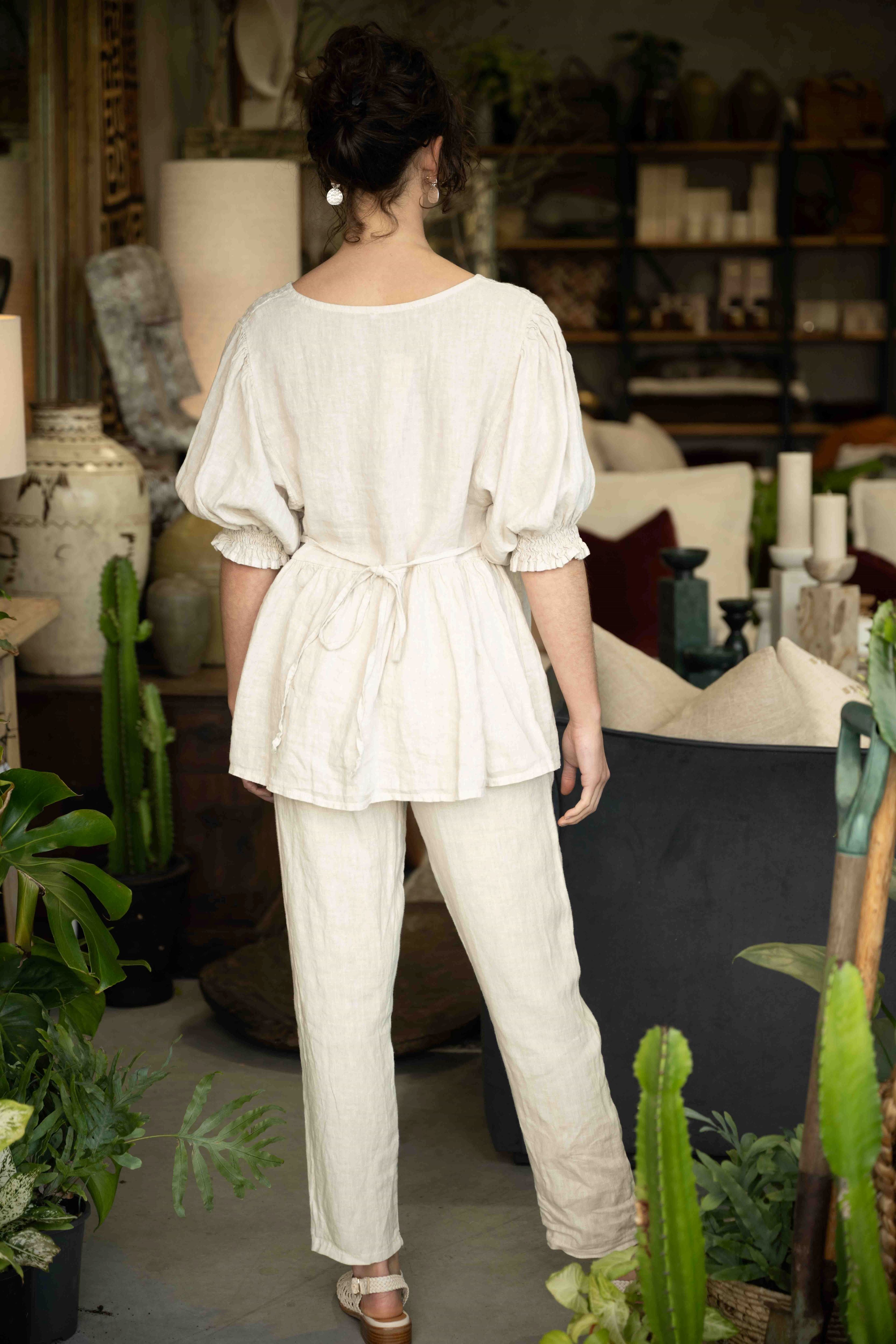 Puff sleeves finish just above the elbow with elasticated hems for a softly voluminous shape that feels both vintage-inspired and modern. The back is thoughtfully designed with adjustable ties and subtle ruching, allowing for a customizable fit that flatters a variety of body types. Whether styled with relaxed trousers, linen skirts, or casual denim, the Bailey Top is a versatile piece you'll reach for all year round.