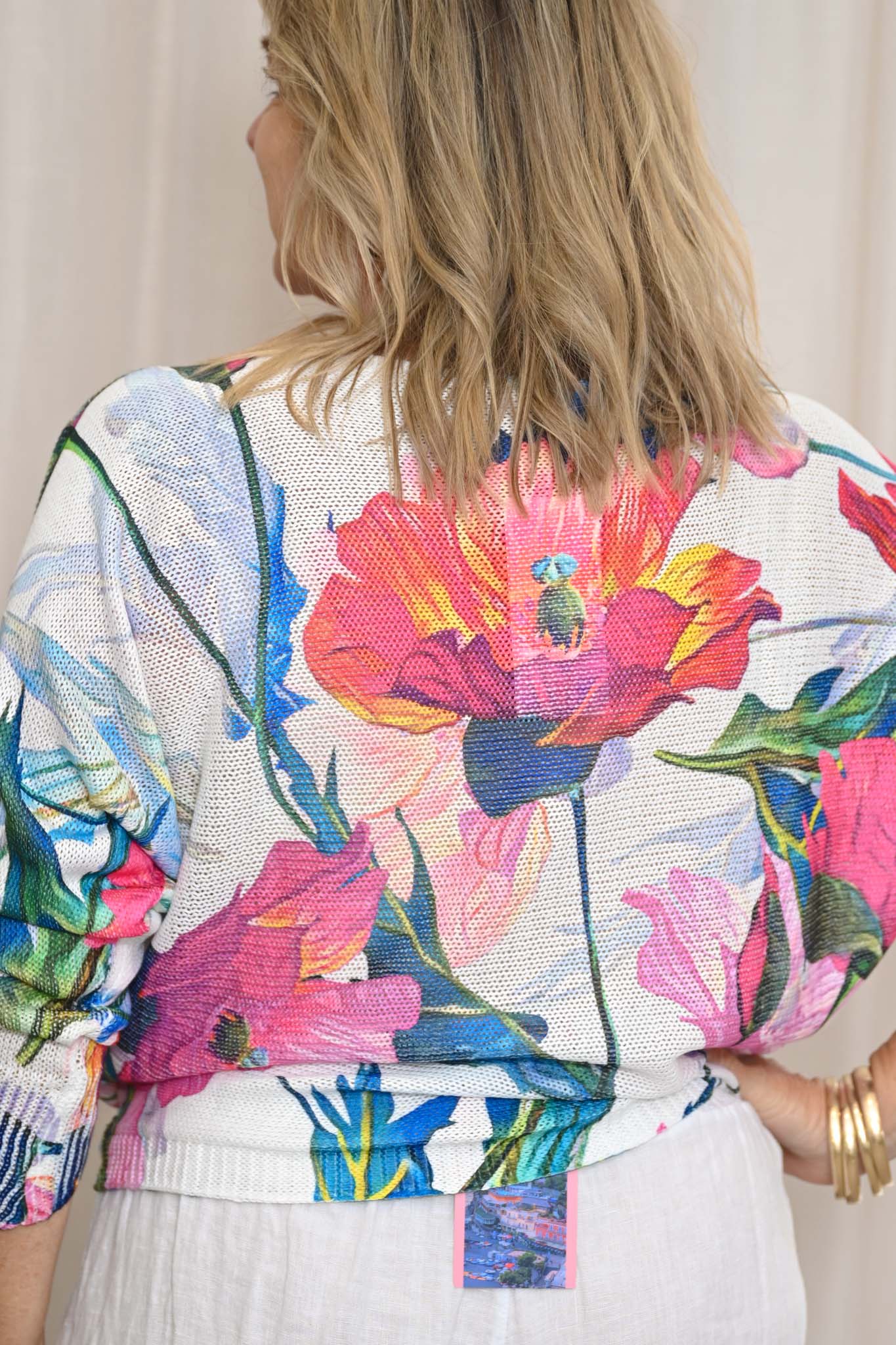 Fresh, feminine, and effortlessly eye-catching, the Bella Rosie Knit is a standout new piece designed to elevate relaxed styling. Set against a crisp white background, the vibrant pink and blue floral design brings a playful yet refined energy to this lightweight knit, creating a beautiful balance of softness and statement appeal.