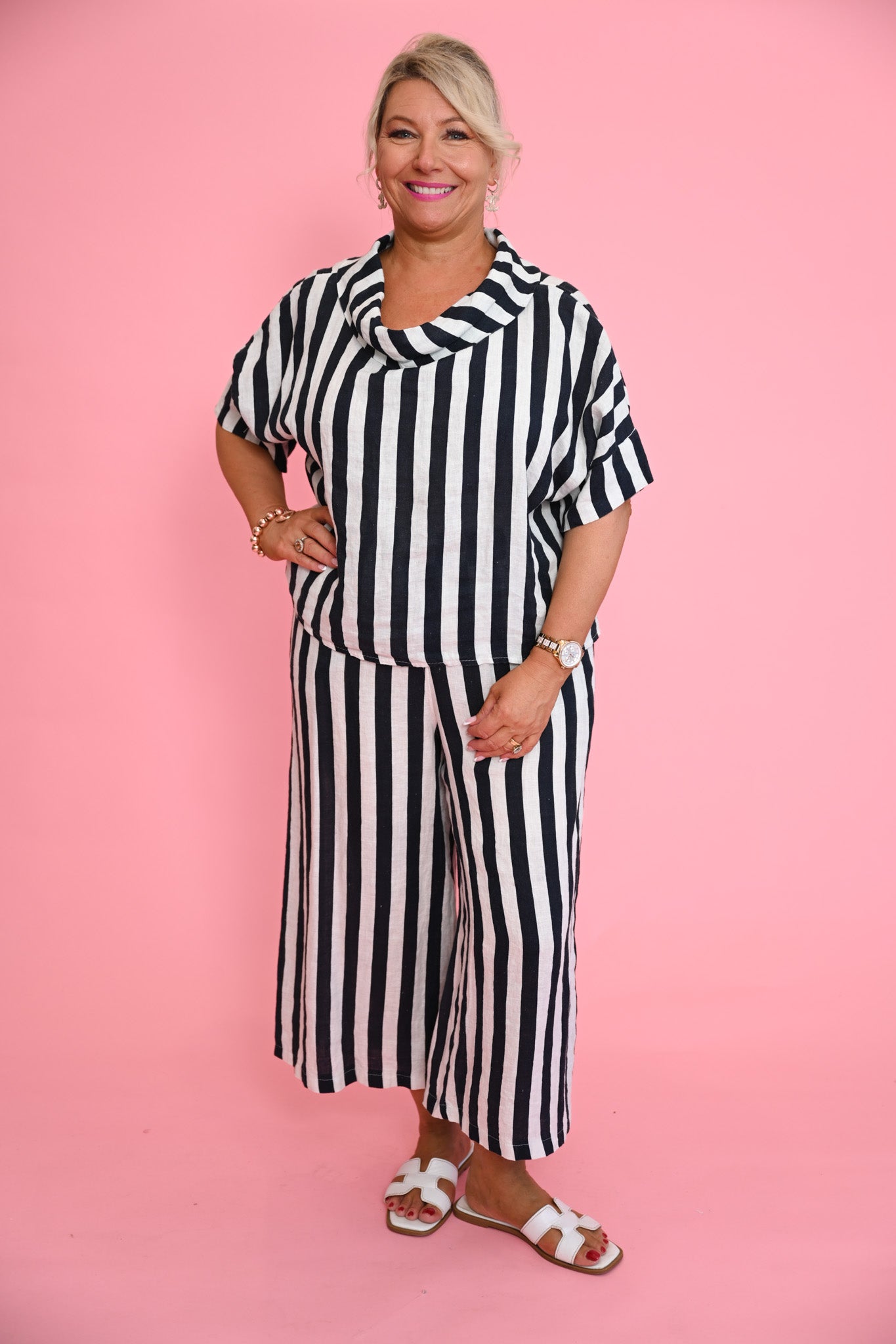 Elevate your wardrobe with the Bobbi Top in Navy, a bold yet refined take on a classic linen design. Crafted from lightweight, breathable linen, it features striking wide vertical stripes in crisp white and deep navy, creating a clean, modern look. The high cowl neckline drapes elegantly at the front, while the split-back design resembles a collar, adding a subtle, architectural detail to the silhouette.