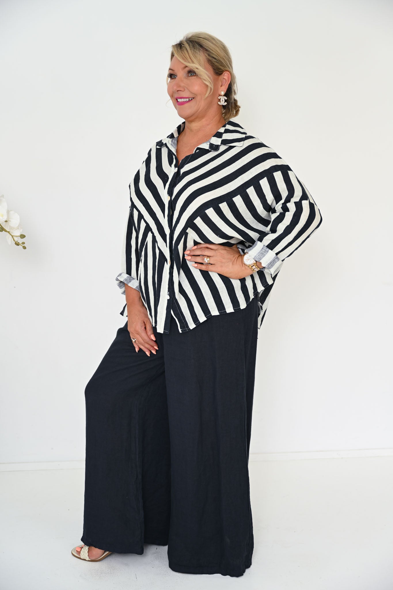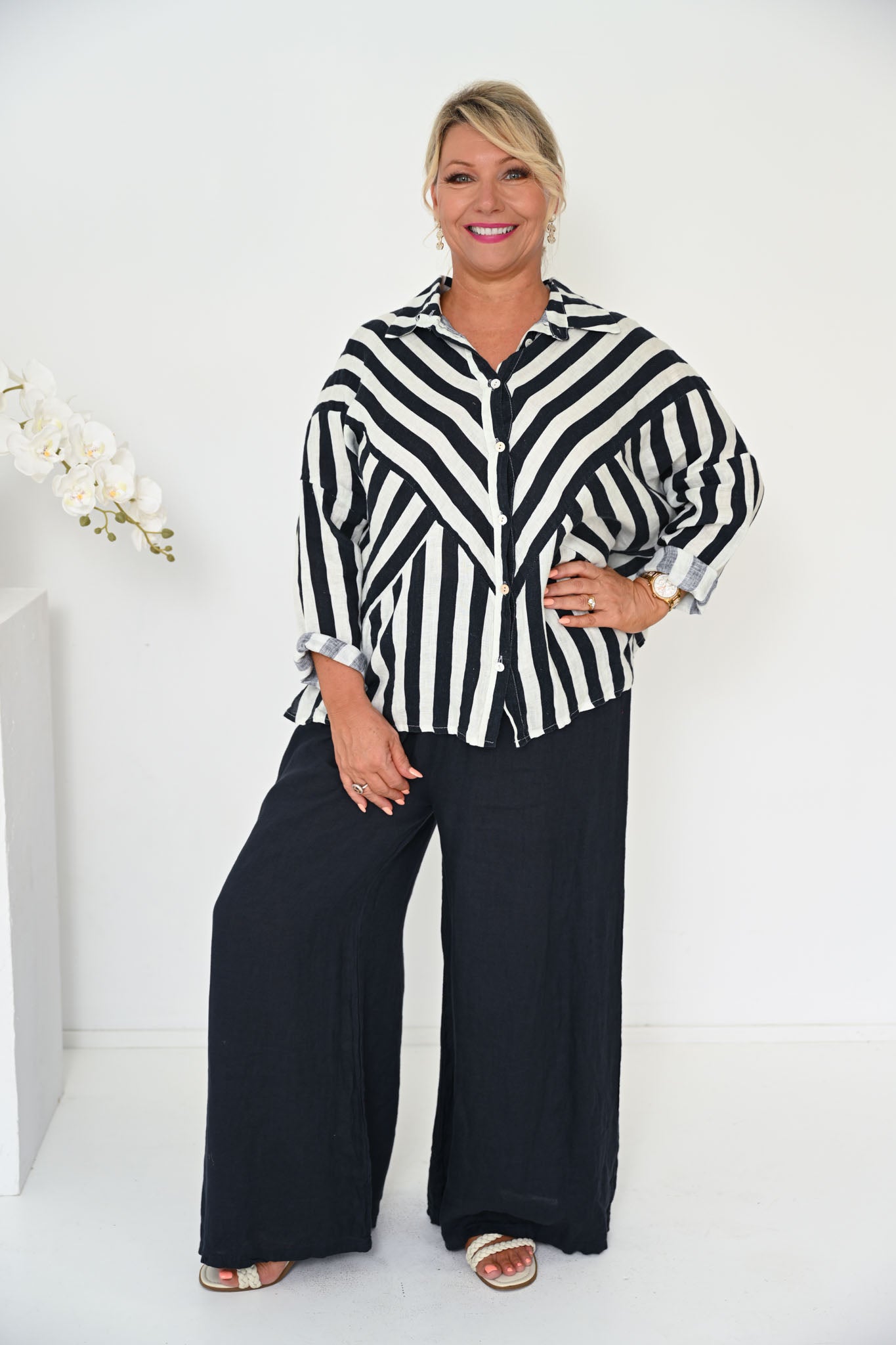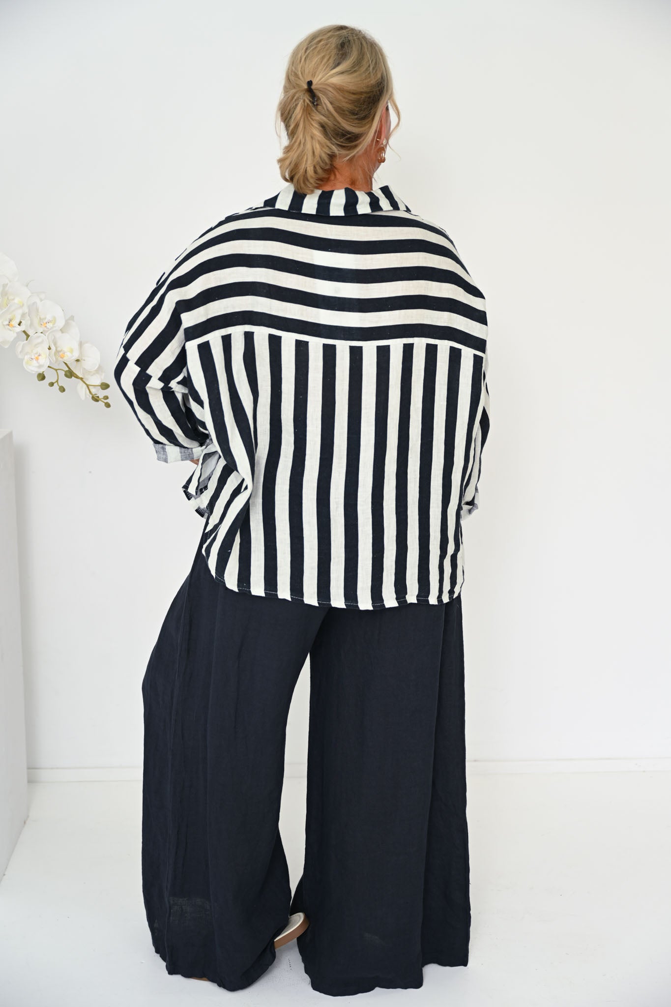 Timeless, versatile, and thoughtfully detailed, the Bridget Shirt in Navy and White brings a refined simplicity to any wardrobe.