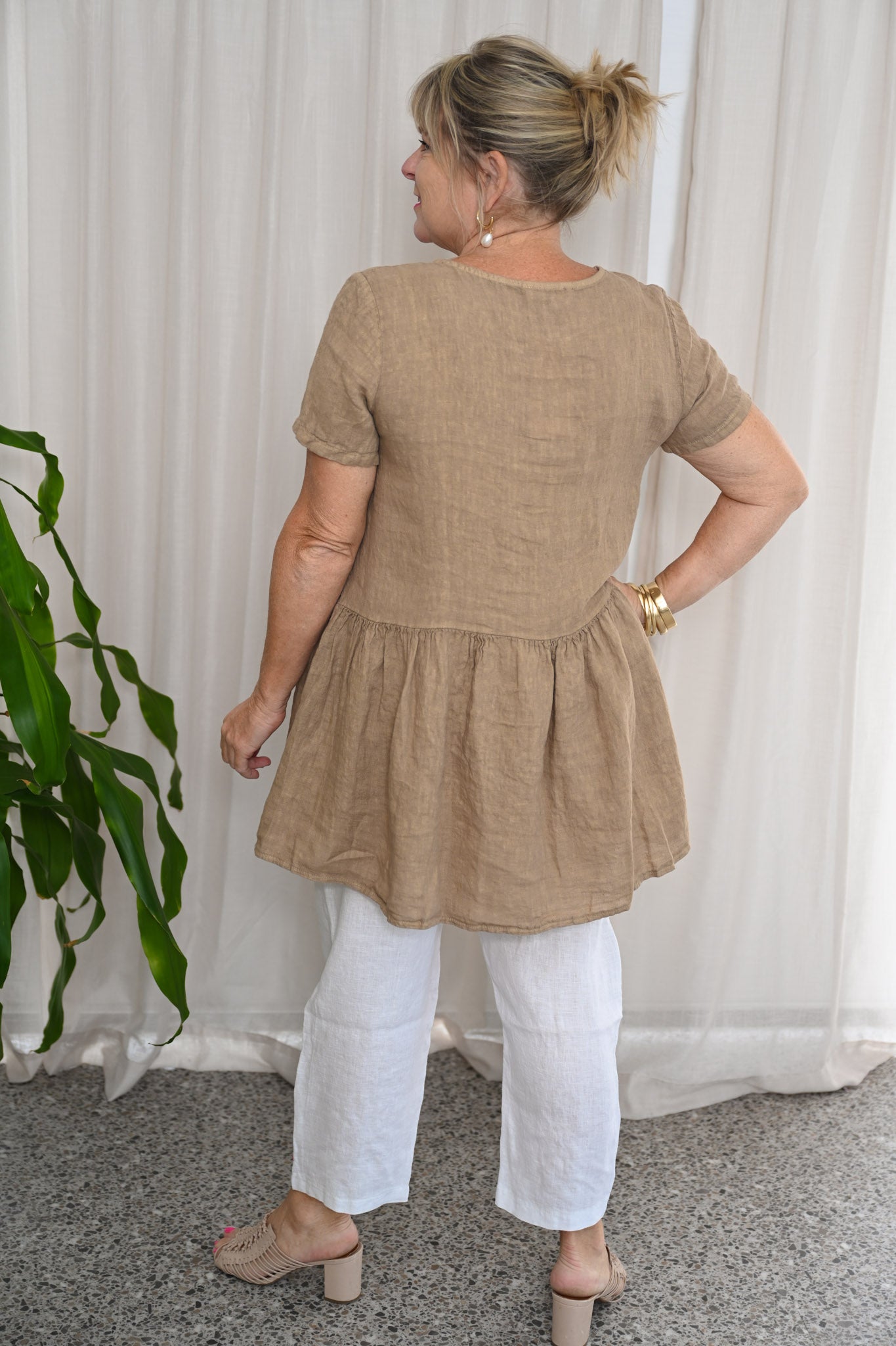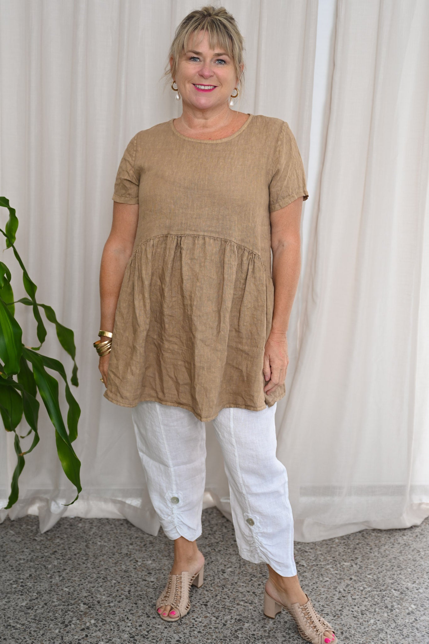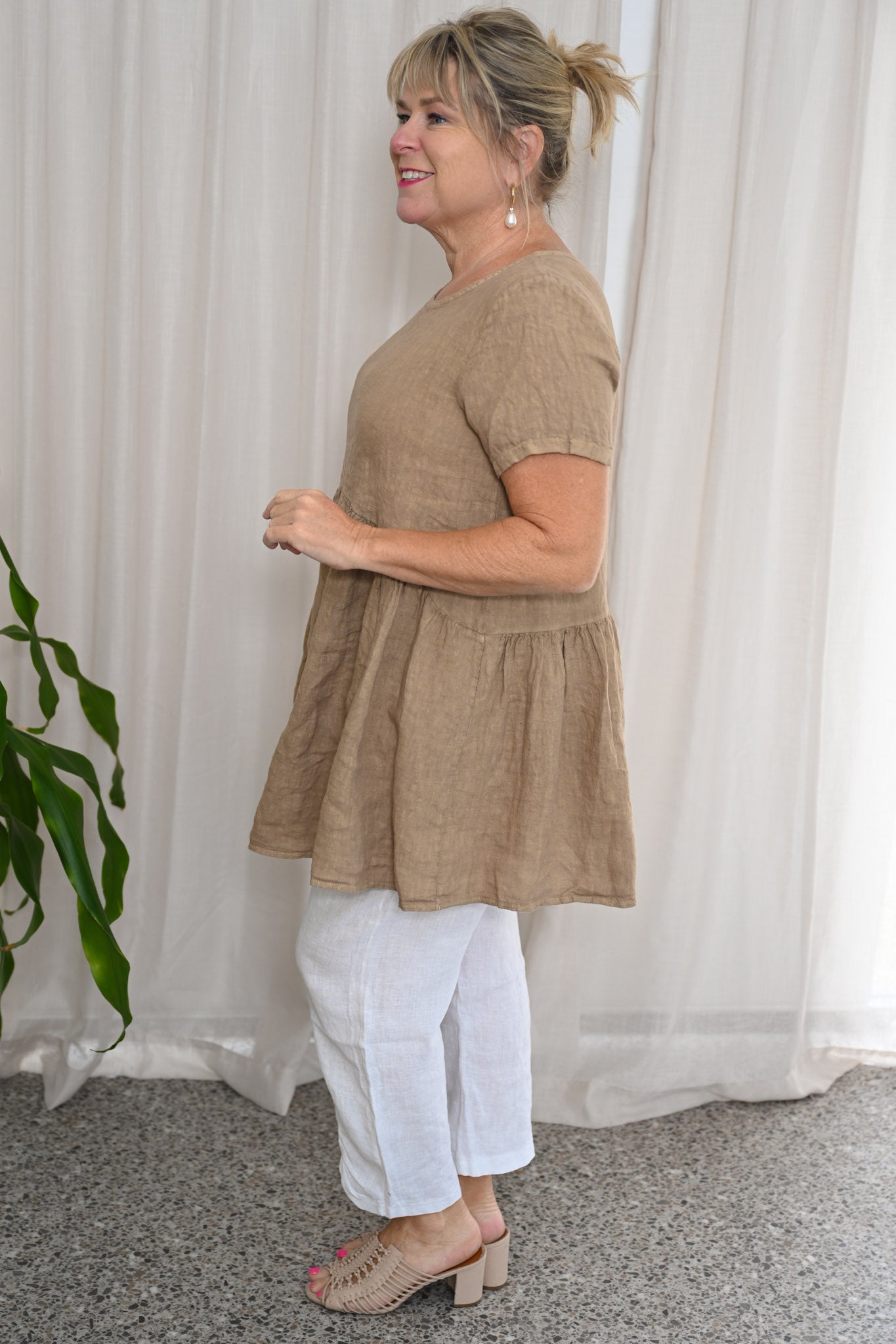 The Calypso Dress in warm Caramel is a lightweight linen piece with an easy, sun-ready feel. Its soft babydoll silhouette falls gently from a curved bodice panel just below the bust, creating a relaxed shape that flatters without clinging. The round neckline keeps the look simple and clean, while the short hemline adds a playful, summery touch.