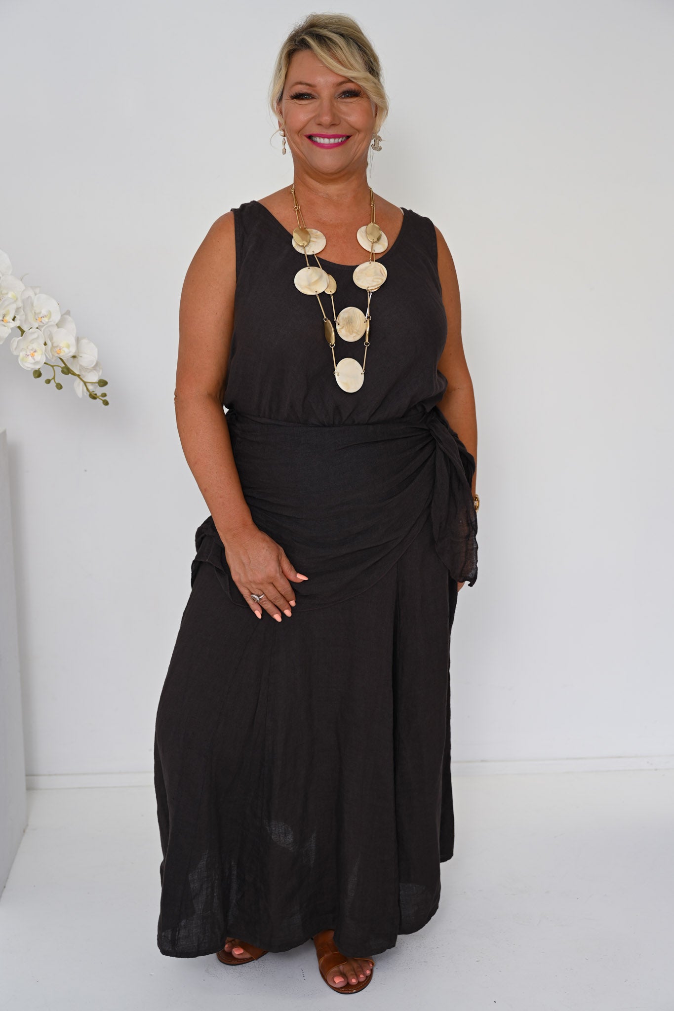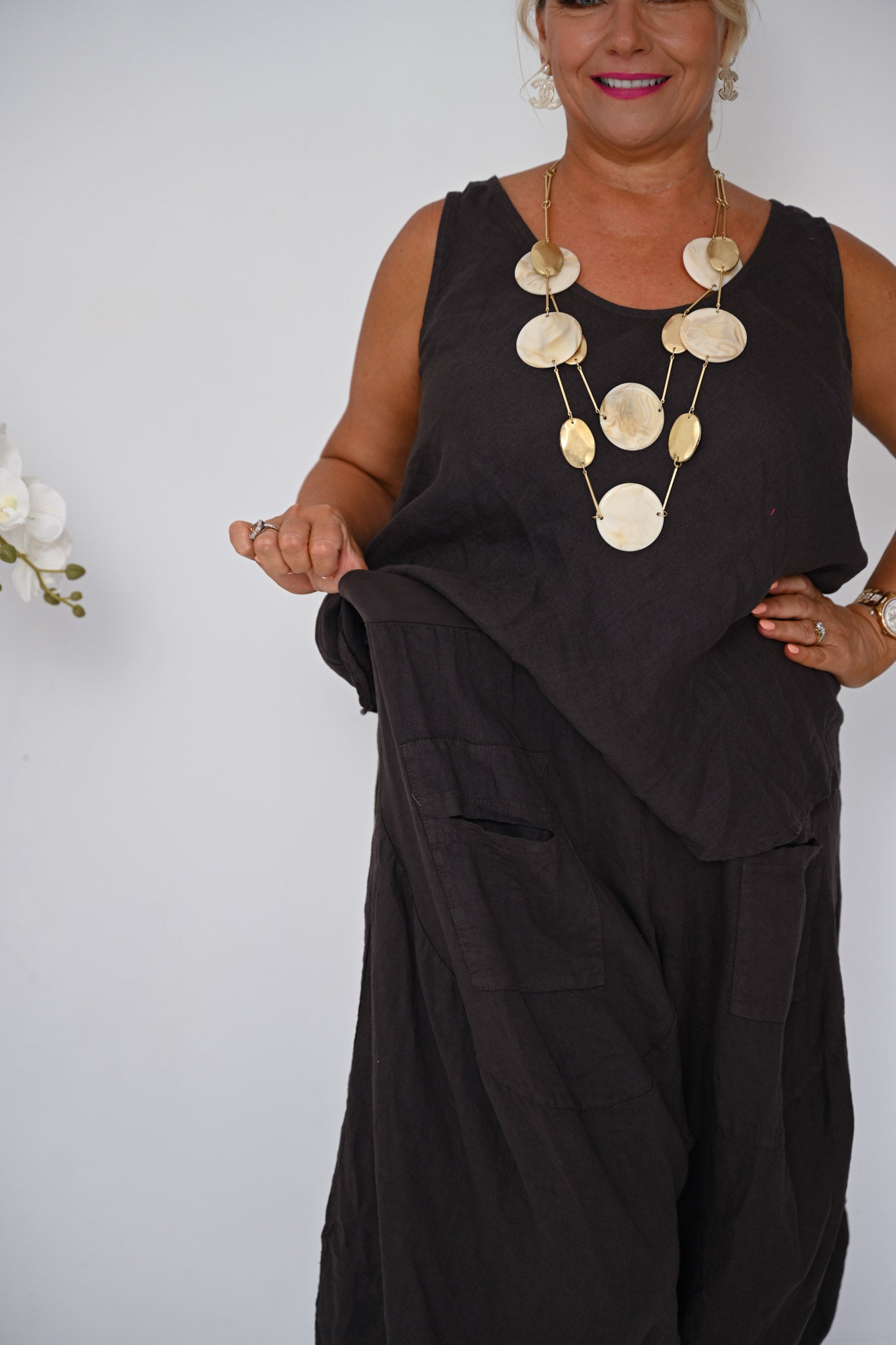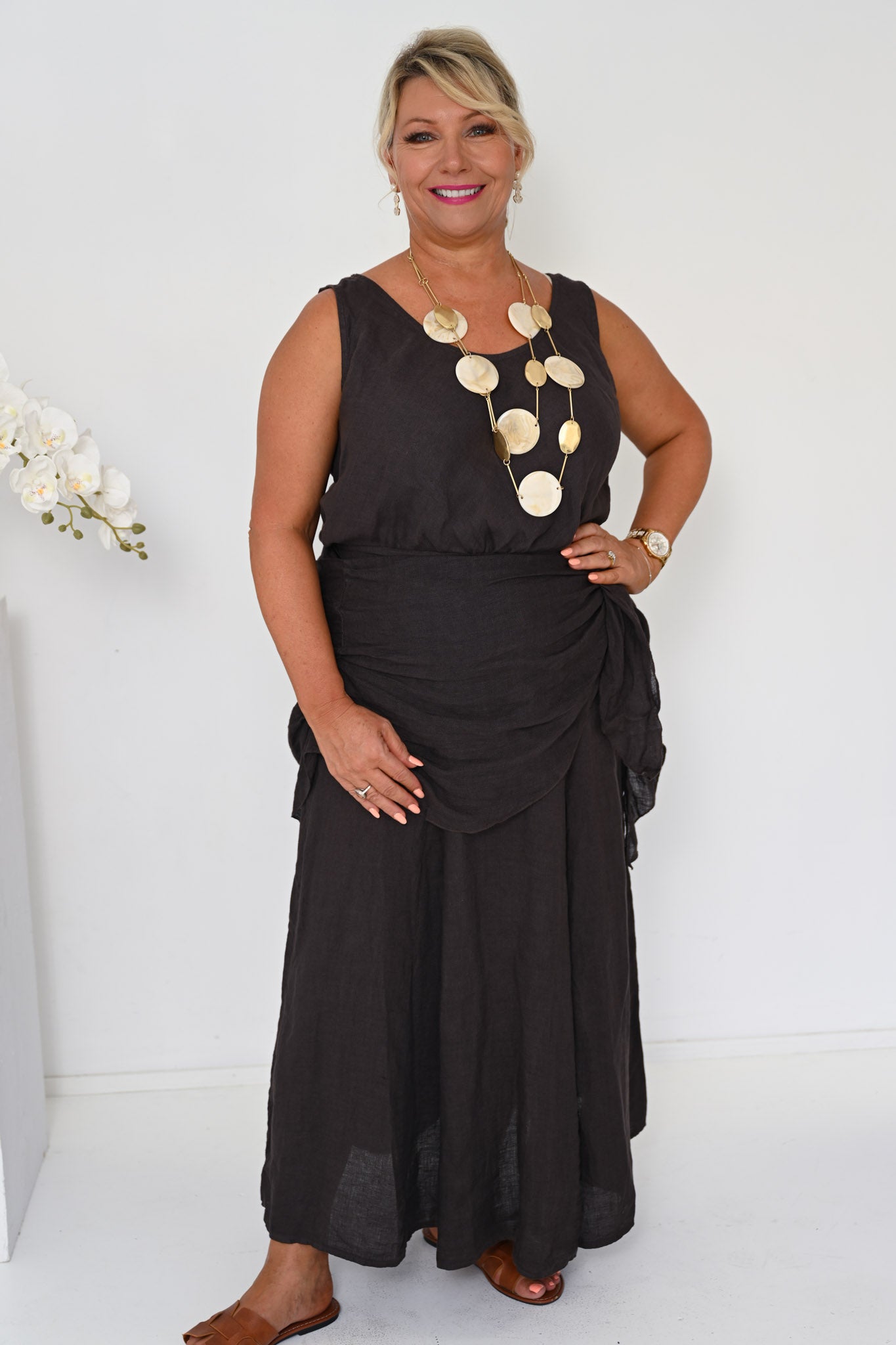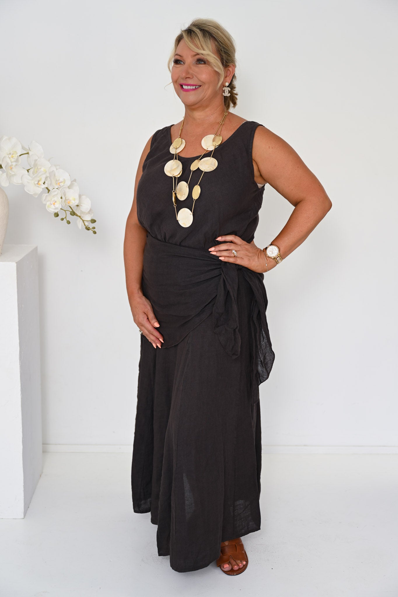 Refined yet effortless, the Linen Camio in Cocco delivers timeless appeal through its rich colour and relaxed elegance, proving that strong neutrals can be both versatile and enduring.