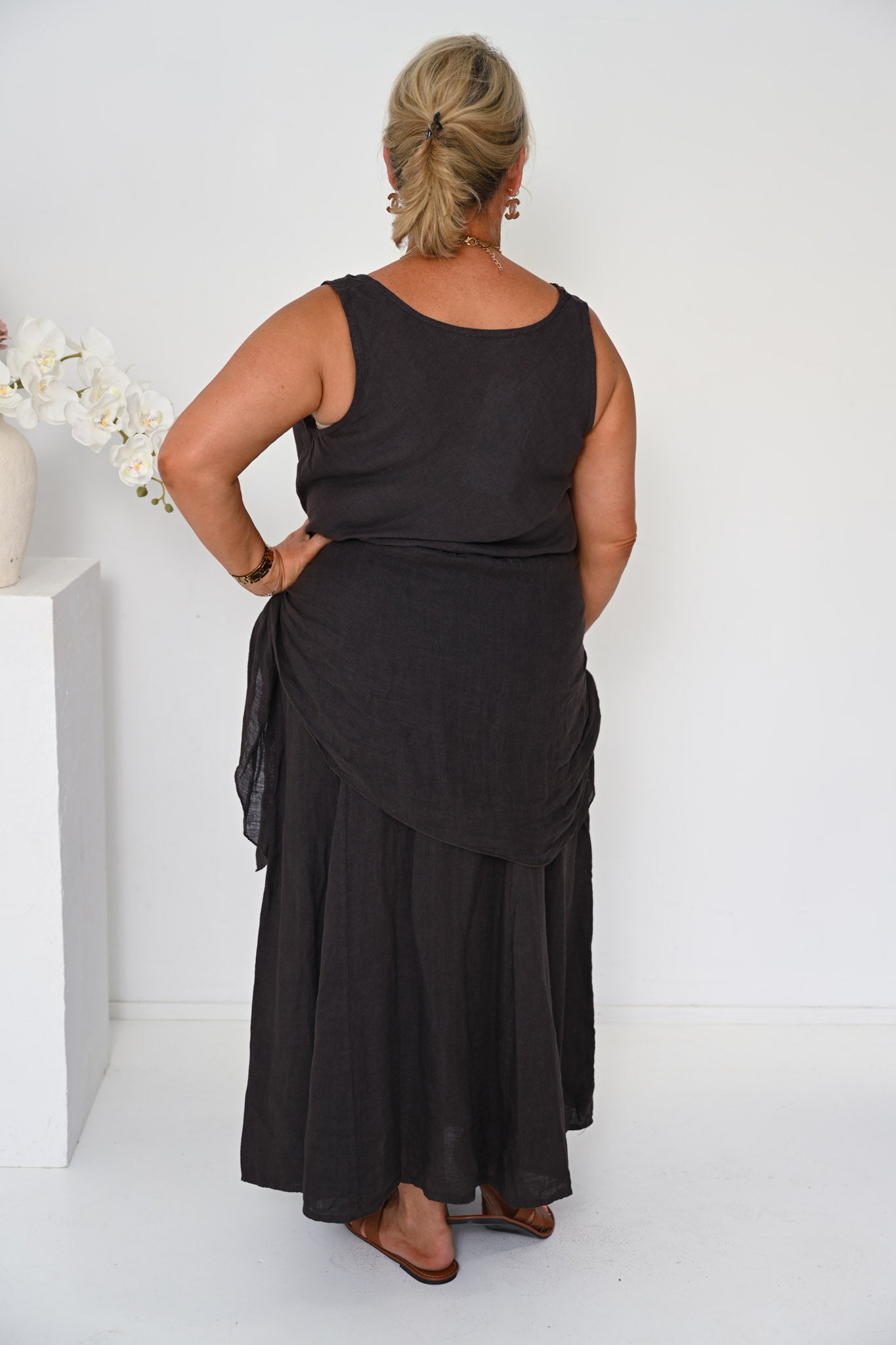 Introduce rich, grounded tone with our Linen Camio in Cocco — a deep chocolate brown essential that brings warmth and quiet sophistication to any wardrobe. This versatile piece transitions seamlessly across seasons, working just as beautifully styled on its own as it does layered into more dimensional looks.