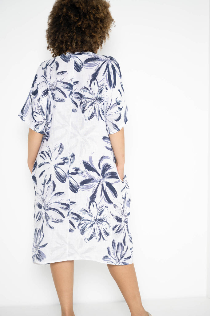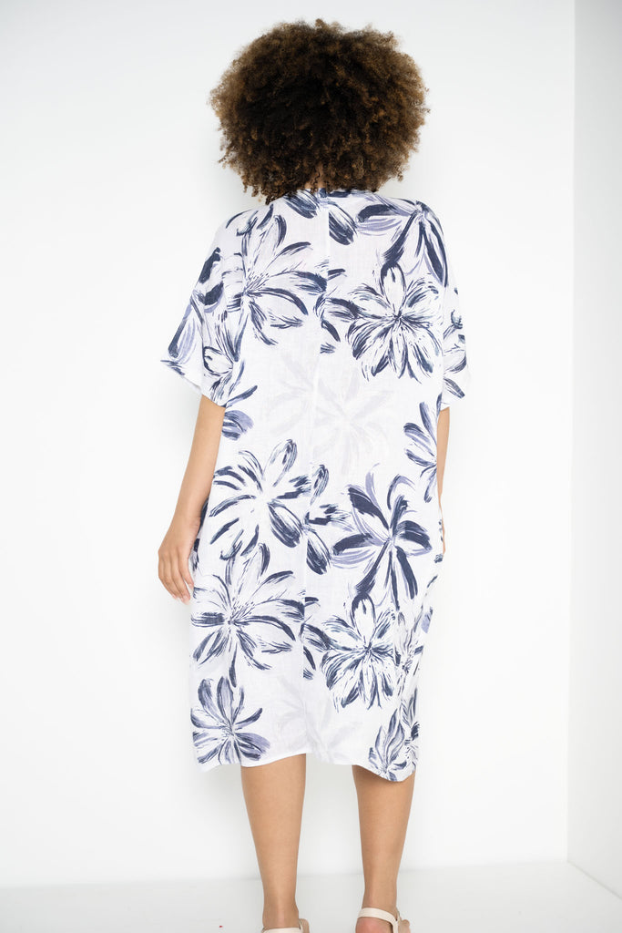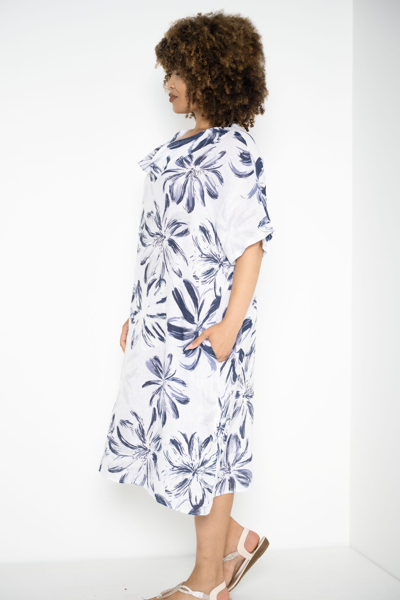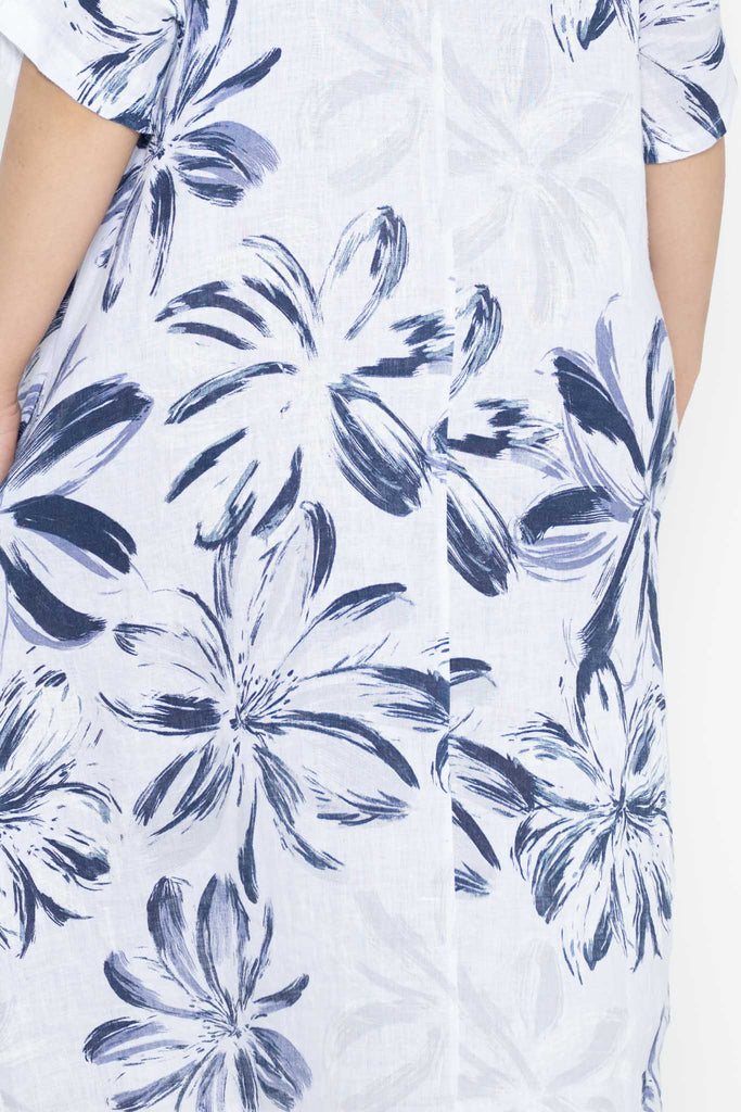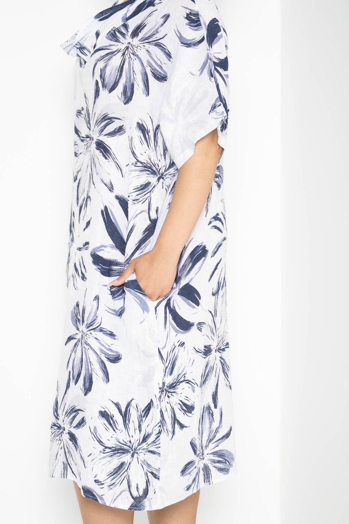 Crafted in a breathable fabric adorned with an all-over navy floral pattern on a crisp white base, it feels both fresh and refined. Practical side pockets add to its laid-back charm, making it as functional as it is flattering.