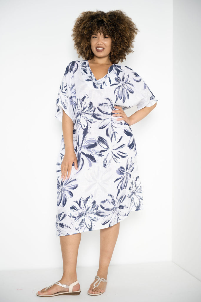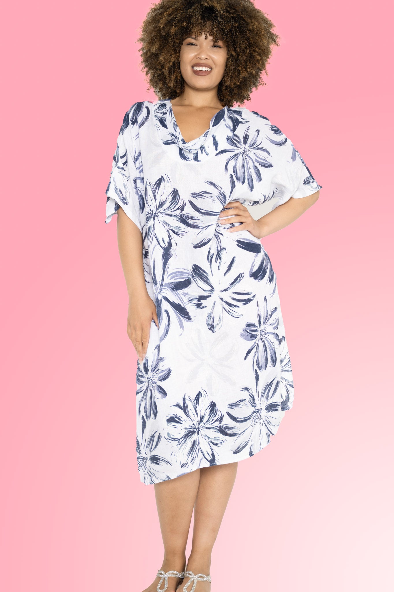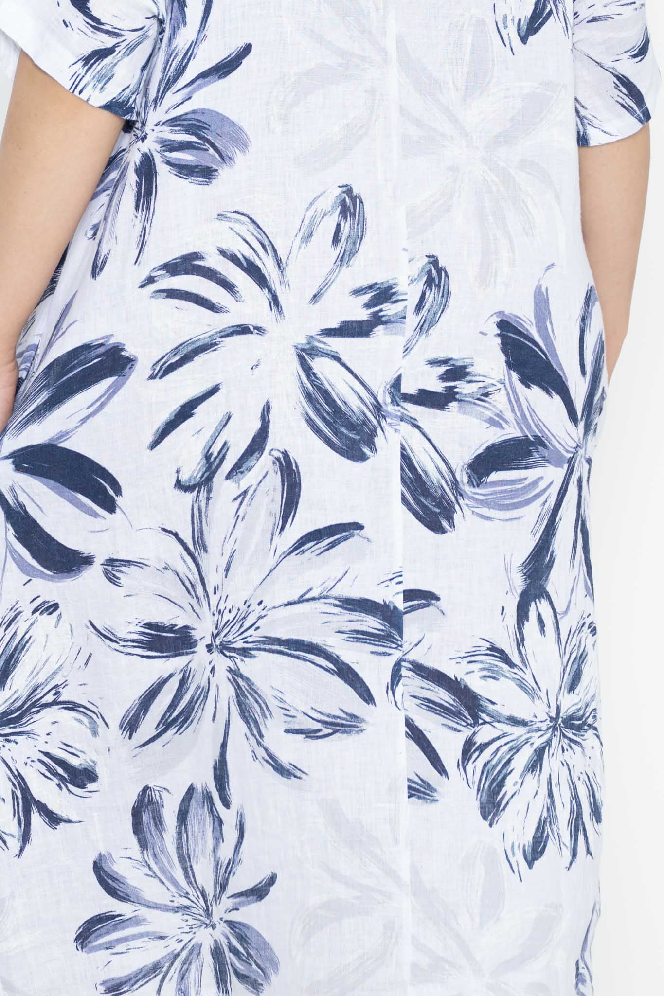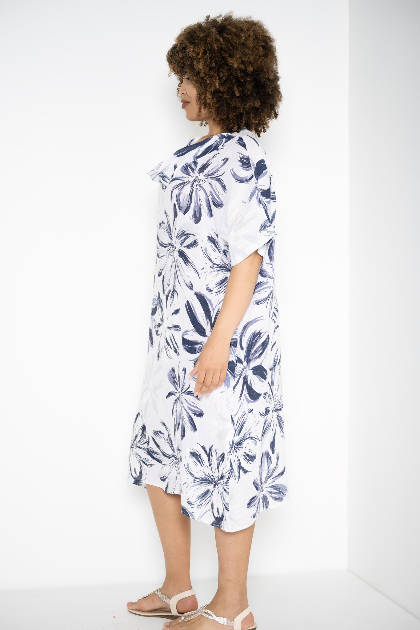 Crafted in a breathable fabric adorned with an all-over navy floral pattern on a crisp white base, it feels both fresh and refined. Practical side pockets add to its laid-back charm, making it as functional as it is flattering.