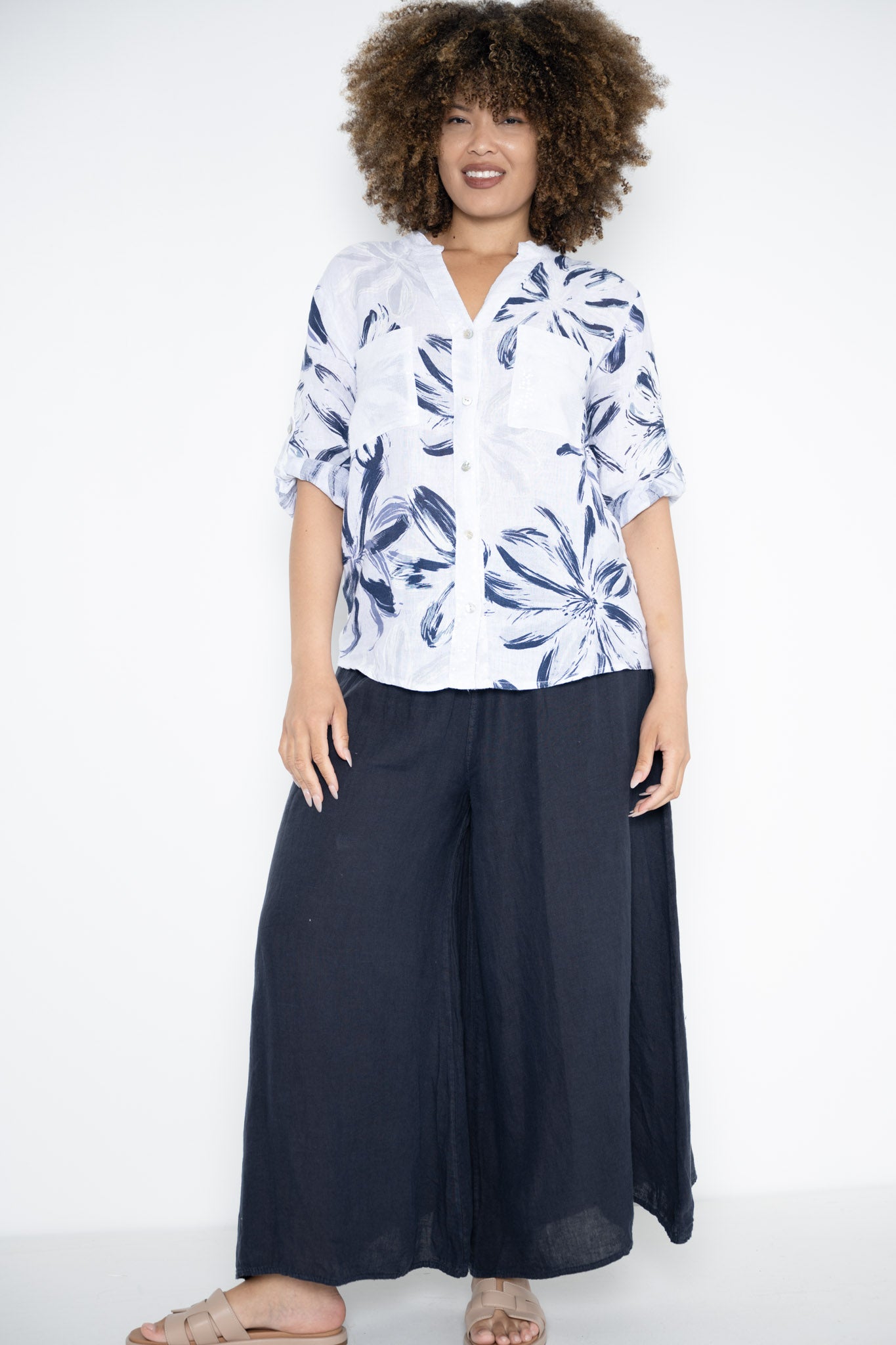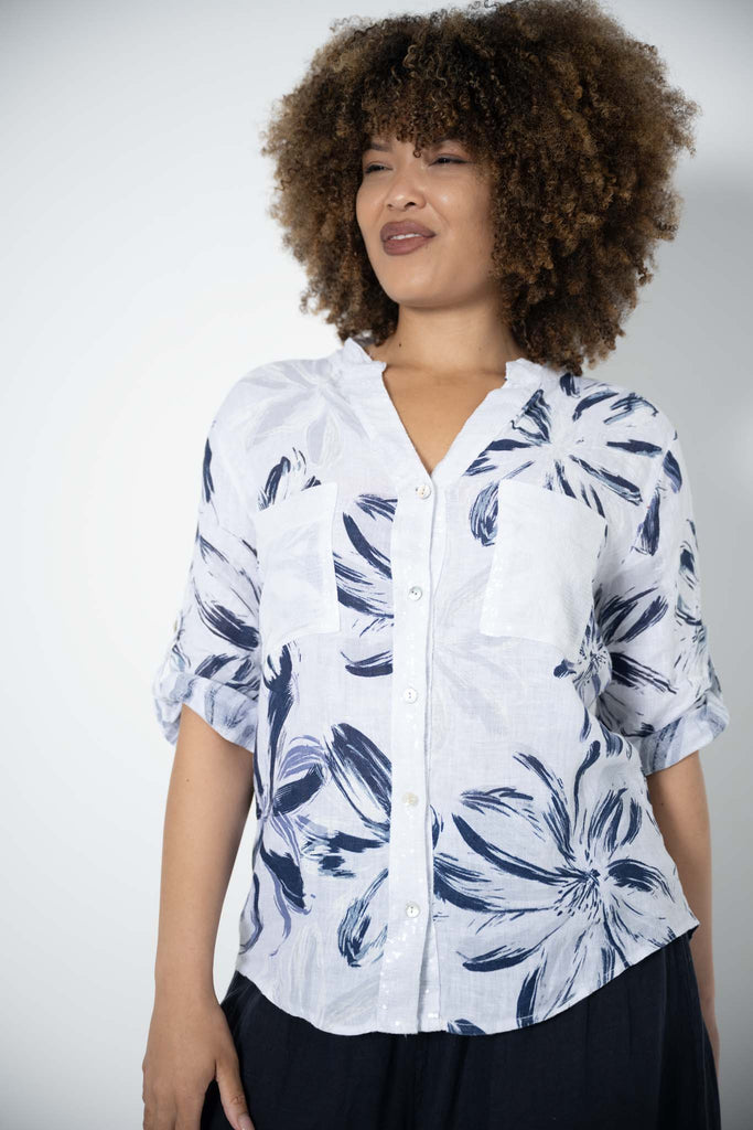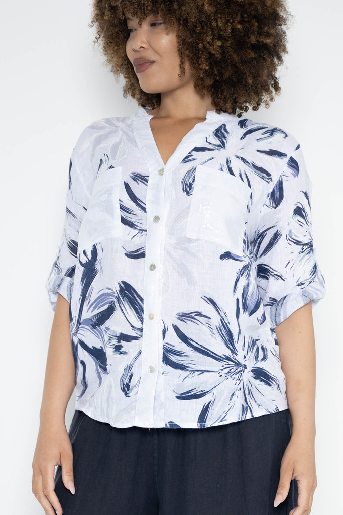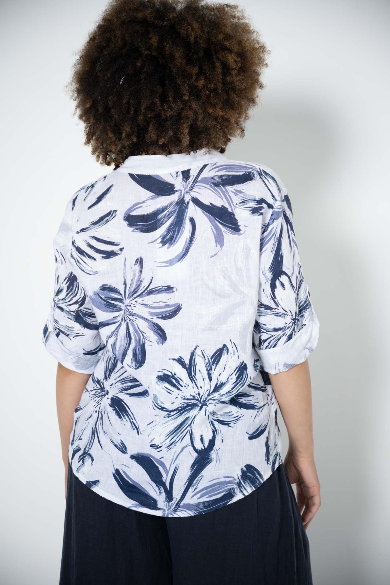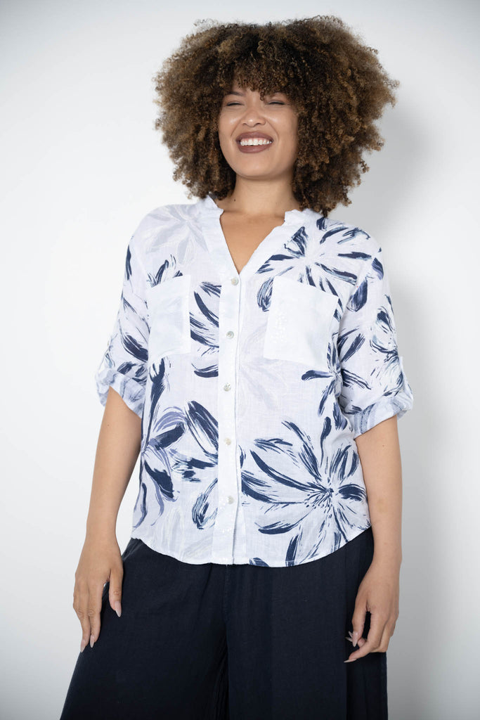 The Celon Shirt is a graceful blend of casual charm and refined detail. Its crisp white fabric is adorned with a navy blue floral pattern that flows across the shirt like ink on parchment, giving it a timeless yet modern appeal. Light and breathable, it’s designed to feel as effortless as it looks.