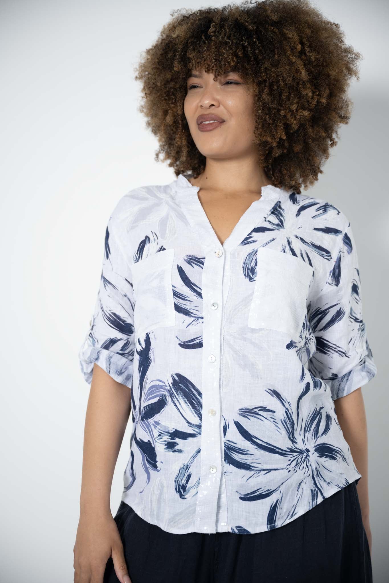 Sleeves are casually folded and secured with a button tab, adding a relaxed, rolled-up elegance perfect for warmer days or laid-back evenings. Sequin trim traces the neckline, the front button placket, and the two breast pockets, catching the light with a subtle shimmer that adds just the right touch of sparkle—never too much, always just enough.