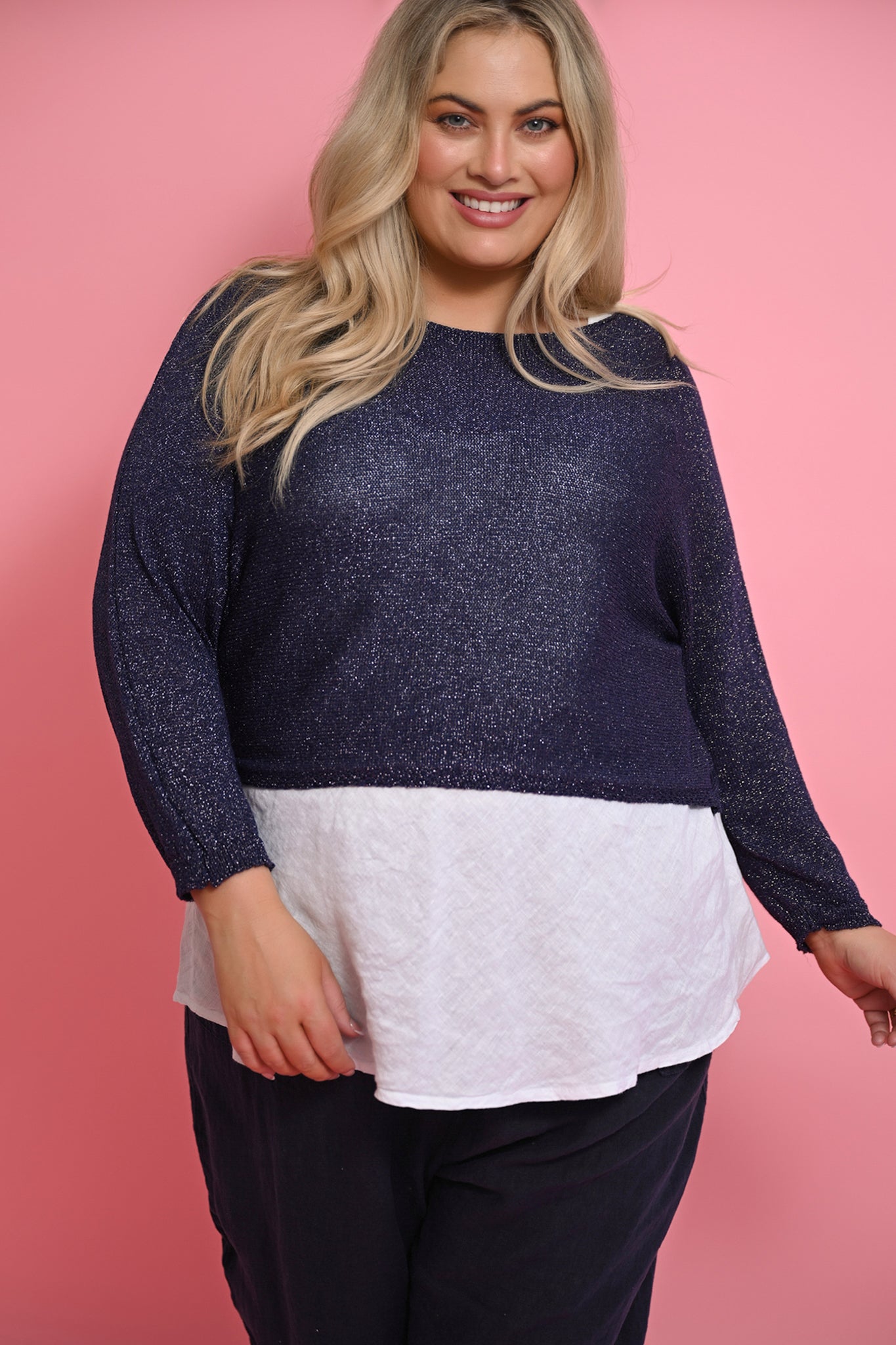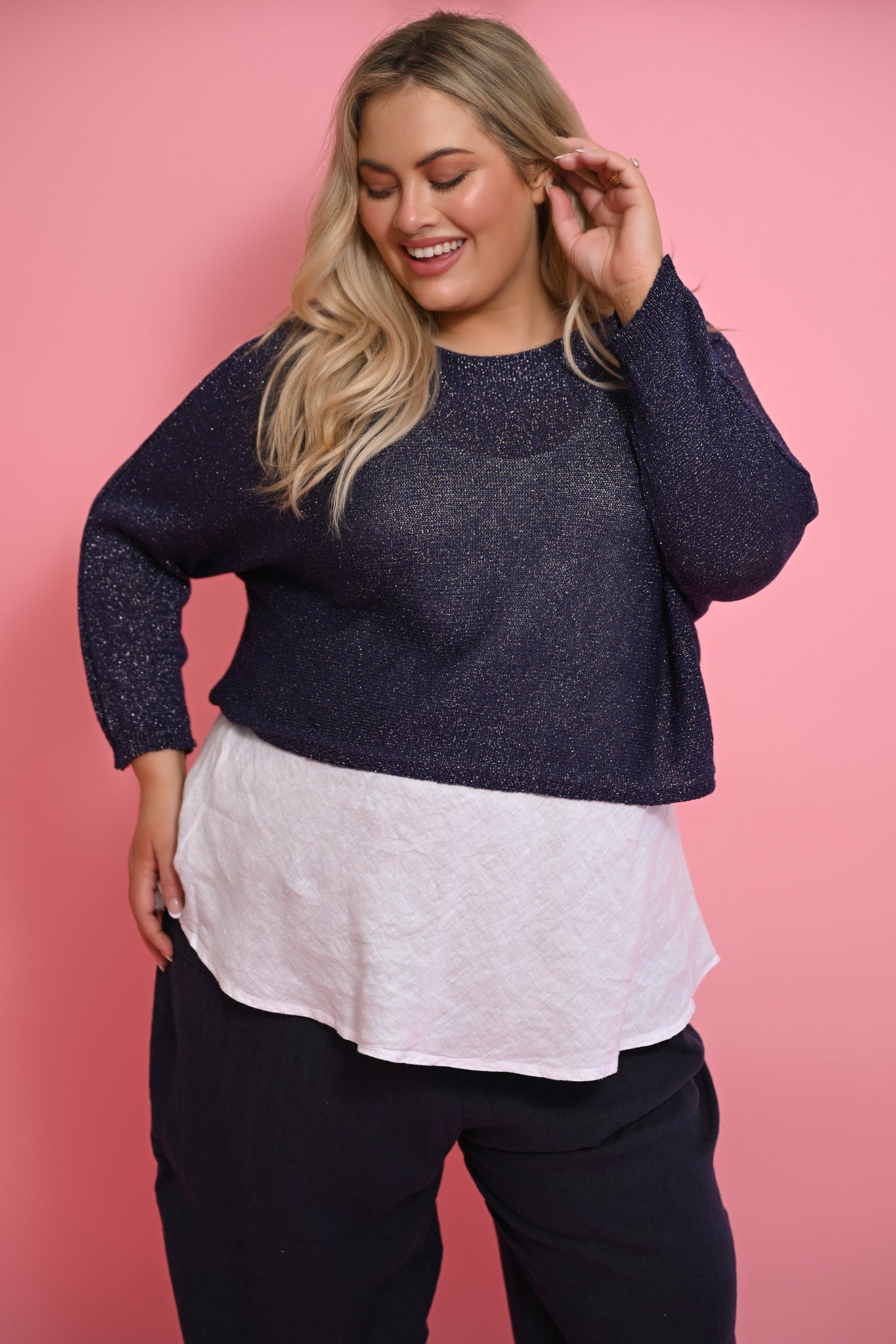 Subtle lurex threads woven into the rich navy knit catch the light with a soft shimmer, reminiscent of starlight glinting over midnight waters. This understated sparkle adds a sense of quiet sophistication, elevating the piece from everyday casual to effortlessly chic for both day and evening wear.