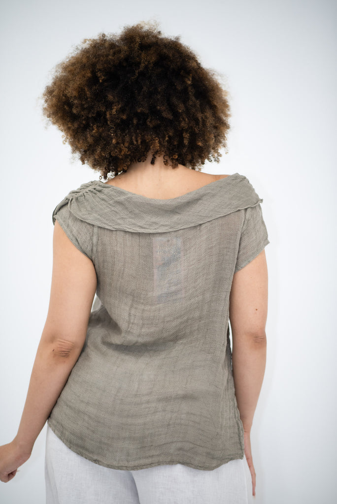 The silhouette is relaxed and softly structured, with a boat neckline that skims the collarbone and short, capped sleeves that offer just the right amount of coverage. A gently curved hem falls longer at the back, creating subtle movement and ease.