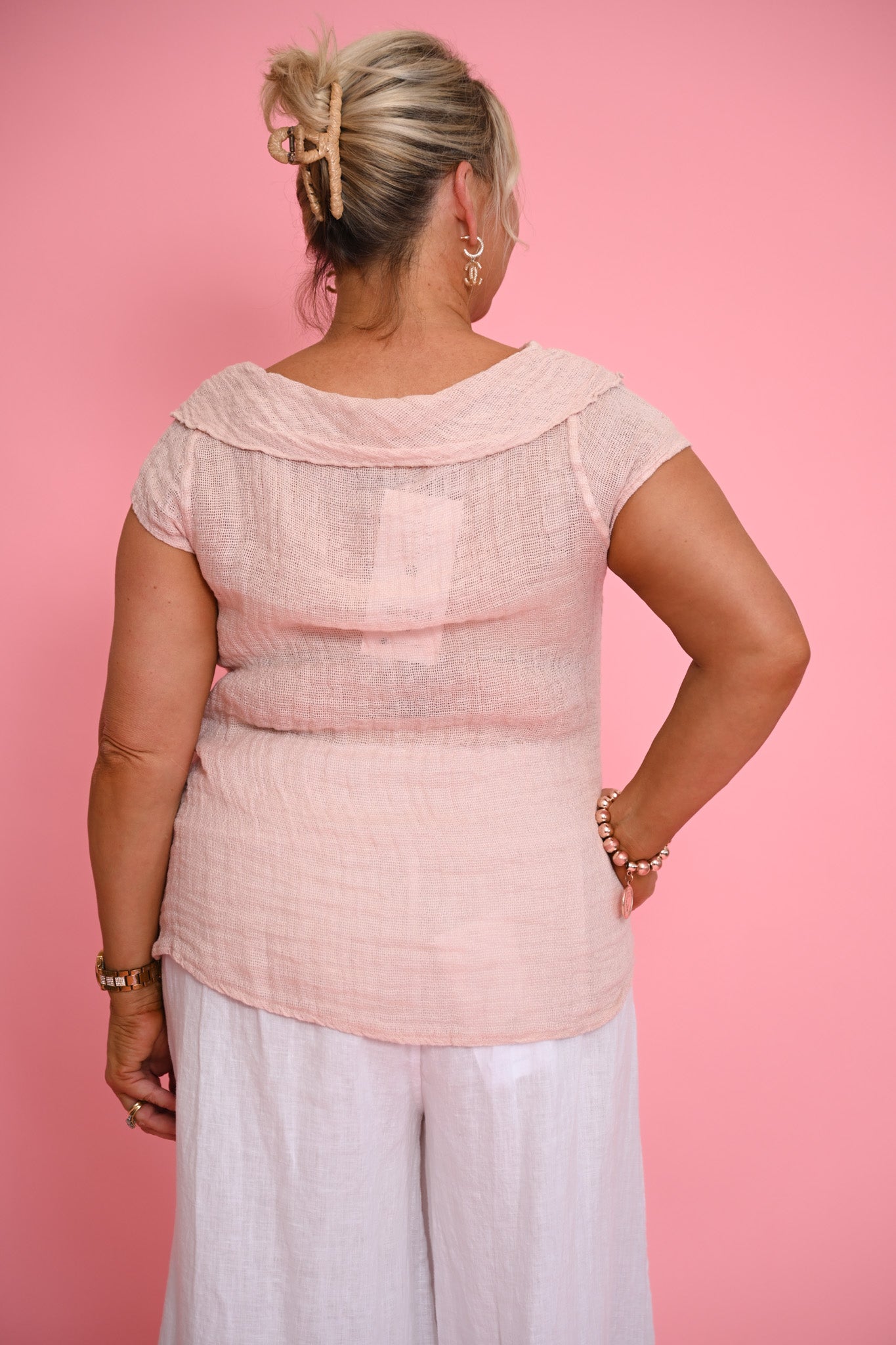 Lightweight and beautifully understated, the Coco Top in pink brings a soft wash of colour to any wardrobe. Made in Italy from an airy, loose-weave linen, it offers a breathable, barely-there feel that’s perfect for warm weather and relaxed layering.