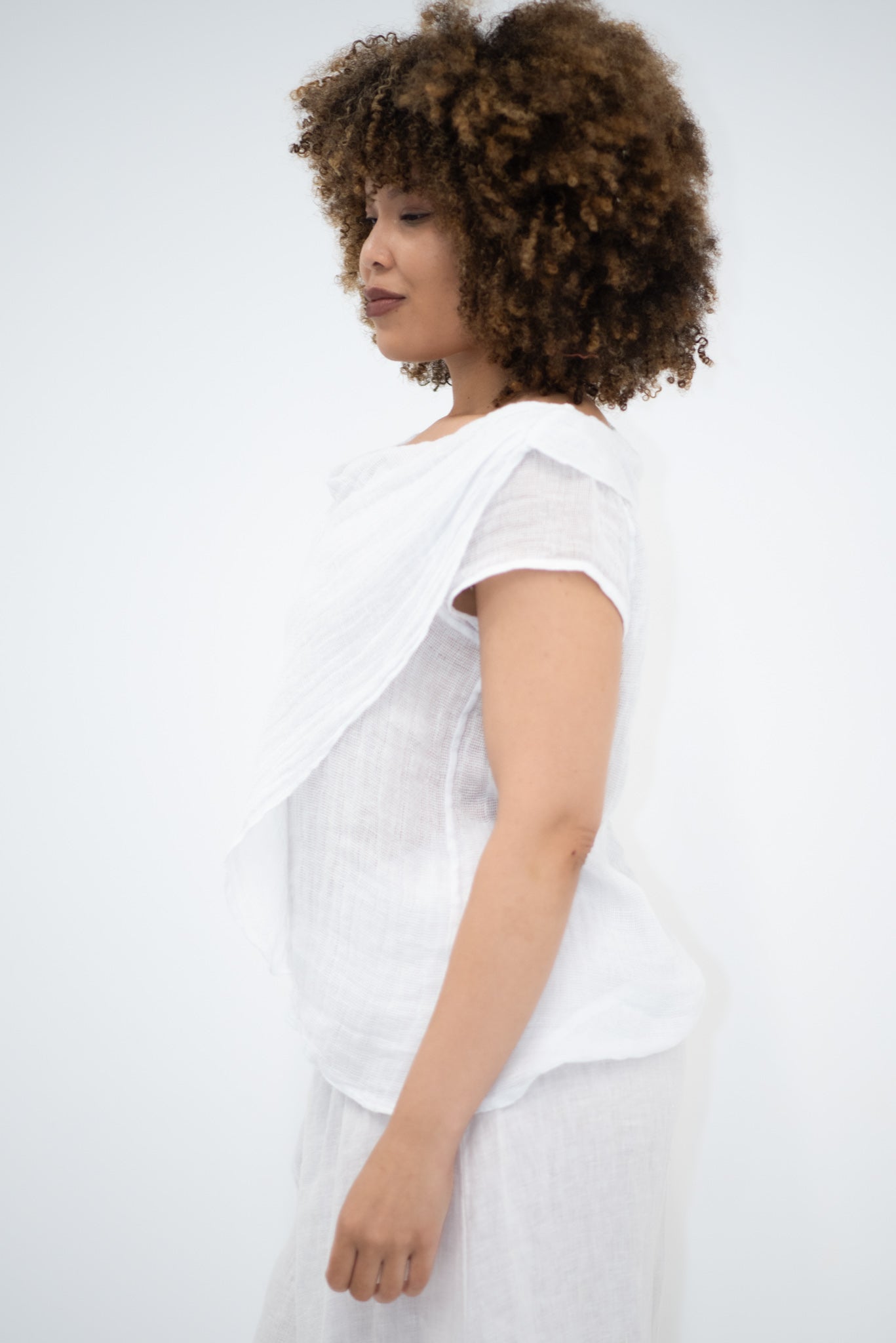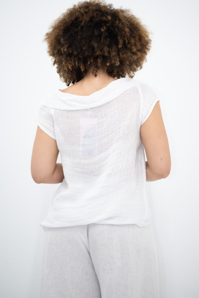 Light as air and effortlessly refined, the Coco Top in white is a celebration of simplicity with a sculptural twist. Made in Italy from 100% loose-weave linen, it feels weightless on the skin — breathable, textural, and perfectly suited to warm days and easy layering.