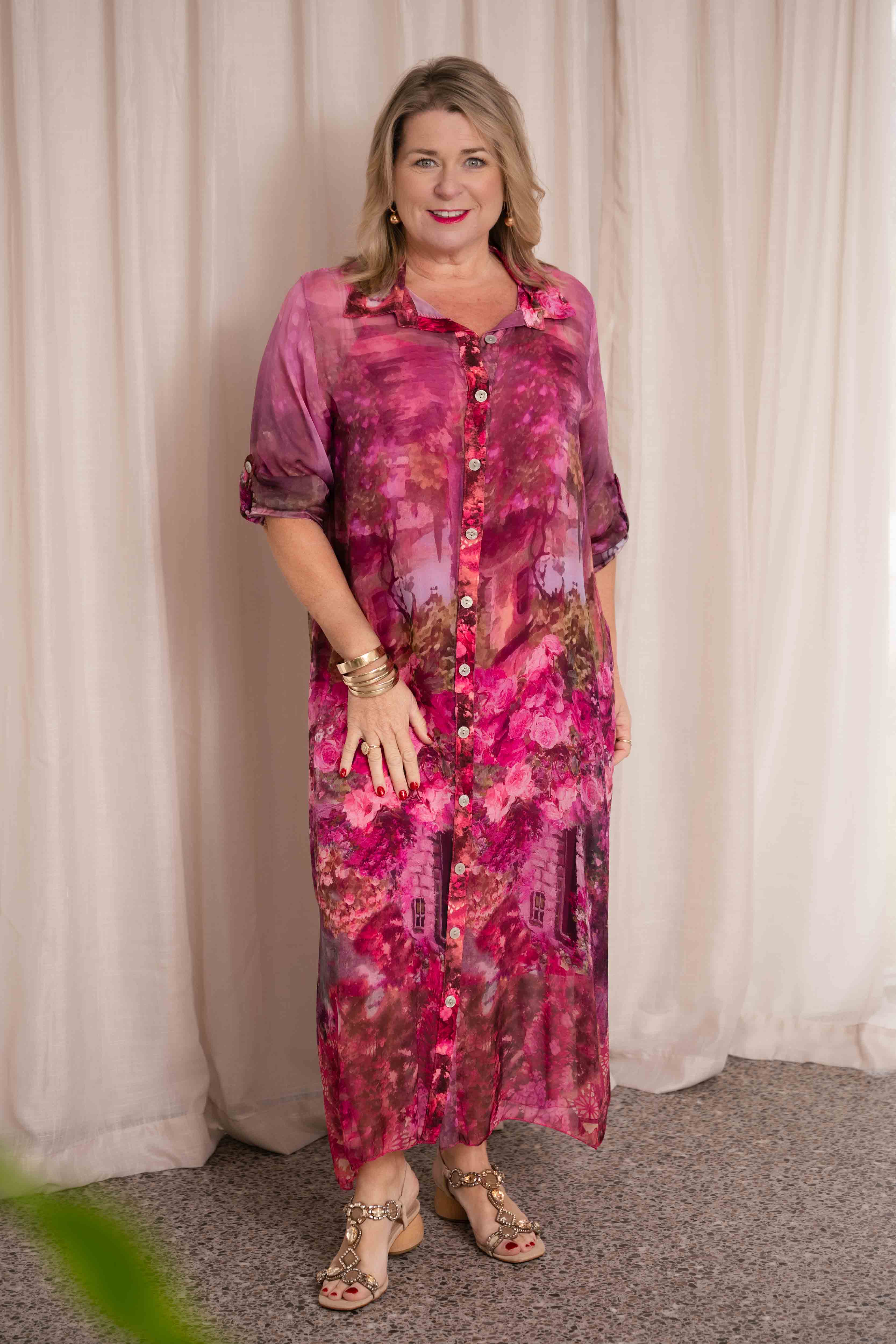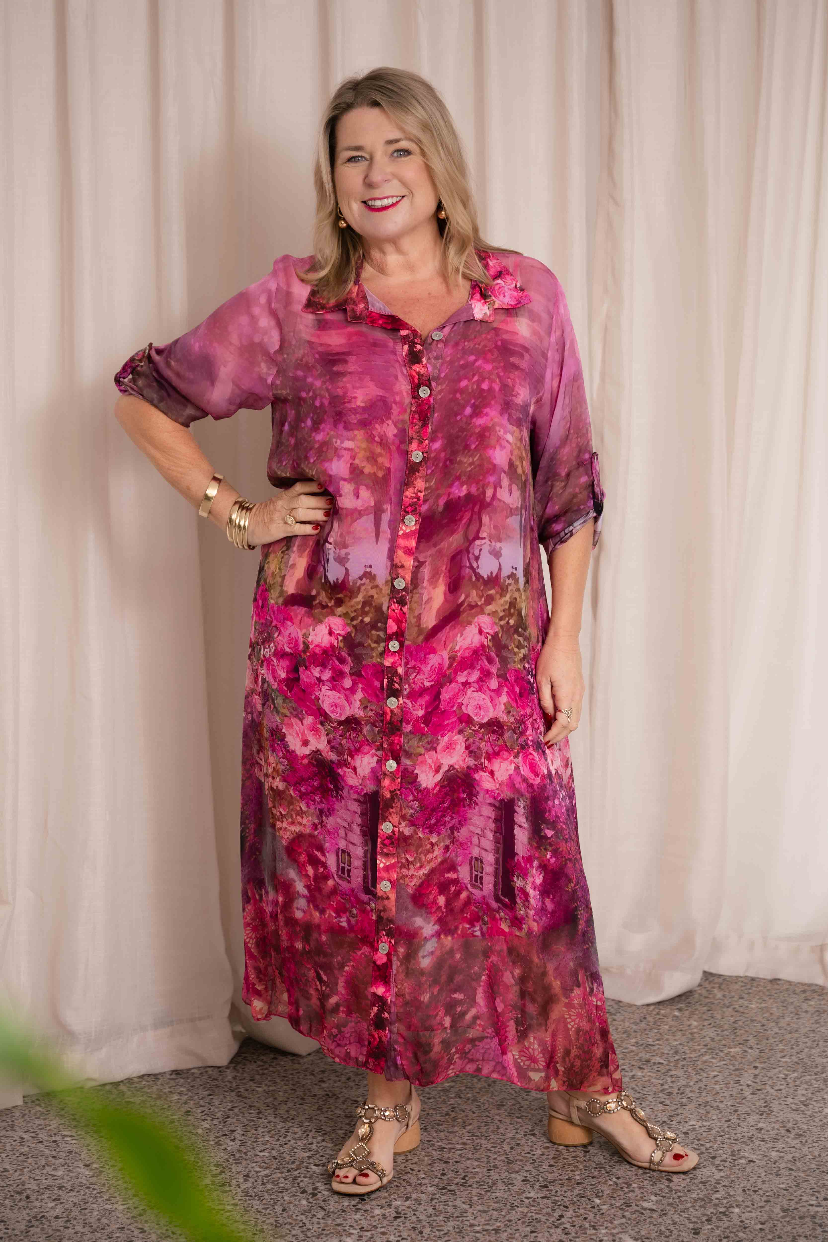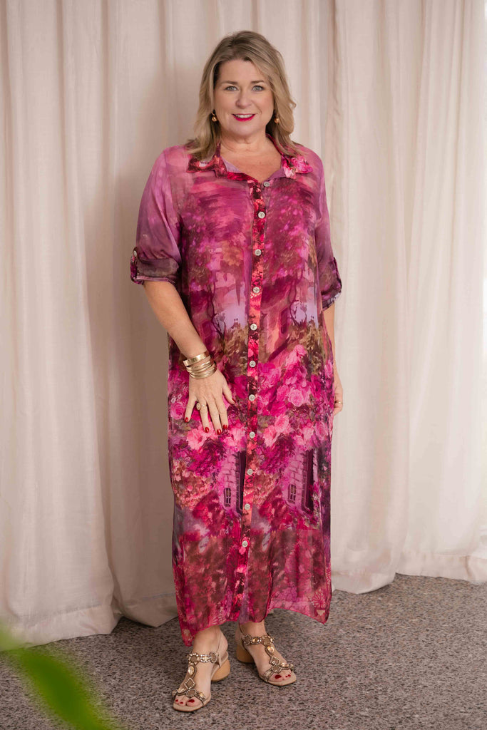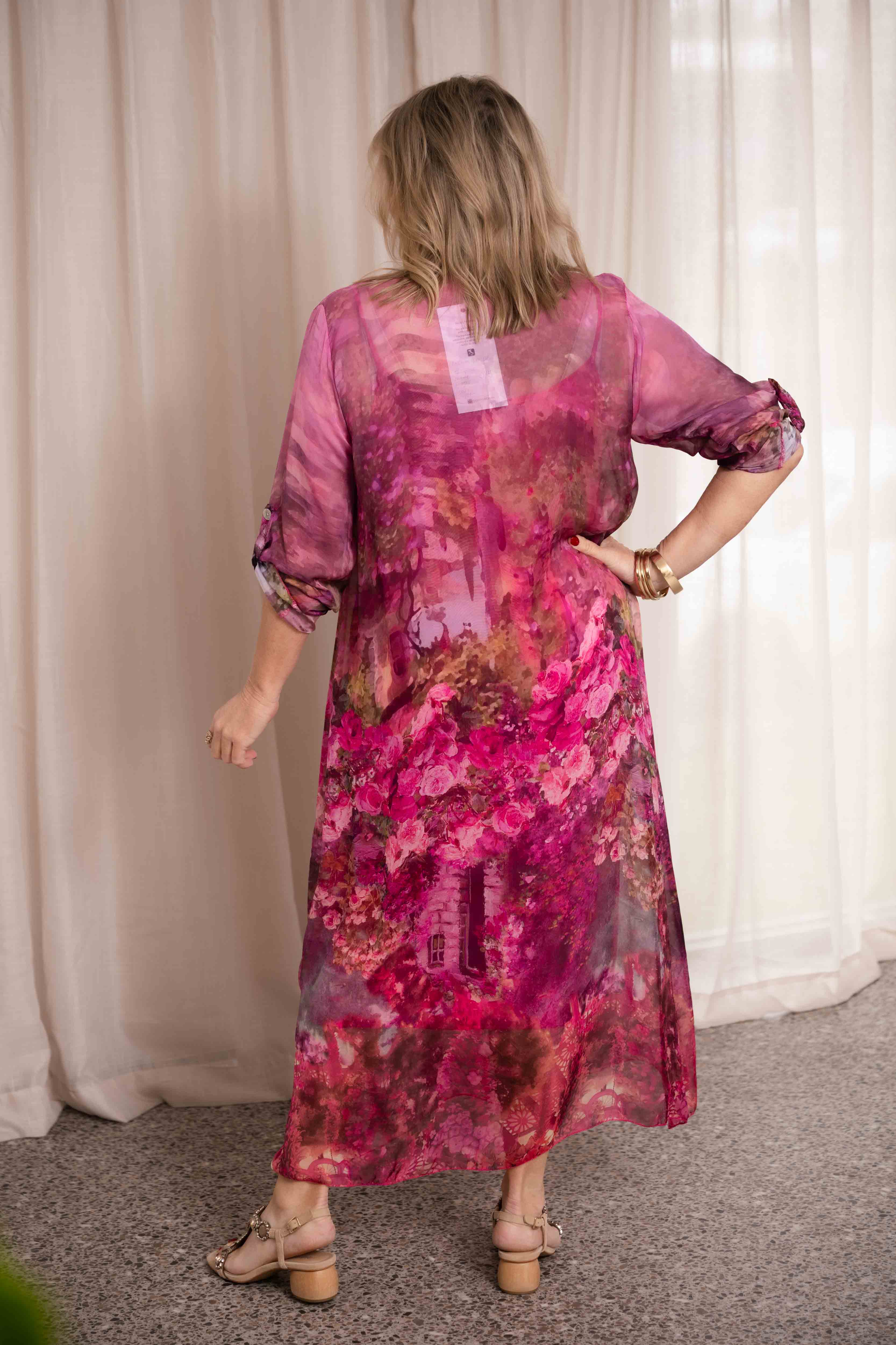Three-quarter sleeves are finished with a buttoned tab, giving you the option to wear them loose or folded up. The forest and cabin scene remains discreet, woven into the fabric like a hidden story — this time lit by the bright, floral energy of fuchsia hues.