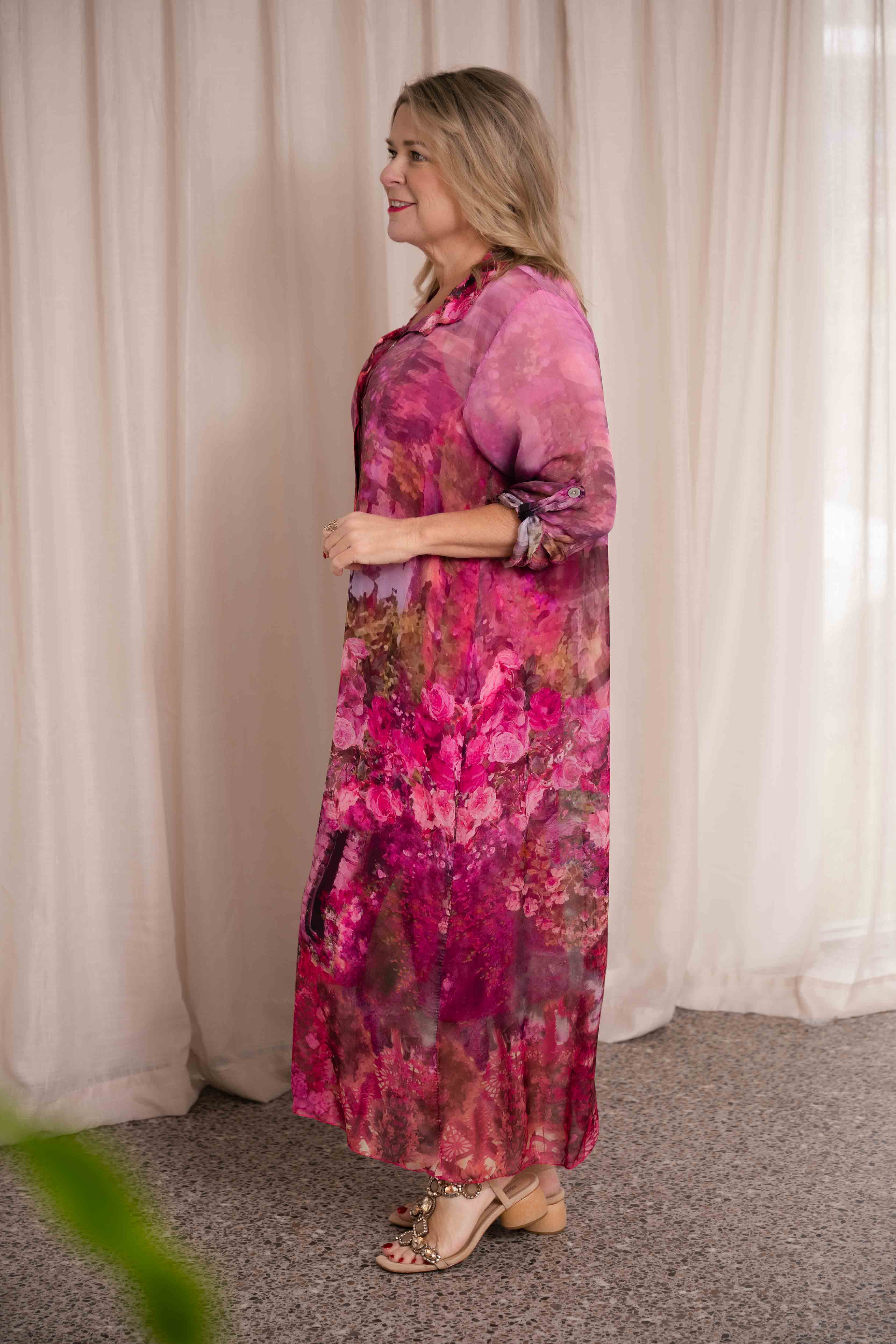 Made with the same flowing silhouette as the original, this ankle-length dress features a full button-down front from the V-neck collar to the hem, offering graceful movement and versatile styling. The soft stretch lining ensures comfort, while the silk outer layer adds a touch of lightness and natural drape.