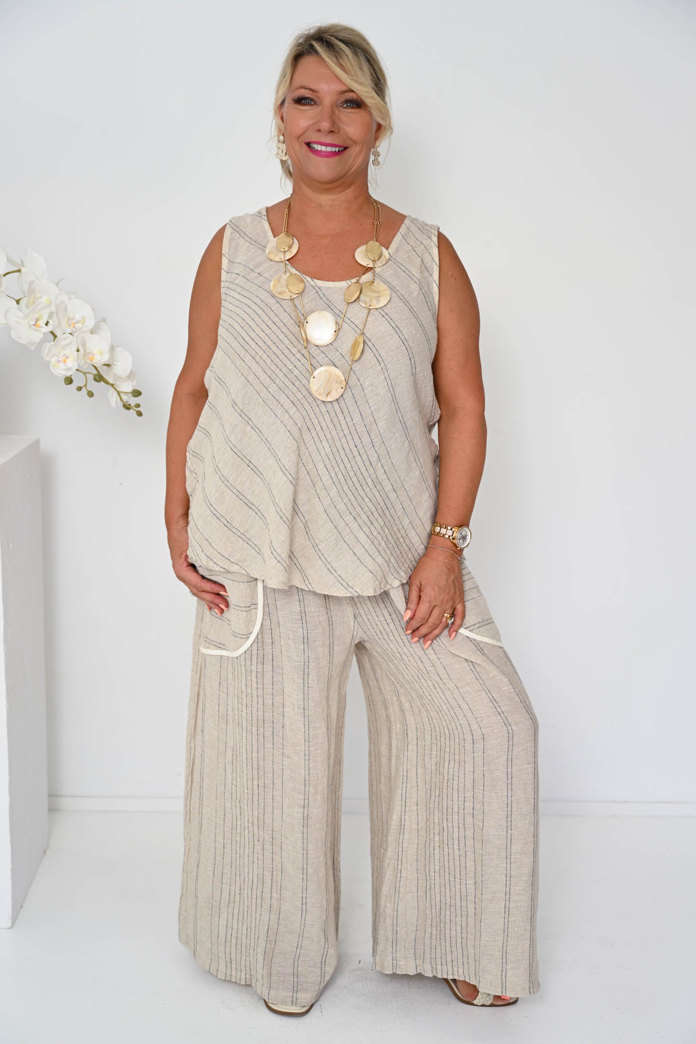 Introducing the Enzo Camio in Beige — a softly refined essential designed to bring lightness and versatility to your wardrobe. With its subtle diagonal stripe feature, this piece offers a modern twist on a classic linen silhouette while keeping the overall look effortless and wearable.