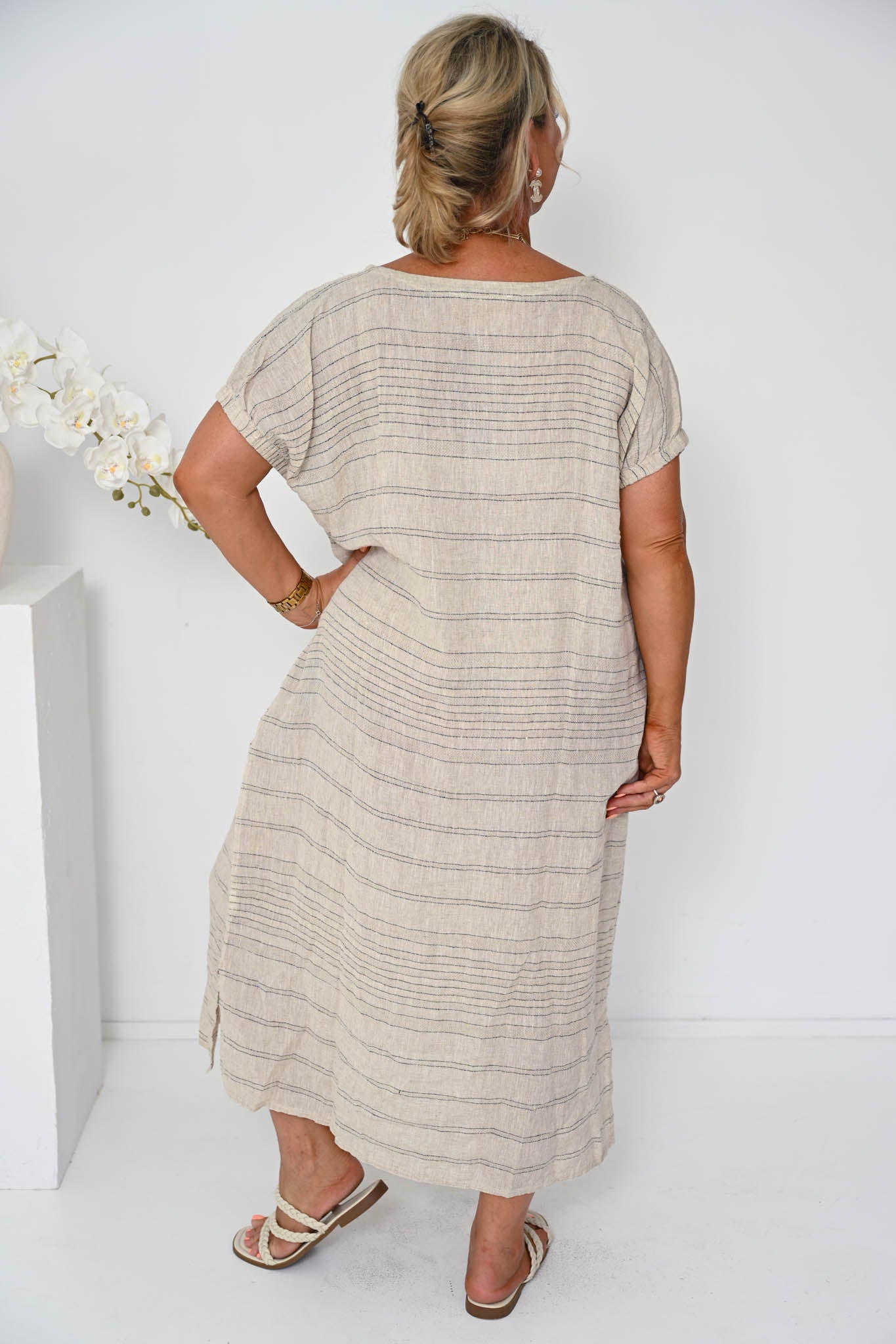 Adding a point of difference within the collection, the Enzo Dress features horizontal striping — bringing a fresh dynamic to the timeless linen texture. Functional side pockets enhance the relaxed design, blending practicality with understated style.
