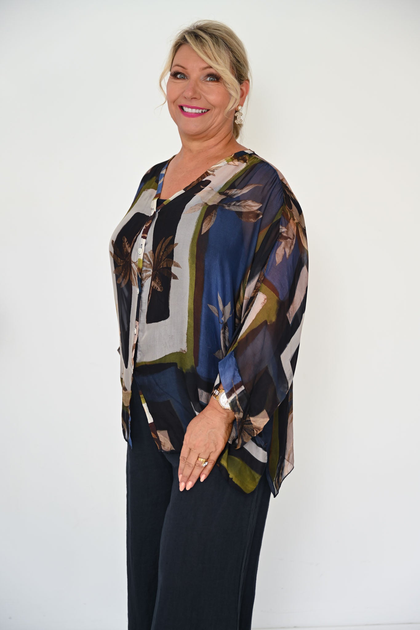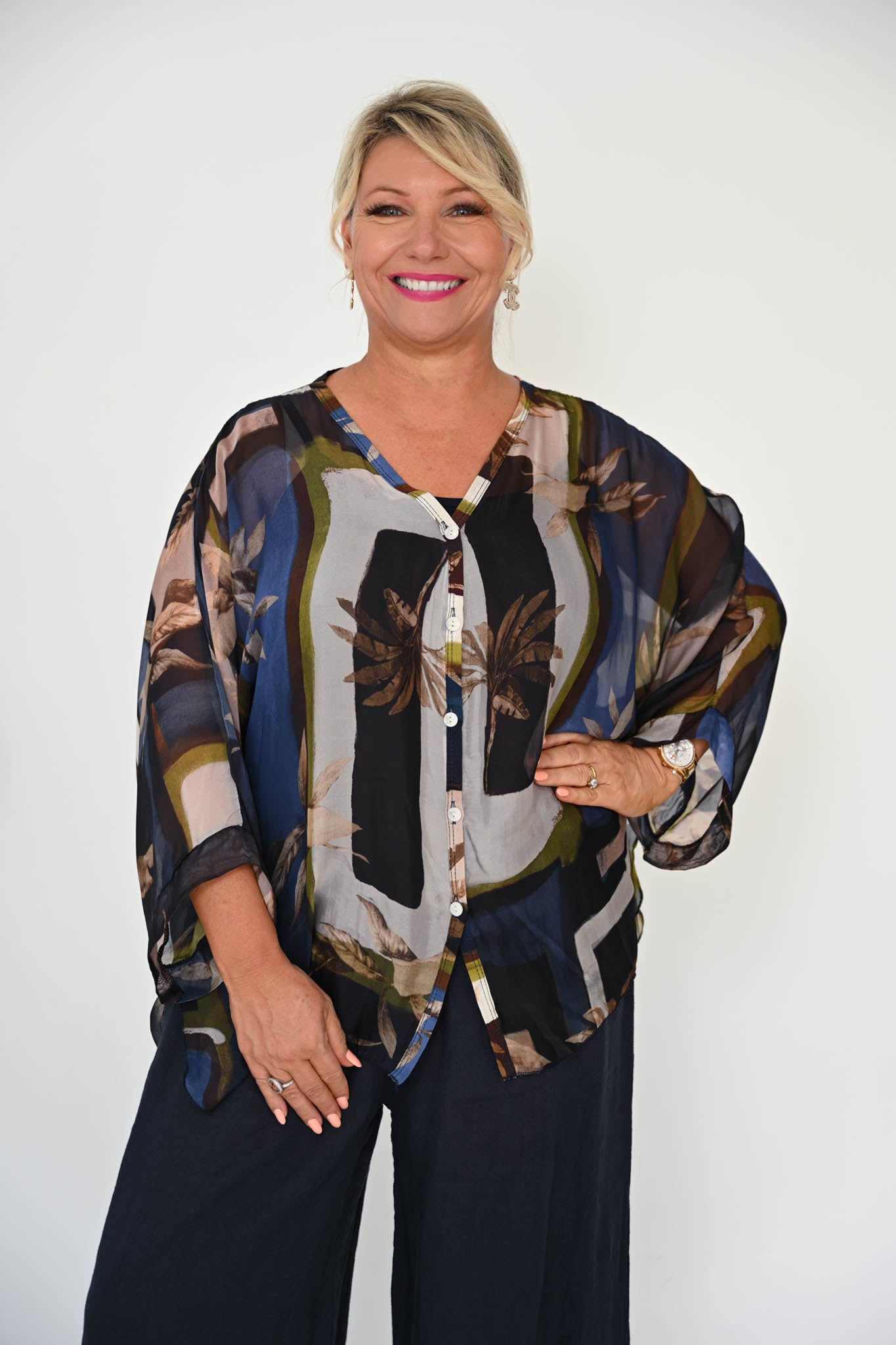 Introducing the Filante Top in deep Navy — a rich, sophisticated piece that blends classic colour with subtle warmth. Crafted from sheer silk and layered over a soft stretch singlet, this elegant button-down style drapes effortlessly over the body, creating a relaxed yet refined silhouette. A flattering V-neckline and flowing 3/4-length batwing sleeves add movement and ease.