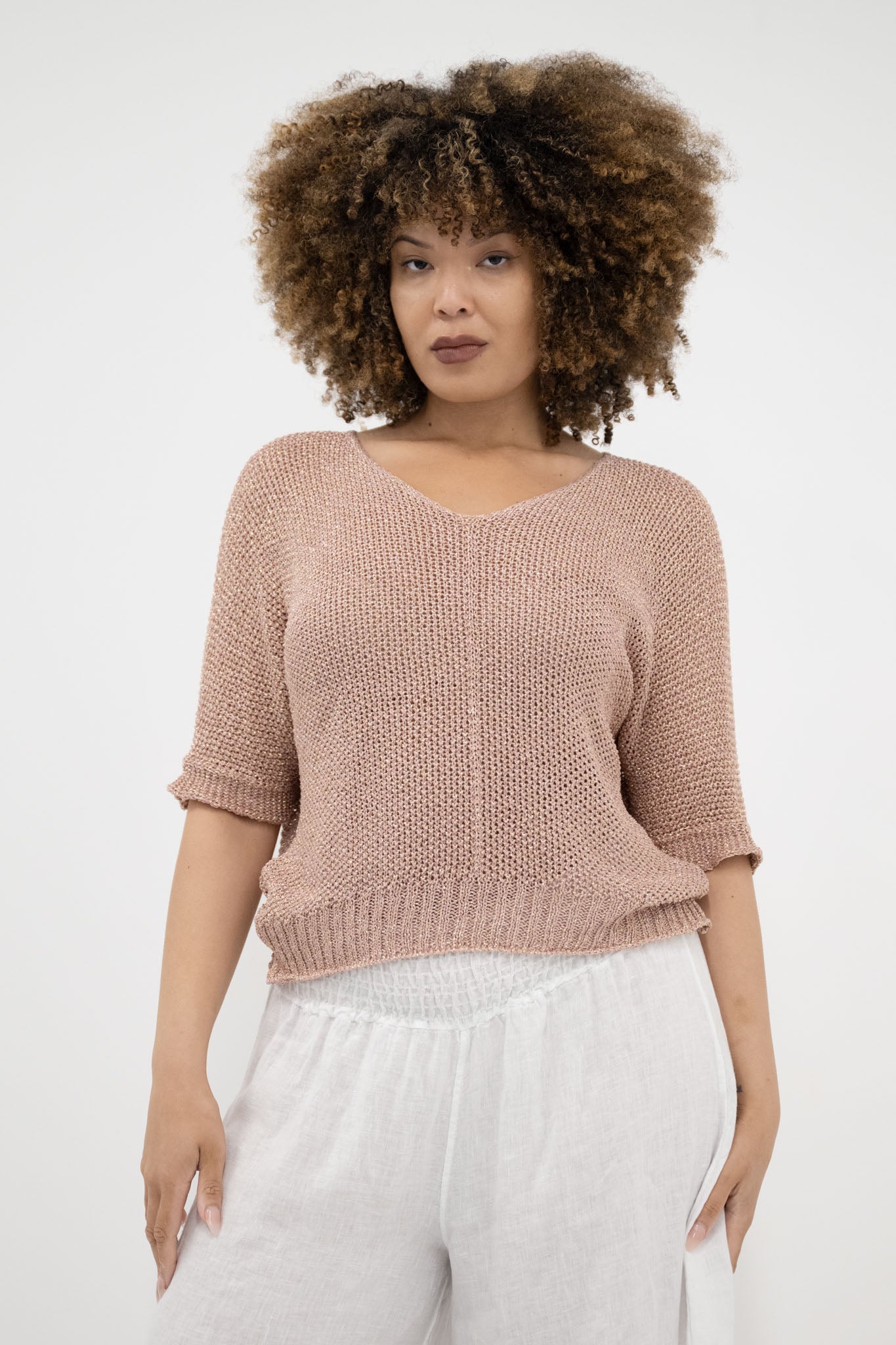 Its open weave adds texture and breathability, while the cropped cut and short sleeves give it a modern, easy-to-style silhouette. A flattering V-neckline and subtle seams through the front and back offer gentle shape, and wide hems at the cuffs and waistline create a clean, confident finish.