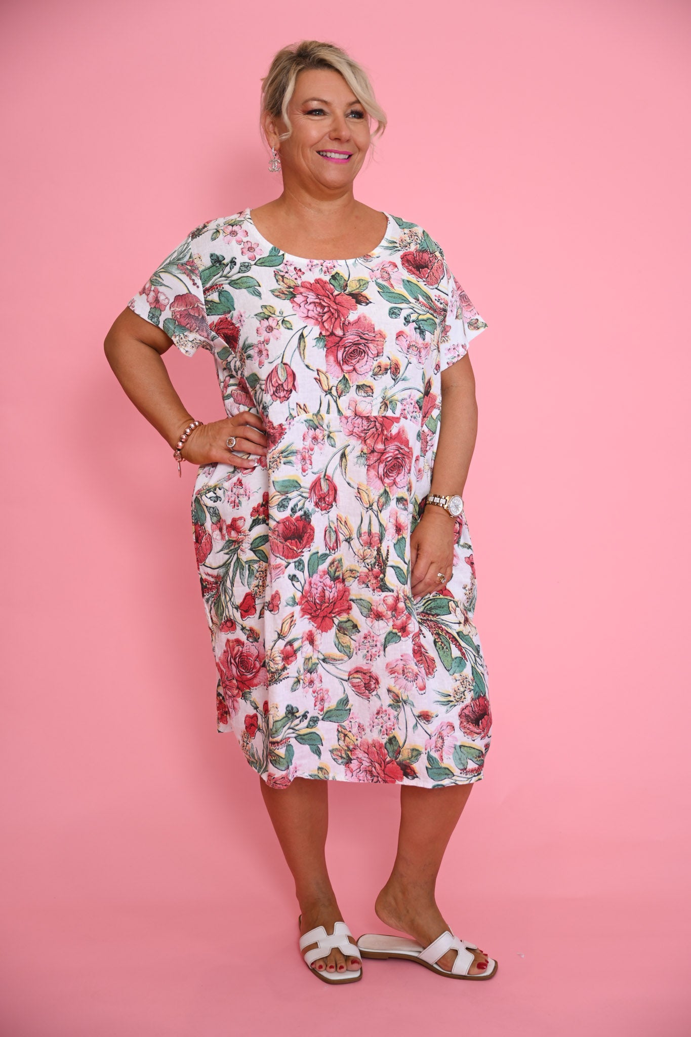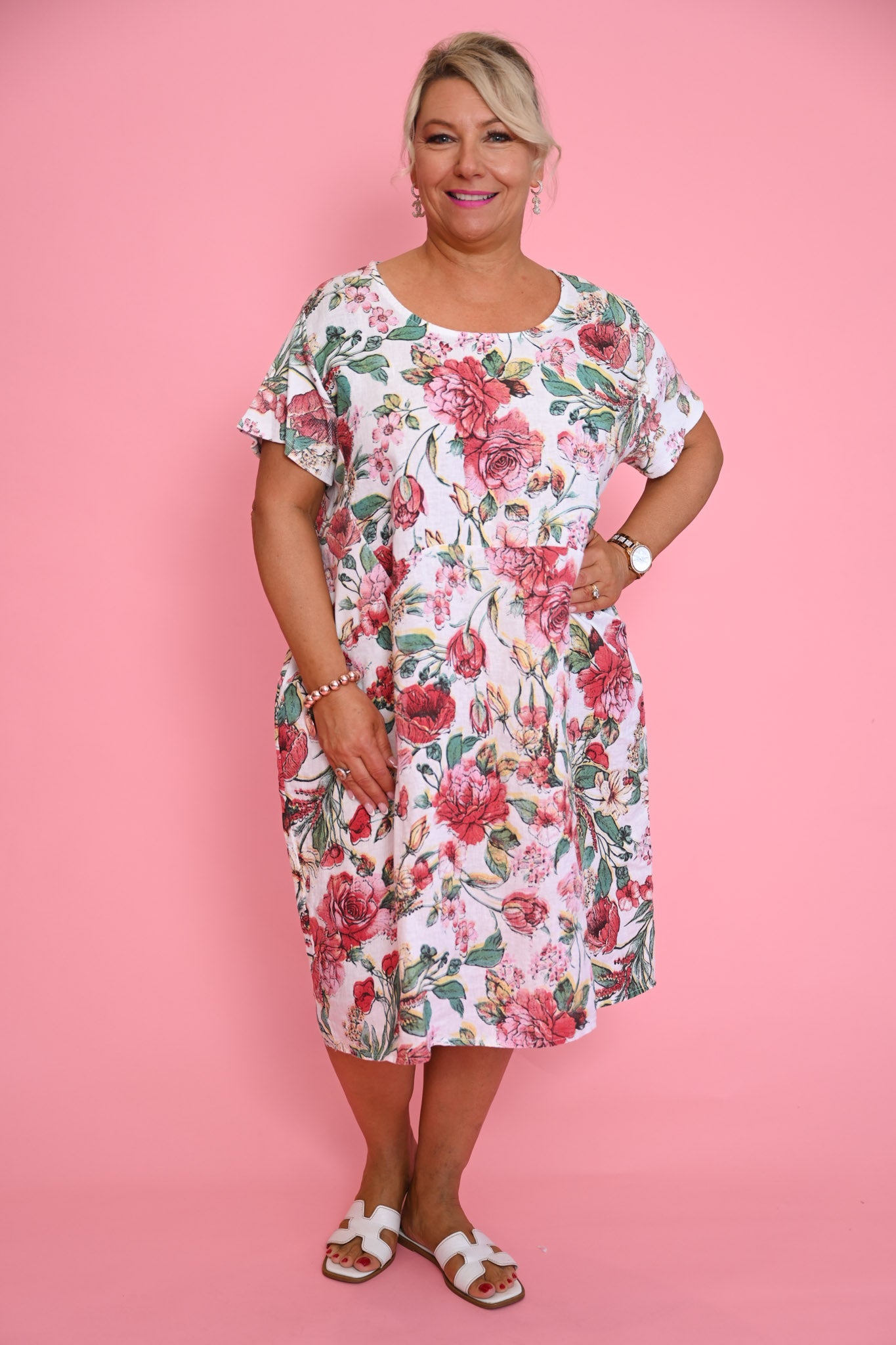 Crafted from breathable Italian linen, the below knee-length hem drifts lightly with every step, creating a flowing silhouette that feels as comfortable as it is refined. Perfect for festive gatherings, family celebrations, or simply bringing a touch of seasonal cheer to your wardrobe, the Florinda Floral Dress in Xmas Print combines classic design with playful, vibrant charm.
