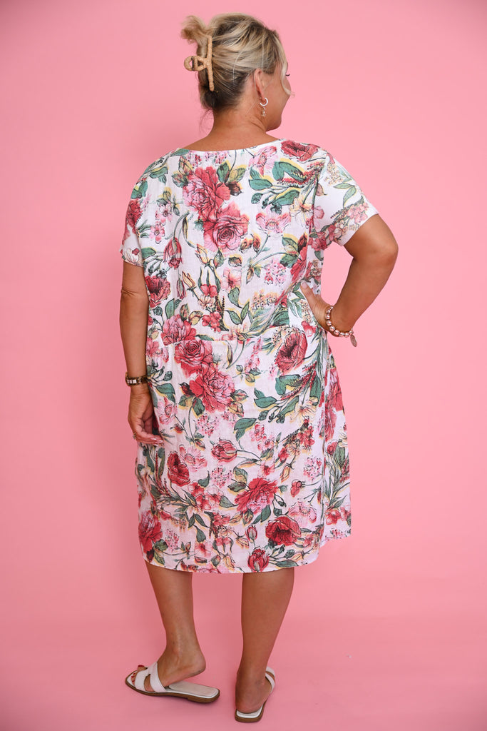 Celebrate the season in style with the Florinda Floral Dress in Xmas Print, a festive take on our beloved silhouette. Vibrant red and green floral motifs dance across the crisp linen fabric, creating a joyful, holiday-ready statement while maintaining the dress’s timeless elegance.