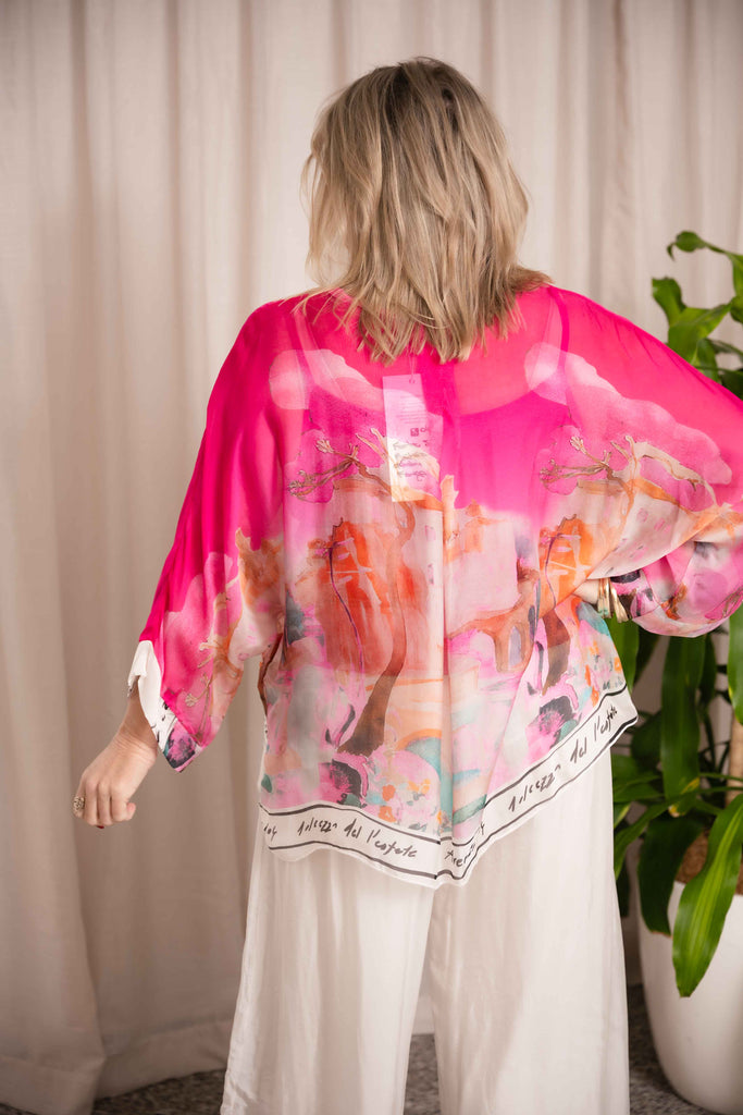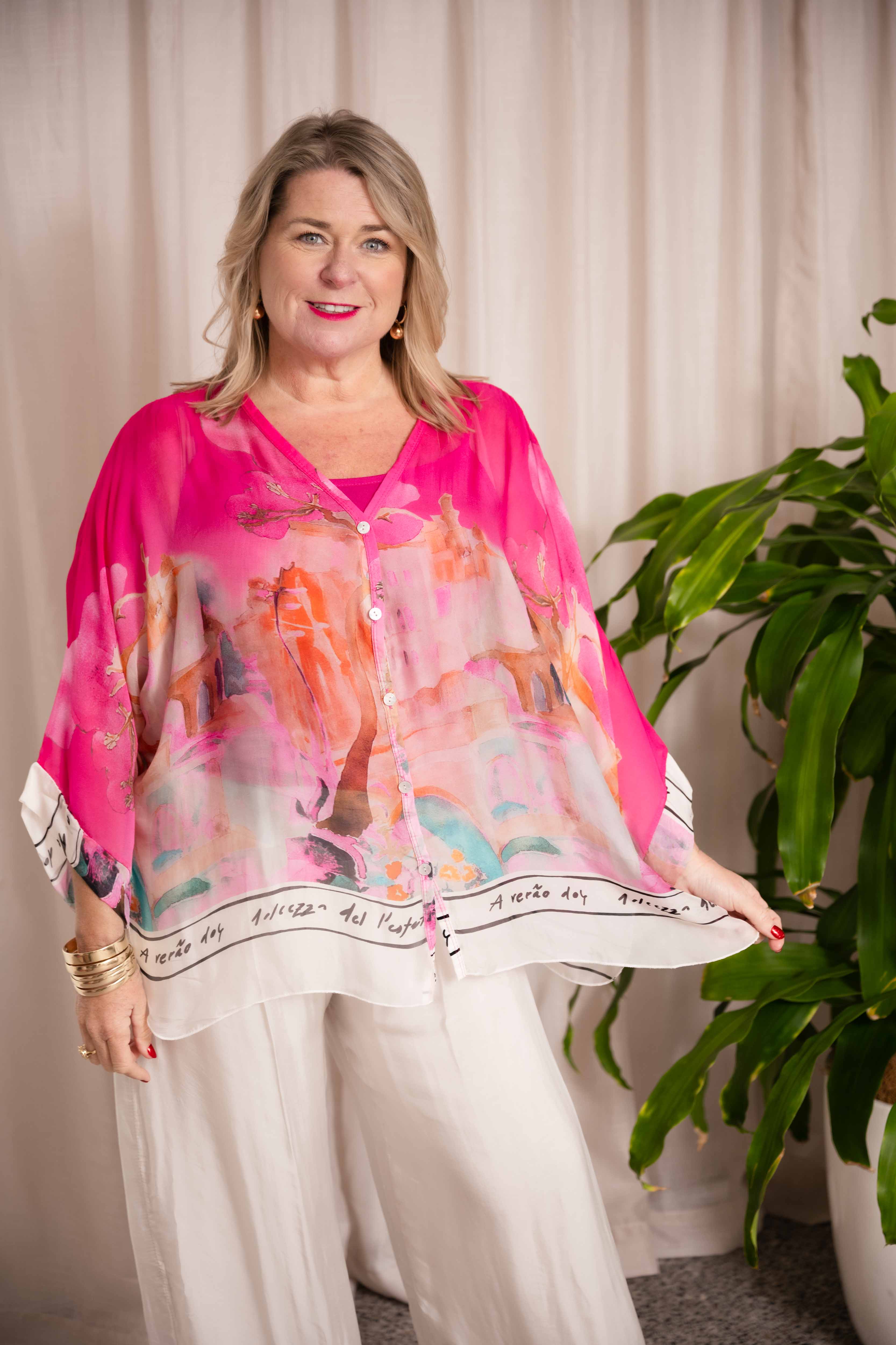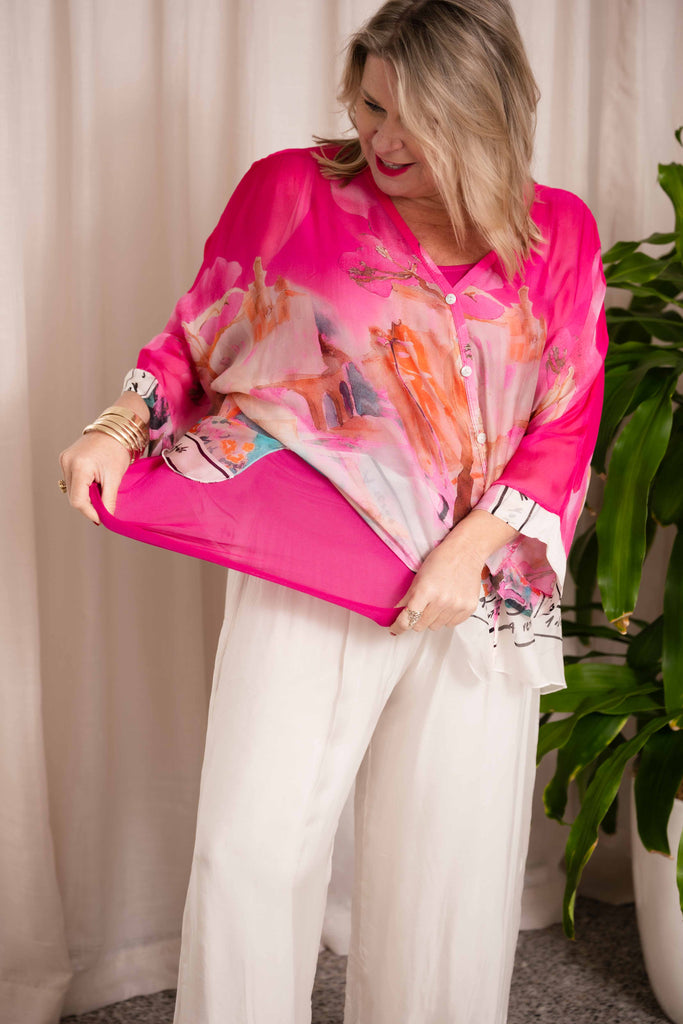 The Forte Top is a modern take on classic elegance, crafted from sheer silk that flows effortlessly over a soft stretch singlet. Featuring a flattering V-neckline and 3/4-length batwing sleeves, this buttoned silk shirt offers a relaxed yet refined silhouette.