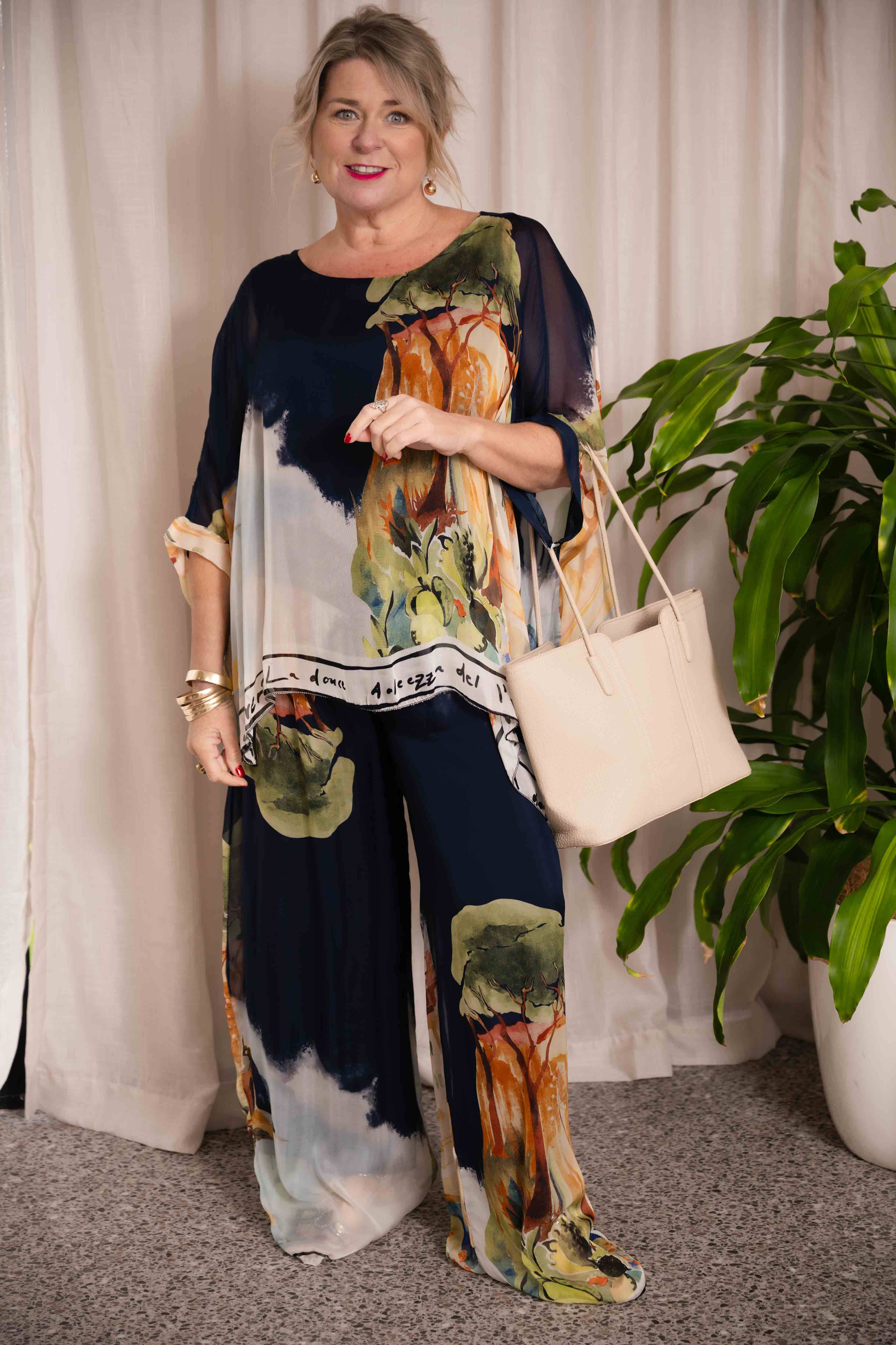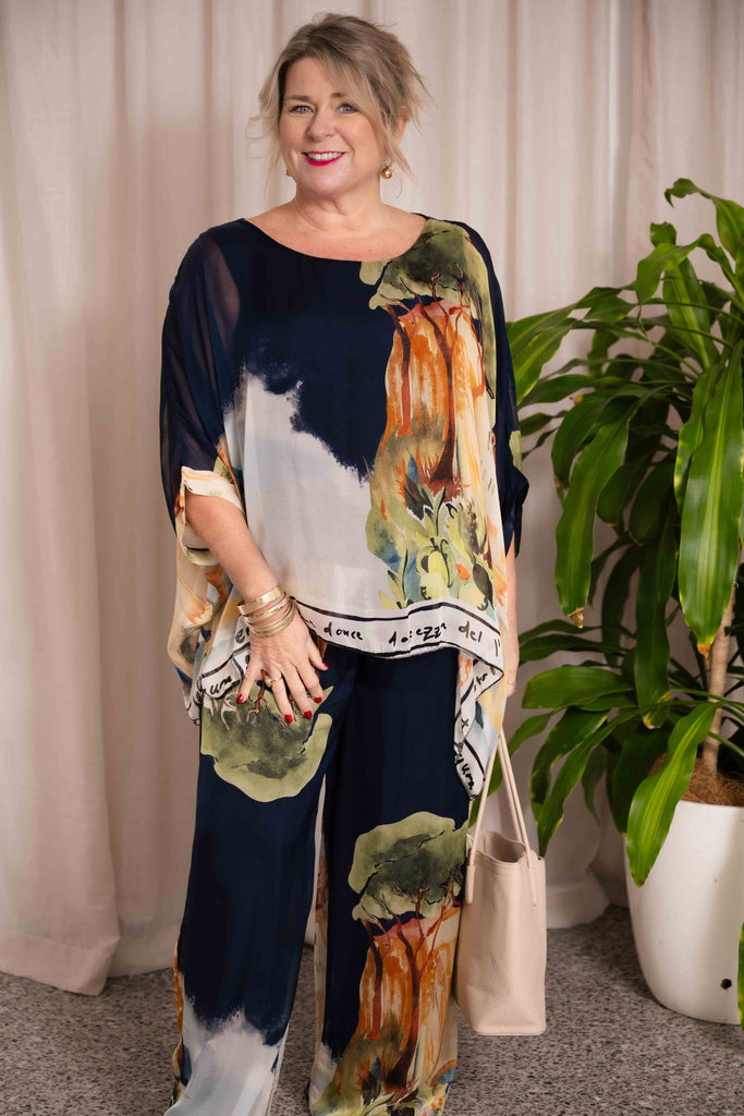 Made from a luxurious silk blend overlay in rich navy tones with hints of brown, the Fortelli Top showcases a delicate print of coastal Italian buildings, trees, and landscapes—invoking the calm beauty of twilight along sunlit shores.