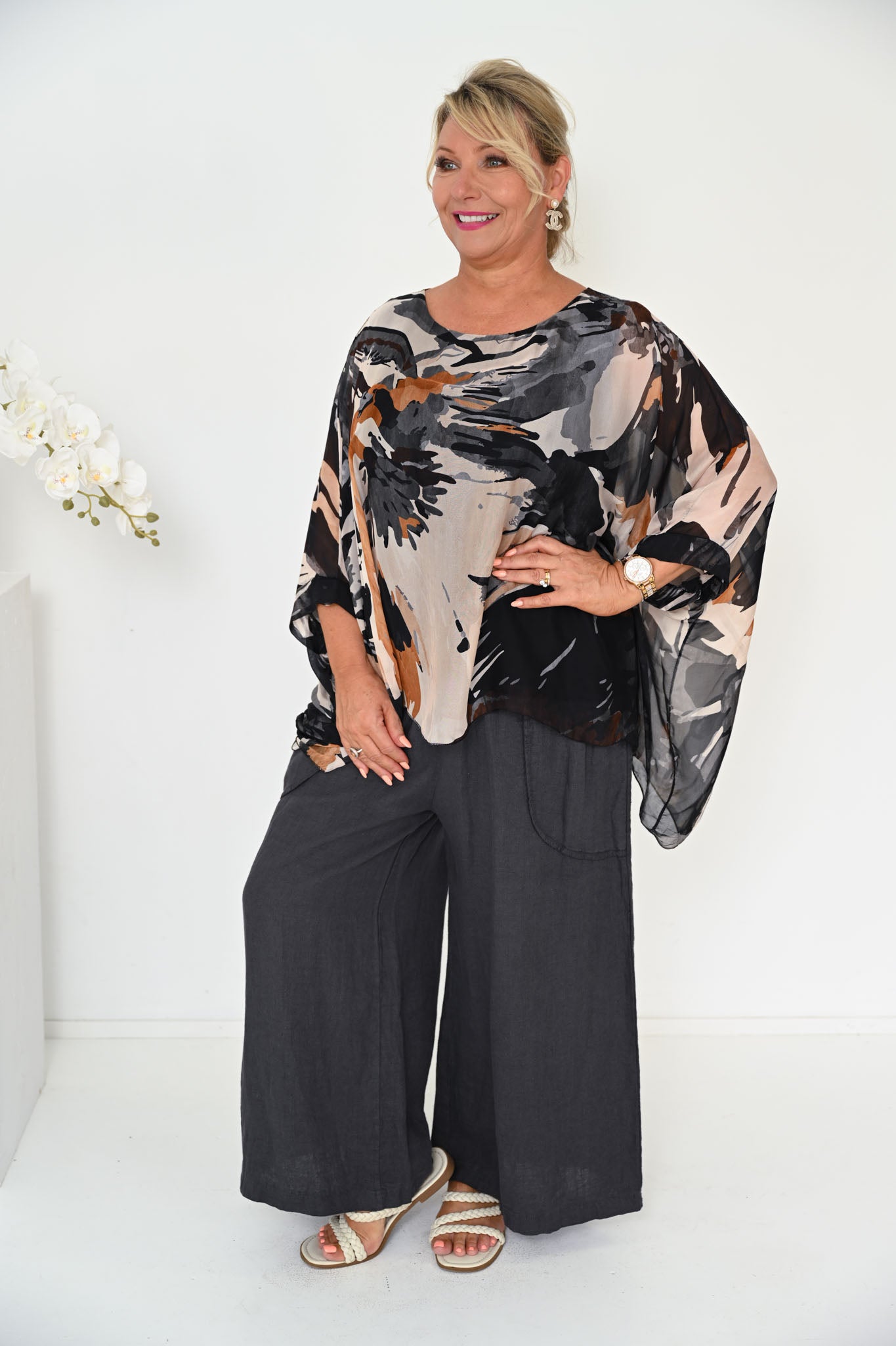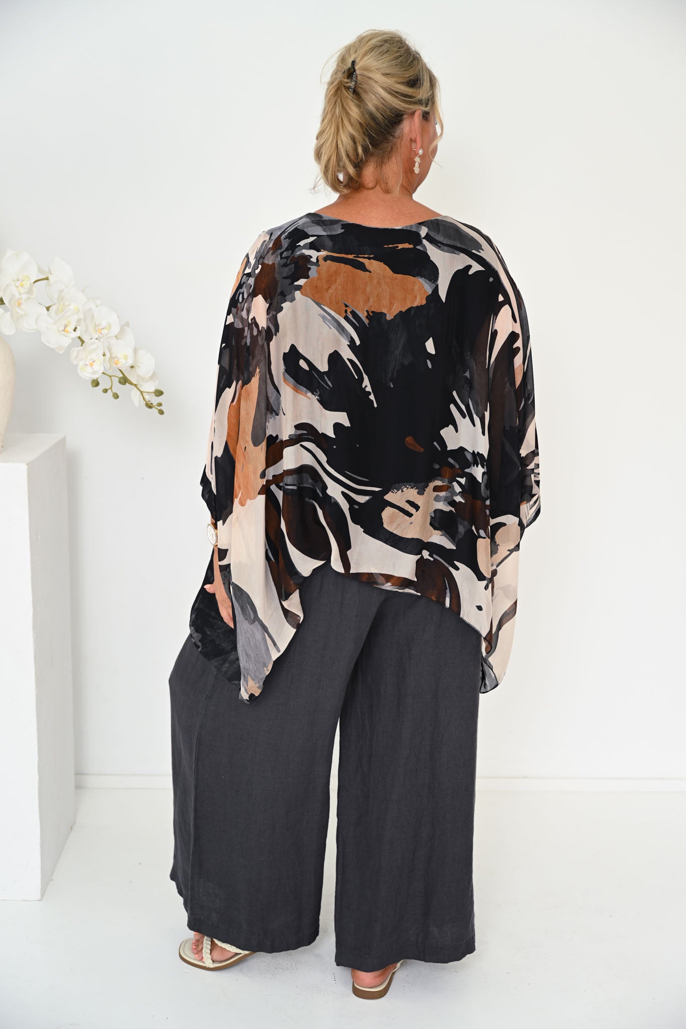 The Frusca Silk Top in Black brings a bold yet timeless feel to your wardrobe. The fabric is detailed with striking, painterly patterns that echo the look of expressive brushstrokes, creating depth and visual movement across the design.