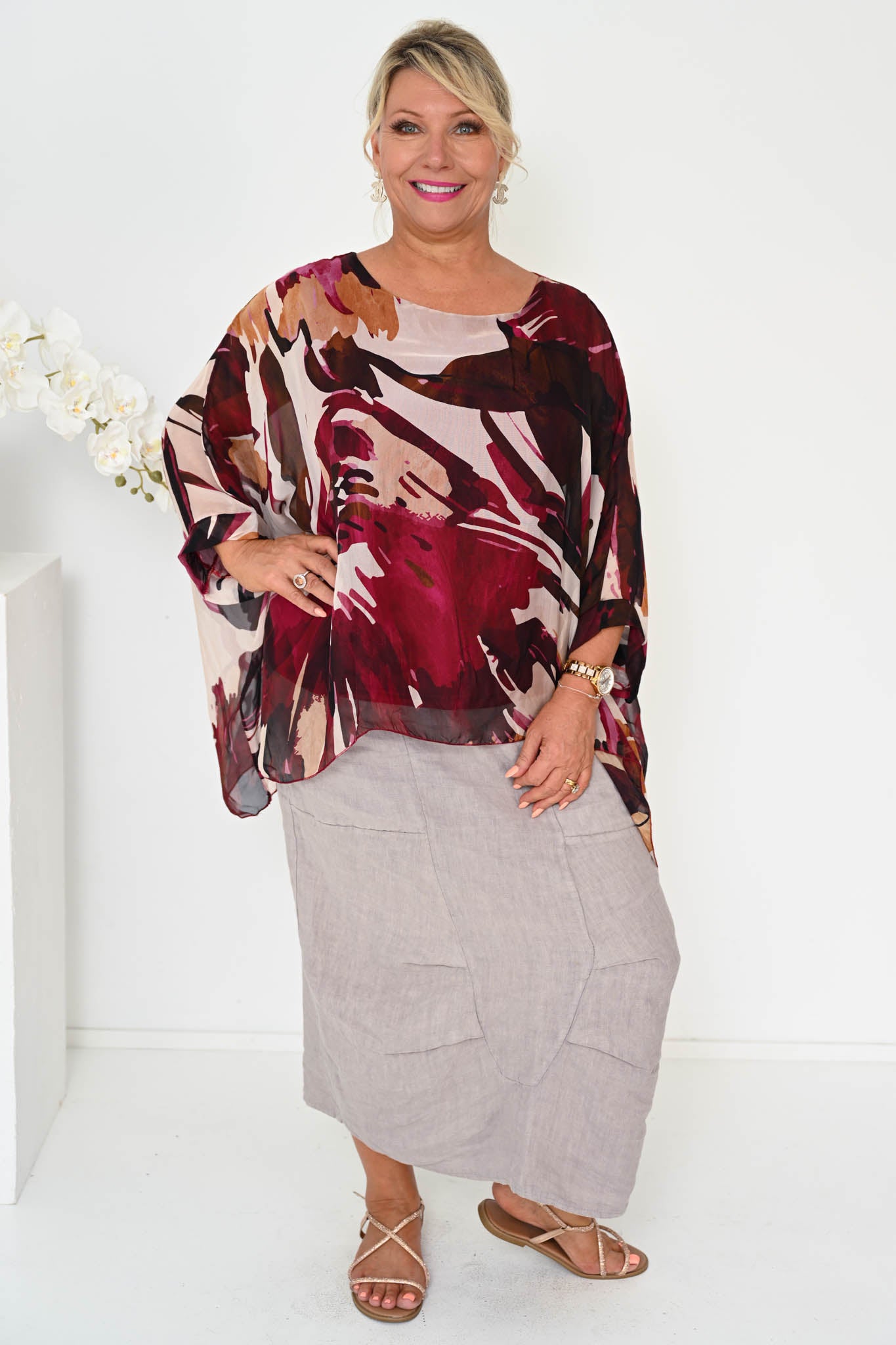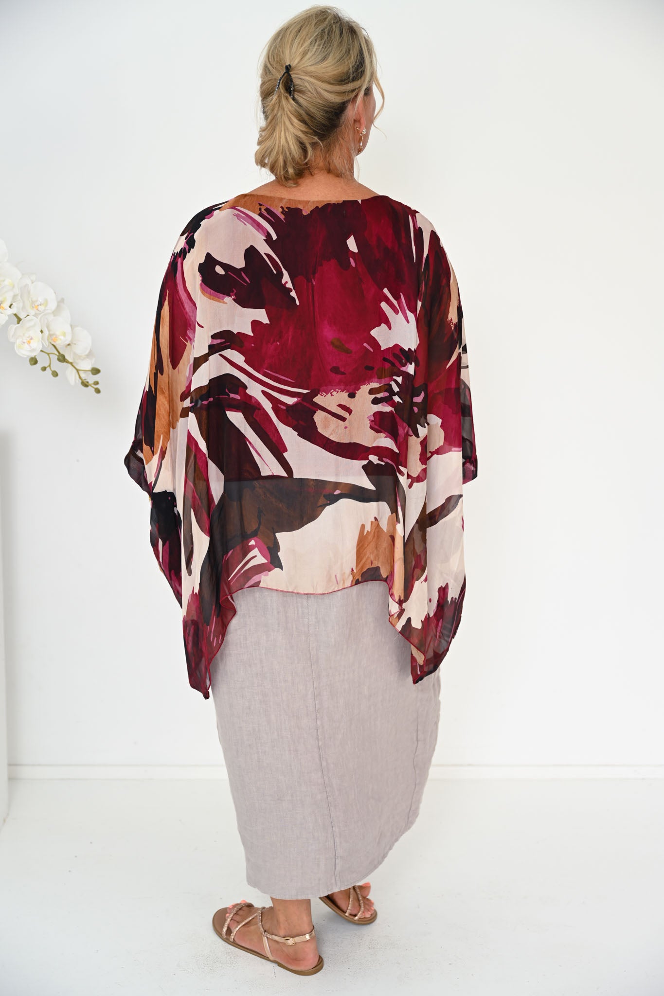 The Frusca Silk Top in Wine is a striking blend of rich colour and expressive design. The fabric features bold, painterly patterns reminiscent of sweeping brushstrokes, creating a sense of movement and artistic energy throughout the piece.