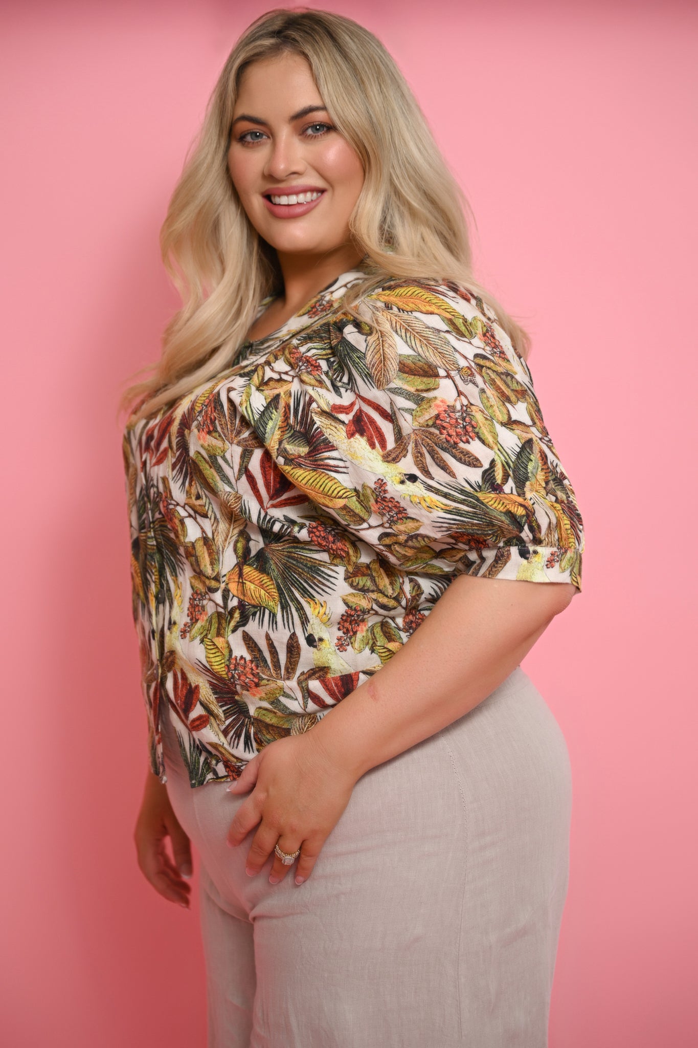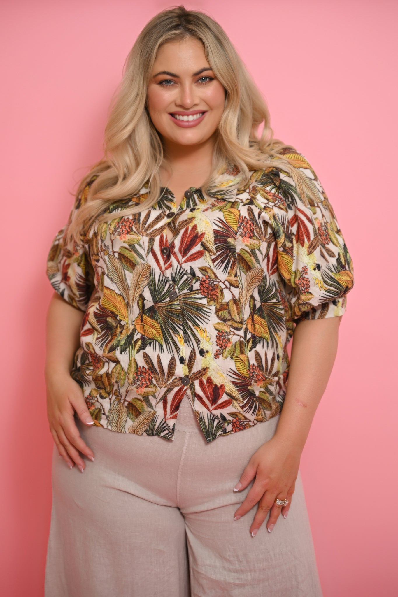 The Gala Blouse is an Italian-made linen top that combines relaxed elegance with bold, nature-inspired design. Crafted from breathable linen, it features a classic collar, elbow-length puff sleeves, and a button-down front, creating a timeless silhouette with a modern twist.