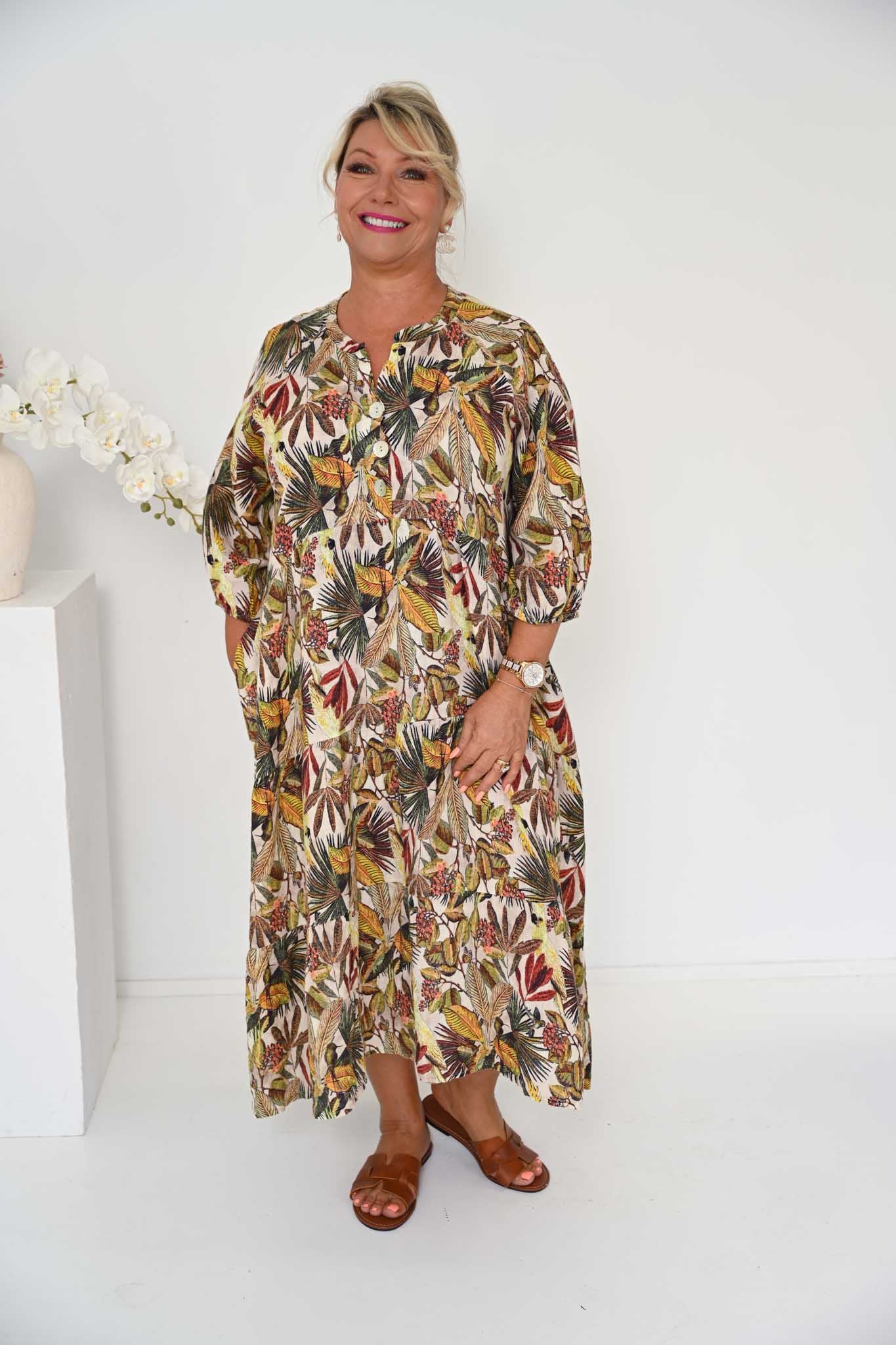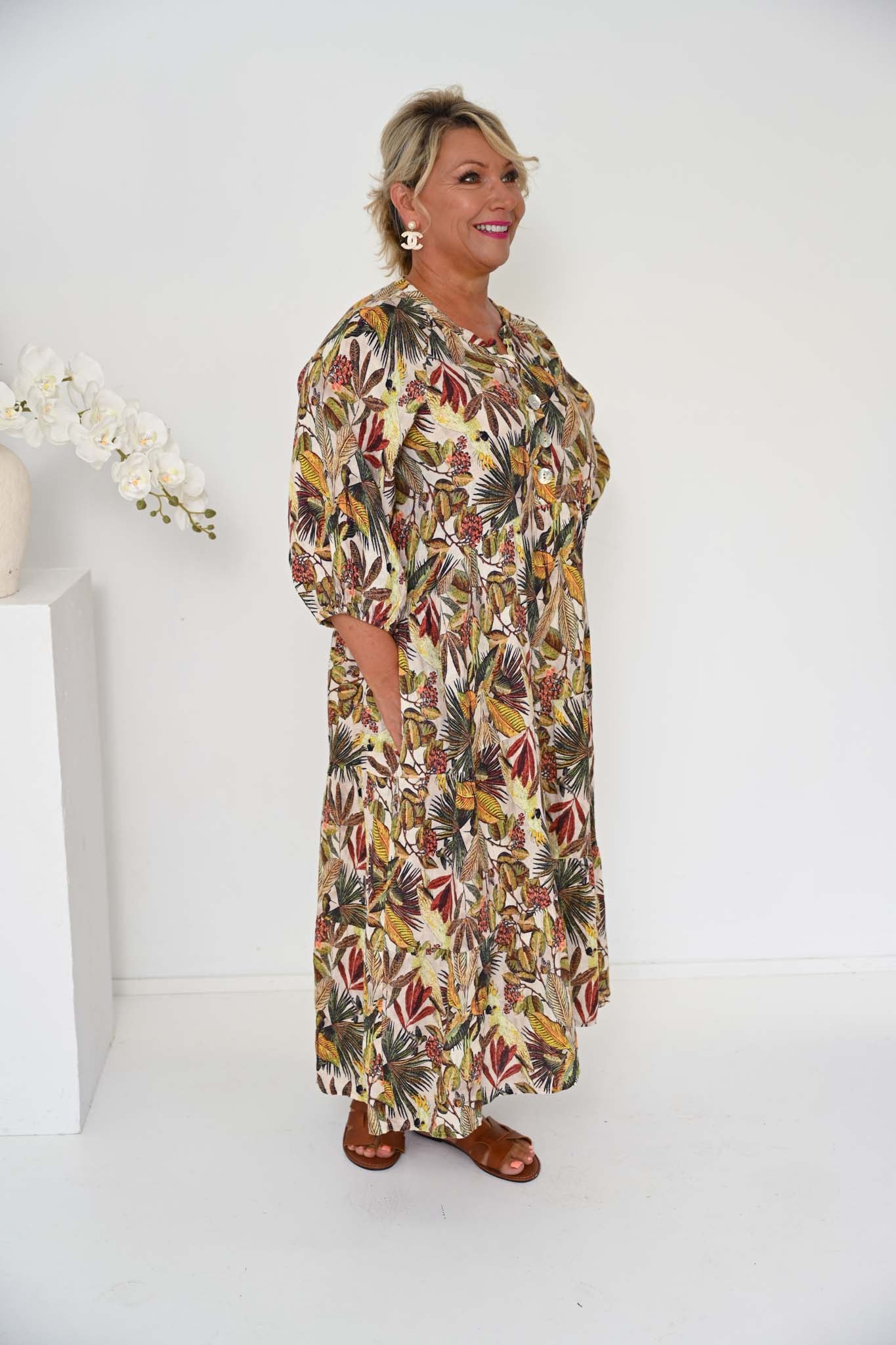 The dress is adorned with a vivid garden motif, showcasing palms, lush foliage, and touches of birdlife in warm browns, deep reds, and golden yellows. Striking sulphur-crested cockatoos appear throughout the design, adding a playful, artistic element that brings the pattern to life. Subtle front panelling enhances the fit, giving the bold print a clean, considered structure.