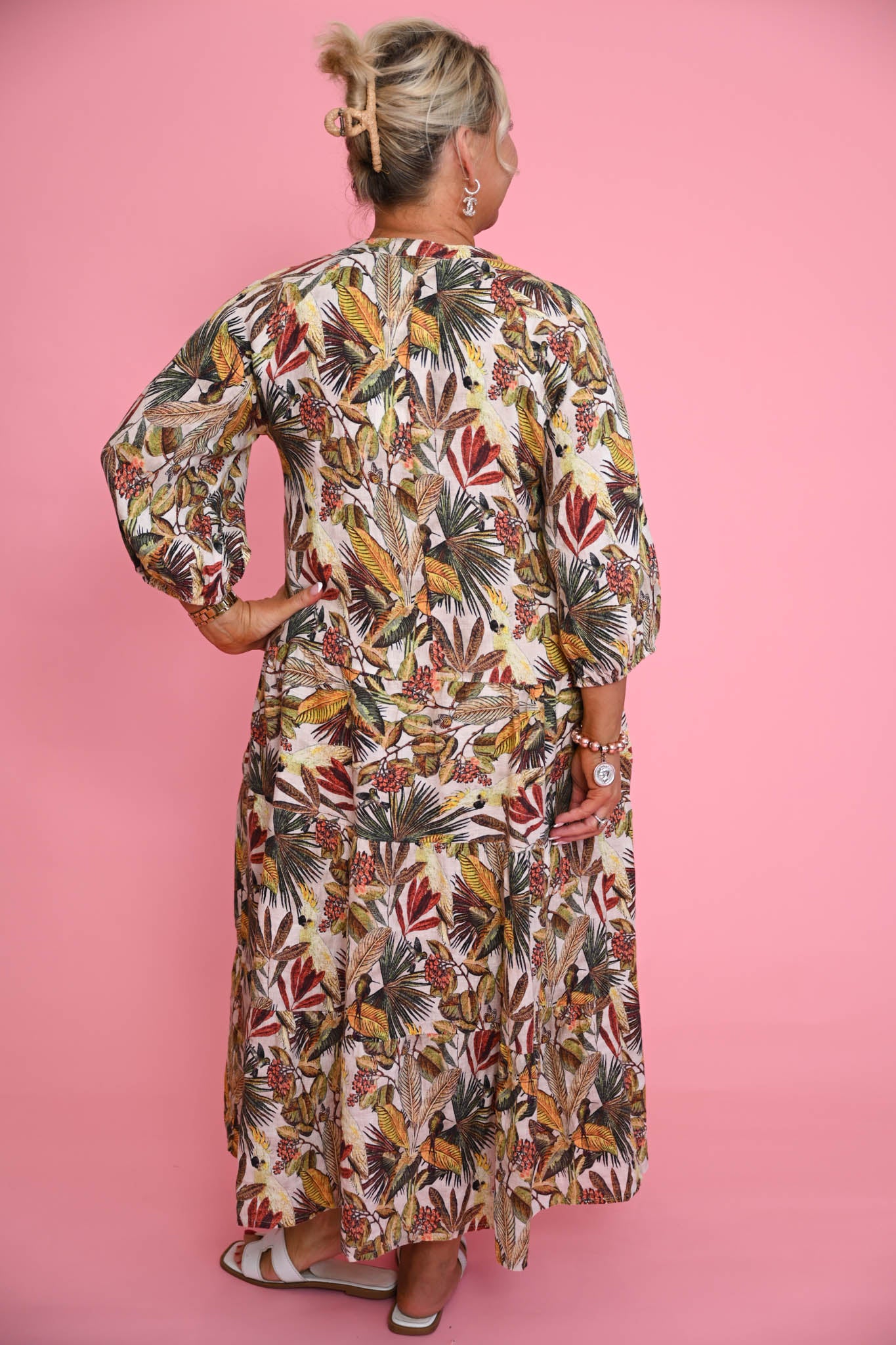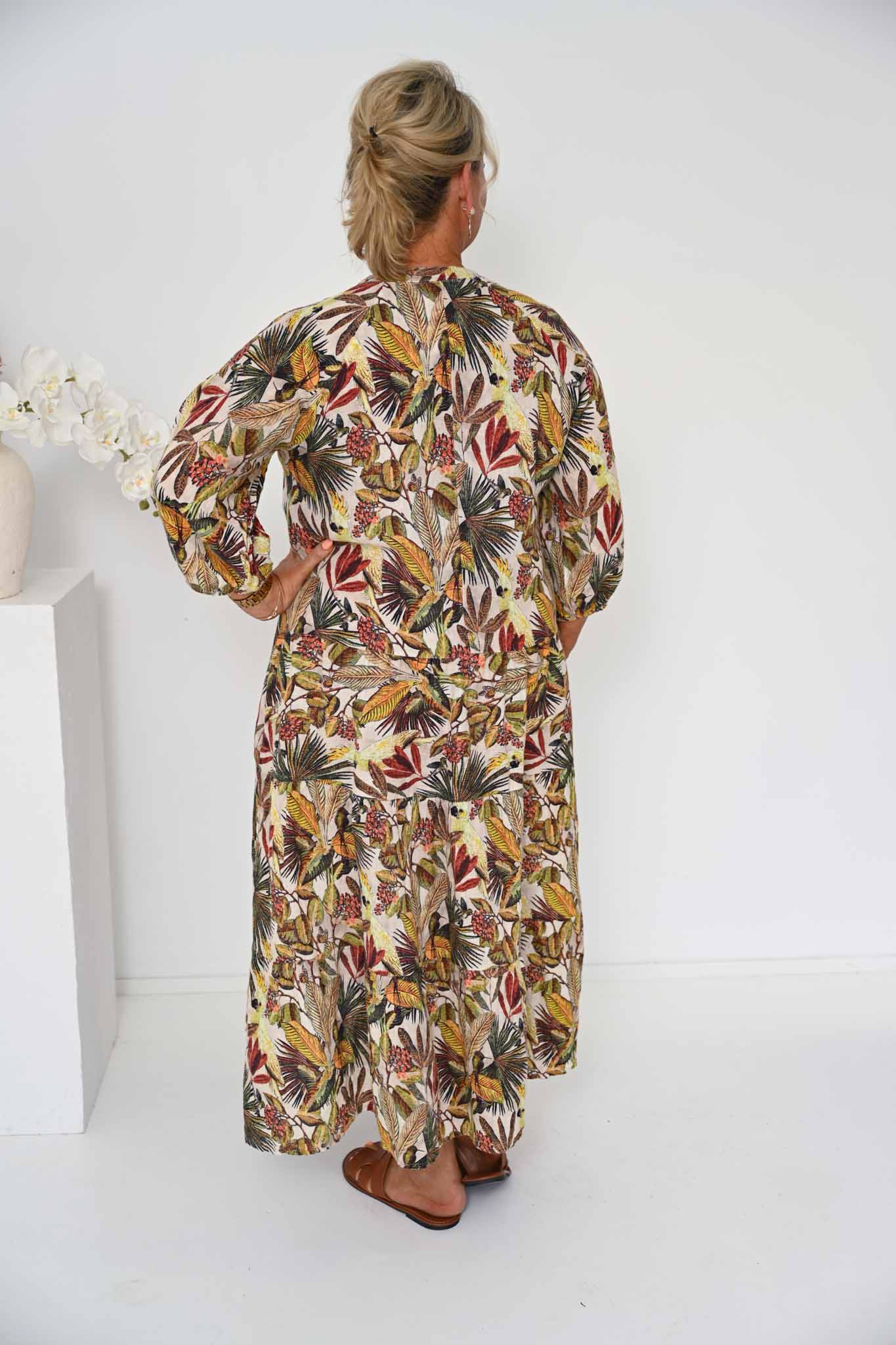 The Gala Garden Tiered Dress brings together a beautifully tiered silhouette with the expressive detail of an Italian-inspired botanical print. Crafted from breathable linen, it features mid-length balloon sleeves with elasticised cuffs, adding soft volume and balance. A gentle round neckline that drops into a V and button-through bodice offer a refined, feminine touch, while the empire waist flows into a tiered skirt that creates elegant movement and an effortlessly flattering line.