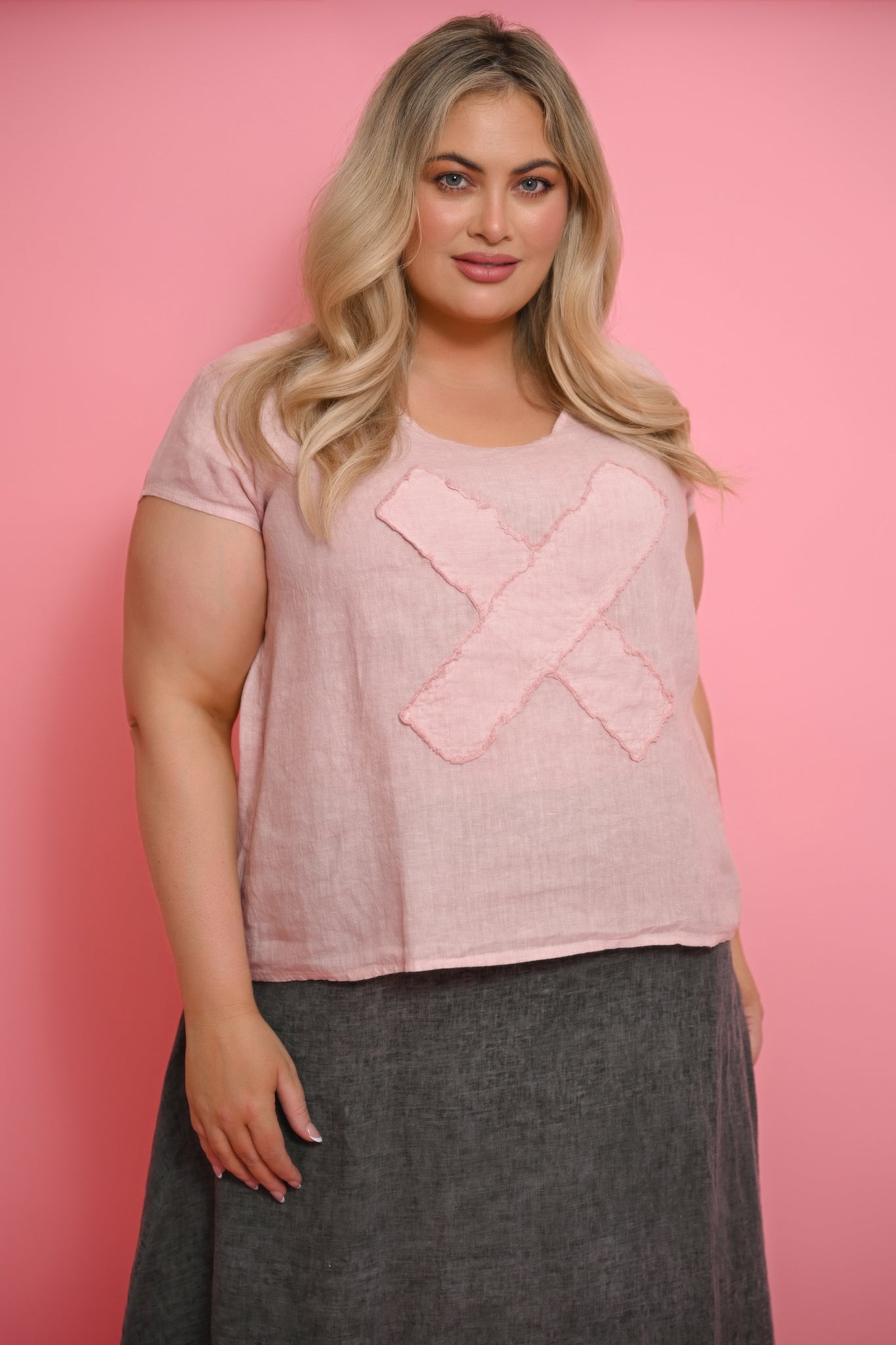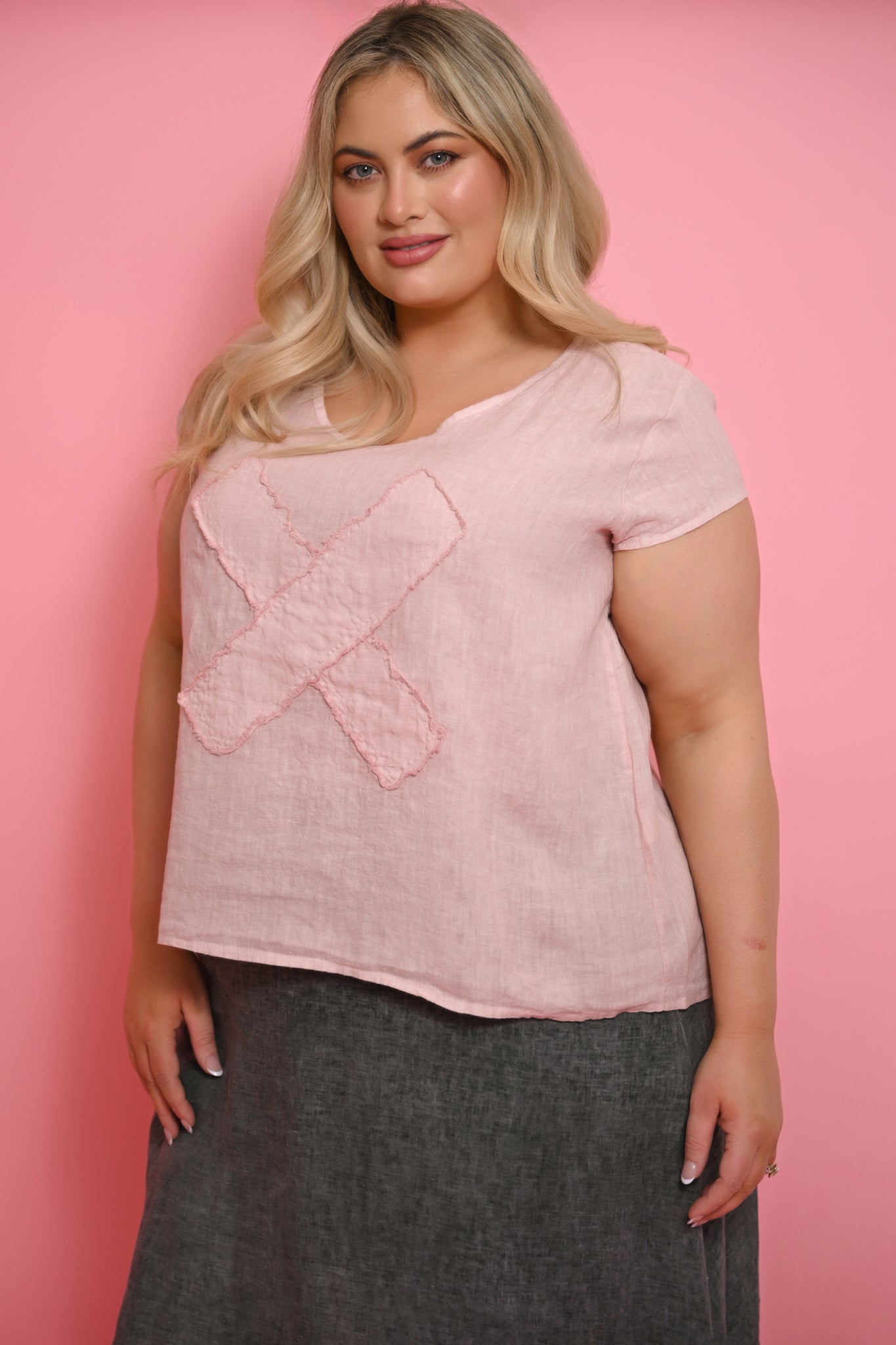 The round neckline and gentle cap sleeves create a flowing silhouette that feels light and effortless, while the subtle high-low hem provides a touch of extra coverage at the back. A hand-frayed linen cross detail on the front adds a hint of texture and individuality, giving this simple shape a distinctive finish.
