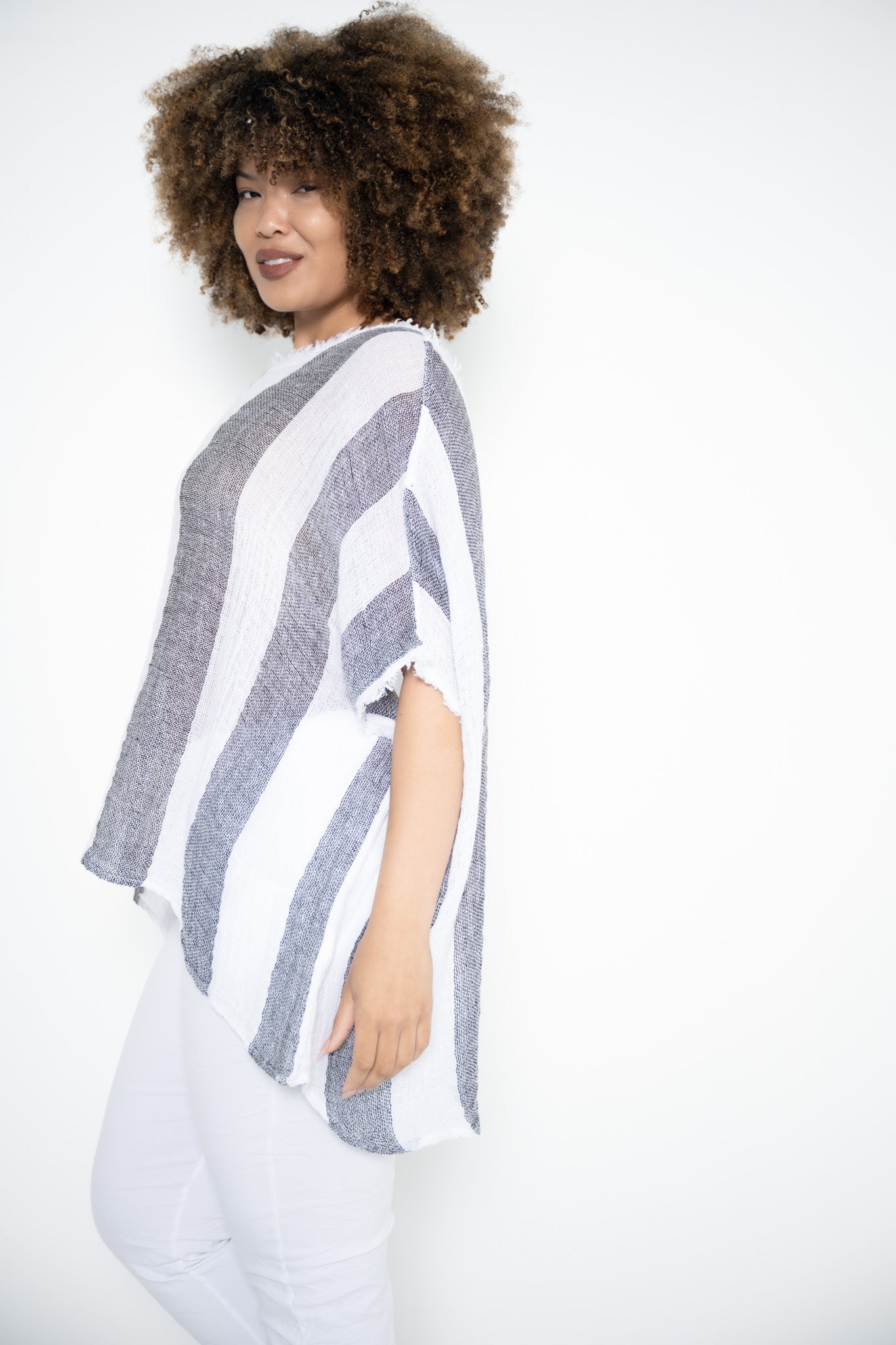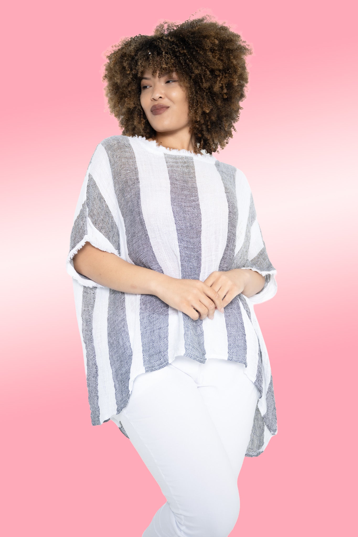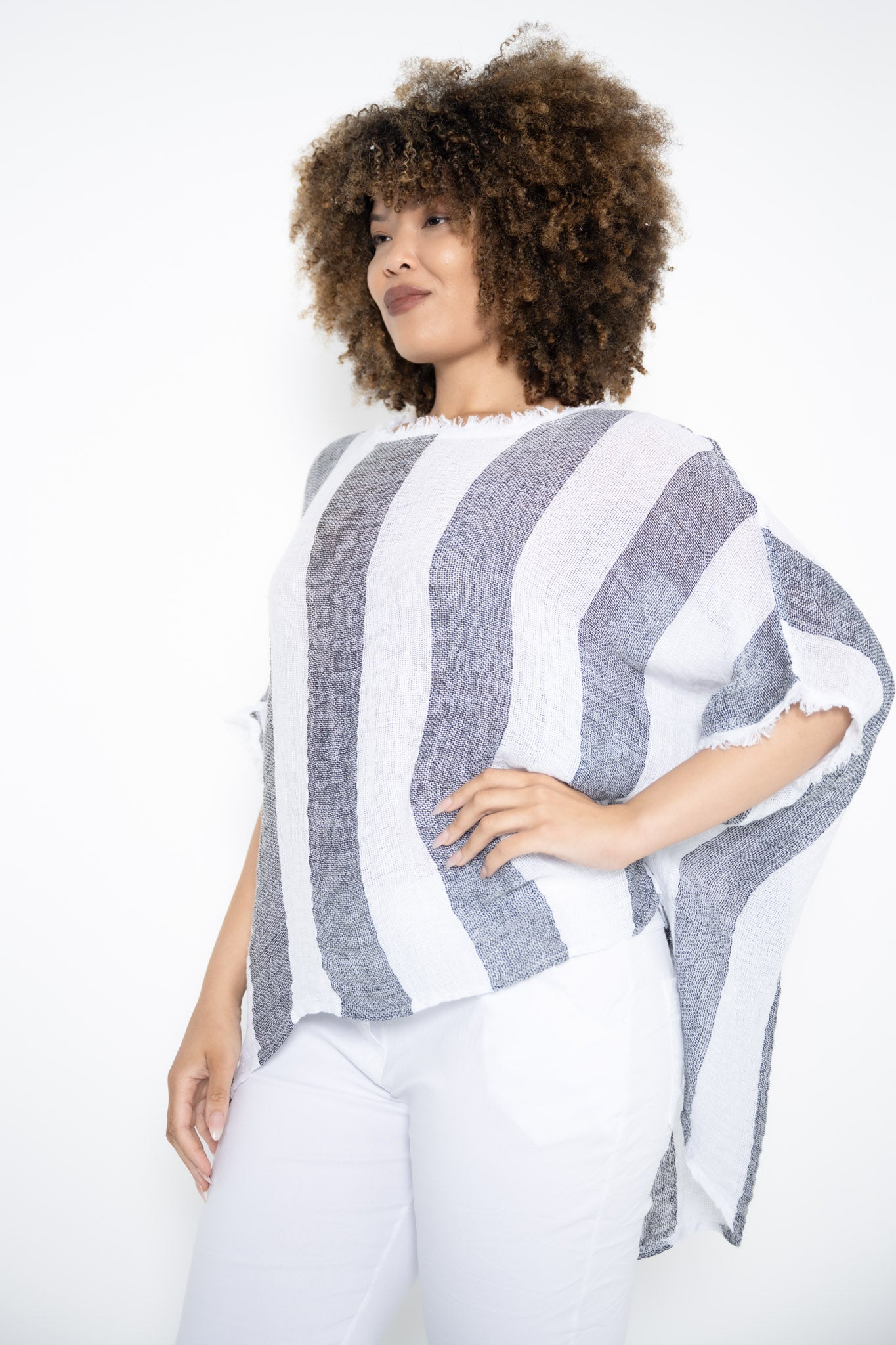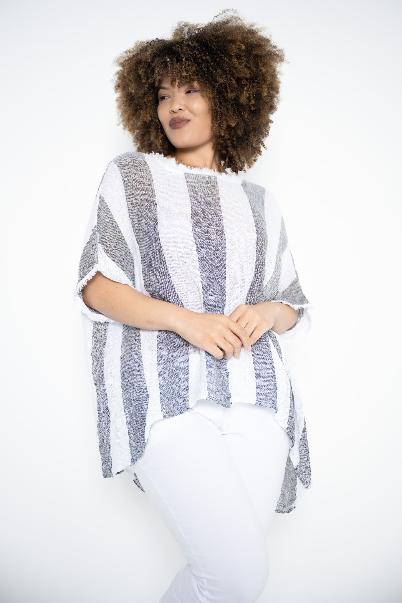 Crafted with a wide, straight fit that hangs easily from the shoulders, this top is finished with batwing sleeves that fall to a casual three-quarter length. Frayed detailing at the round neckline and sleeve hems adds a subtle touch of texture, while the curved front hem rises gently before falling into a longer back—creating a flattering, free-flowing shape.
