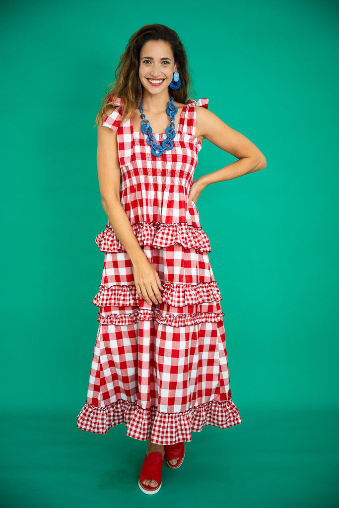 Step into the epitome of playfulness with our Gingham Sundress, where the timeless charm of red gingham meets a silhouette that dances with whimsy. The tie-up shoulder straps add a touch of flirtatious allure, while the shirred bust ensures a seamless and comfortable fit.