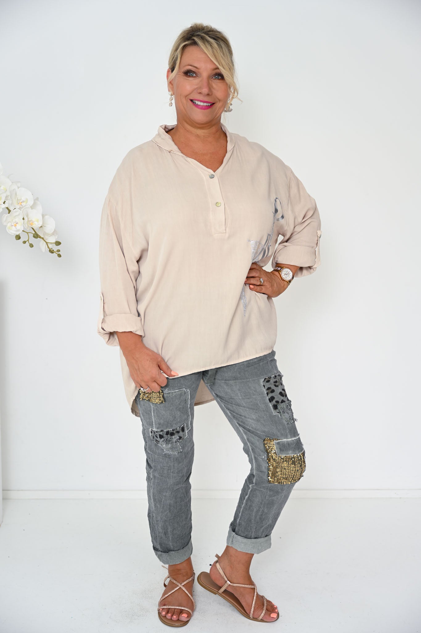 Practical hip pockets and a sleek skinny-leg silhouette create a streamlined shape, perfect for rolling at the cuffs for a relaxed, modern finish. Playful sequin accents and decorative trims are thoughtfully placed throughout, adding just the right hint of shimmer against the rich khaki backdrop.