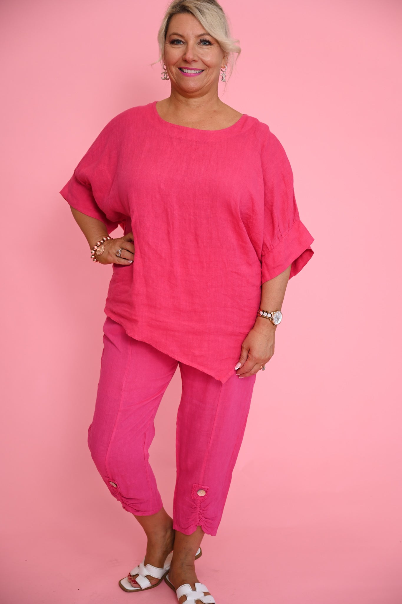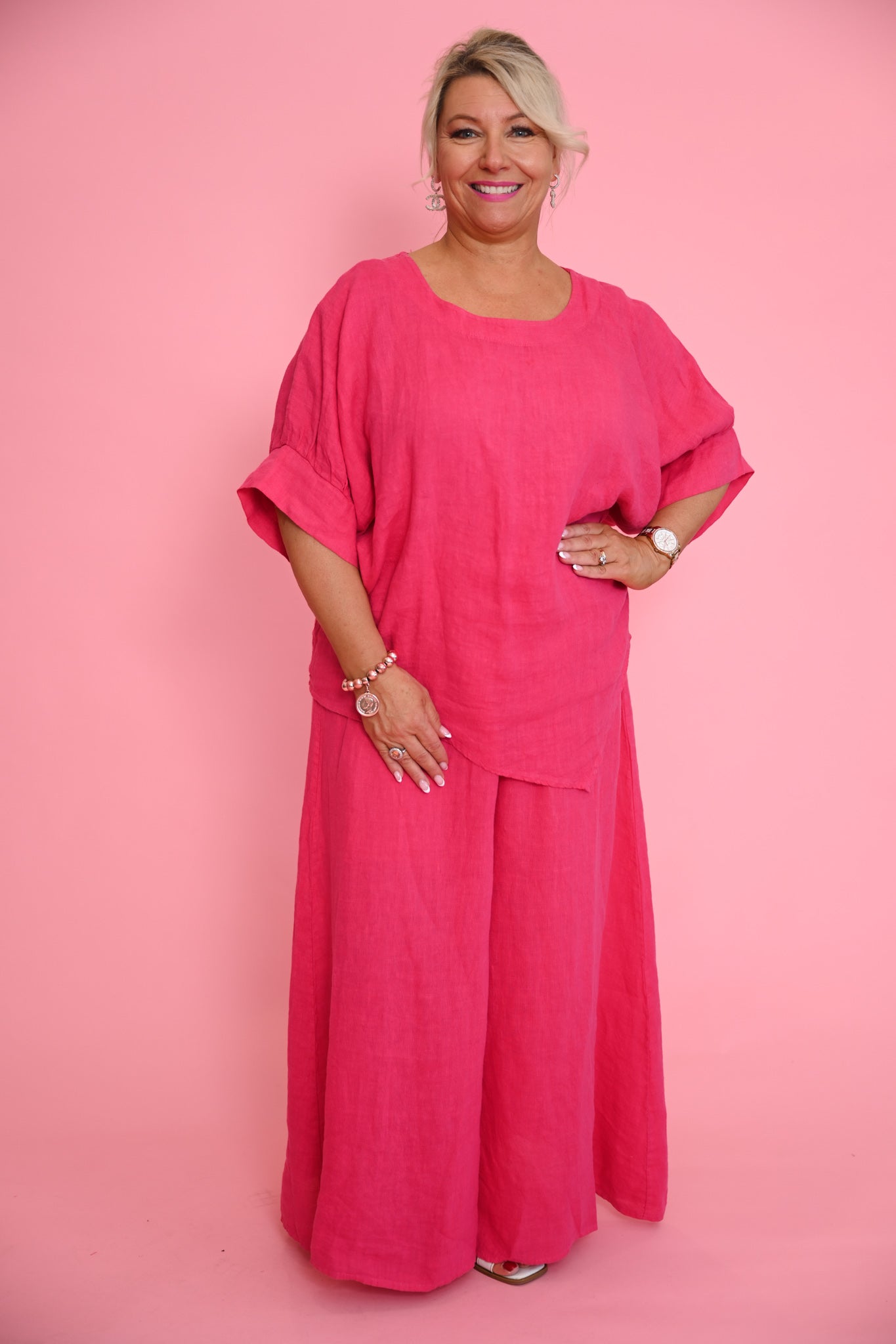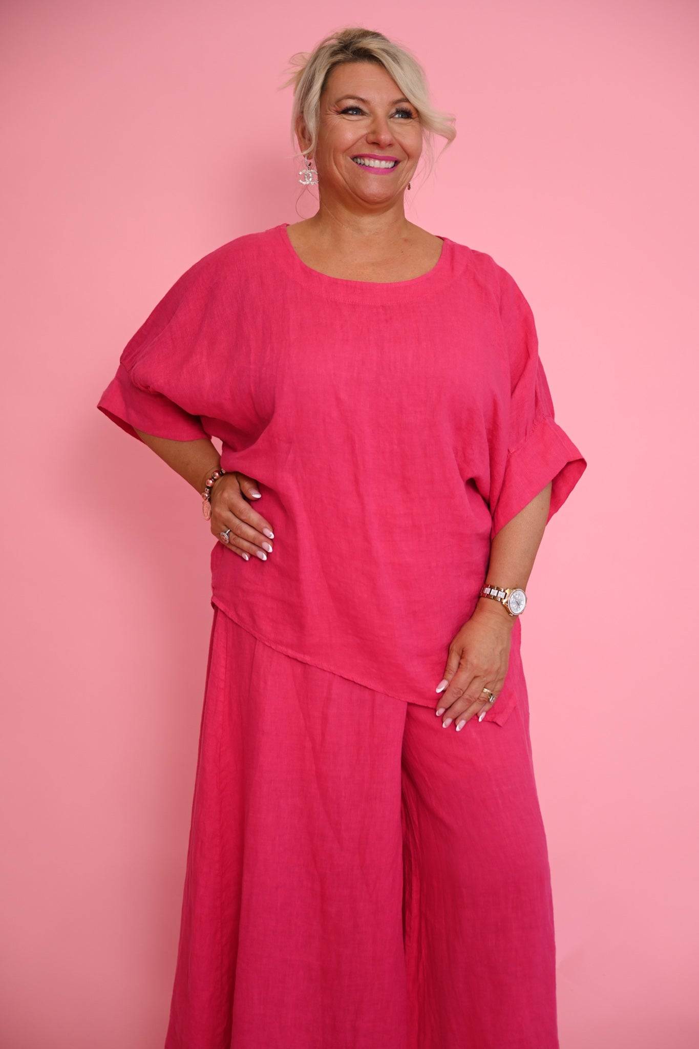 Bring bold, effortless style to your wardrobe with the Hannah Top, crafted from 100% natural, breathable Italian linen. Designed in a vibrant fuchsia hue, this top offers a striking statement while maintaining a relaxed, easy-to-wear silhouette.