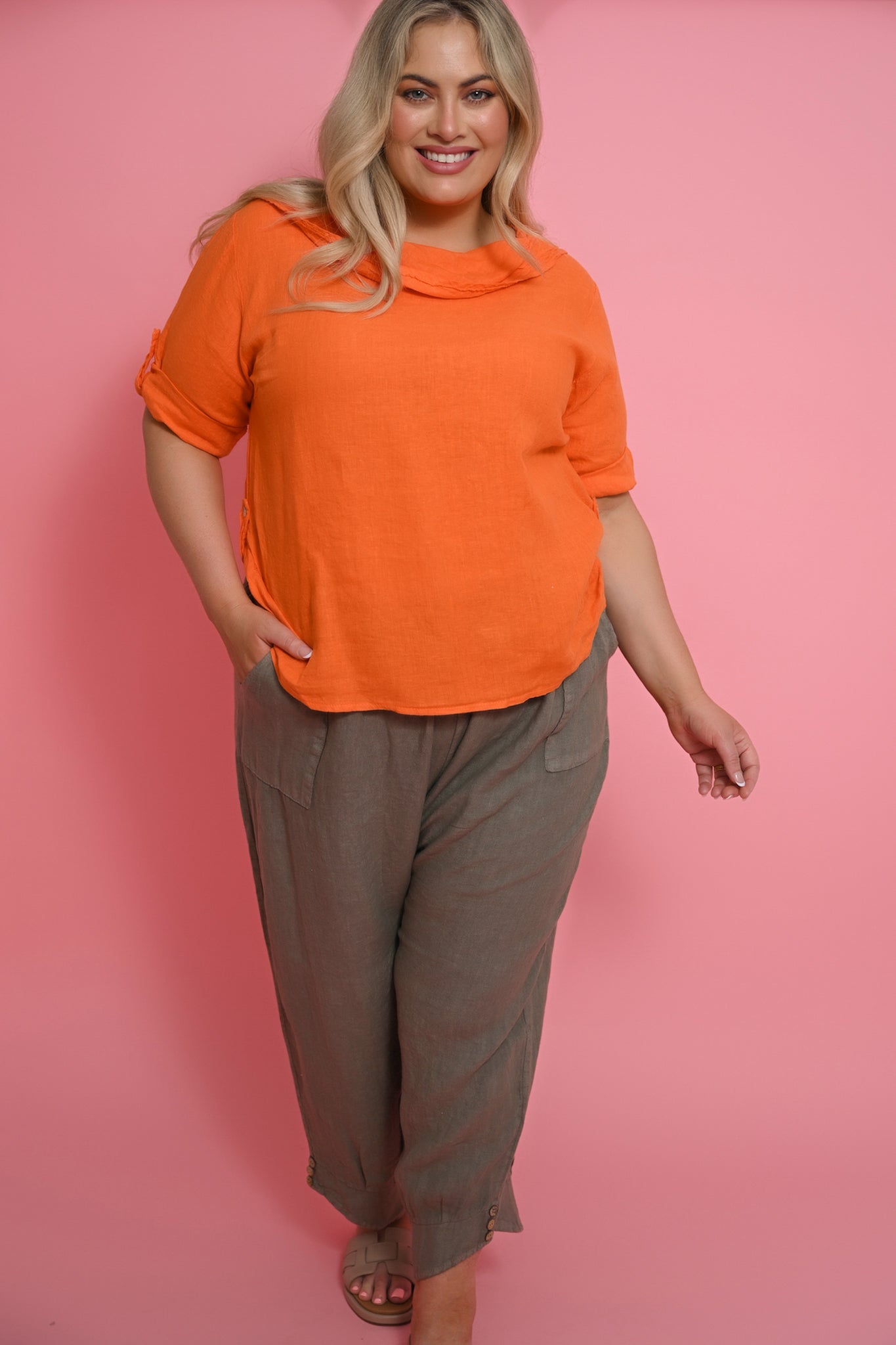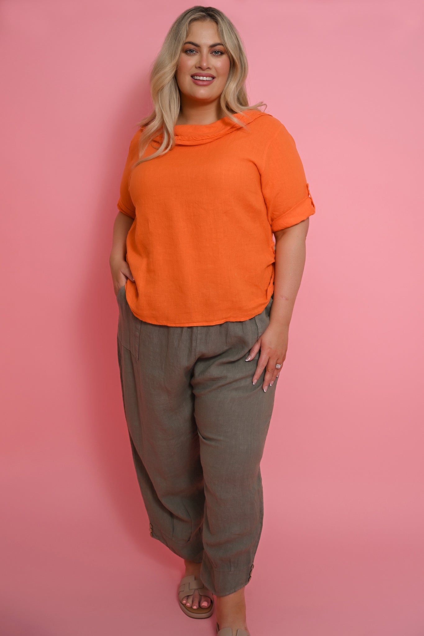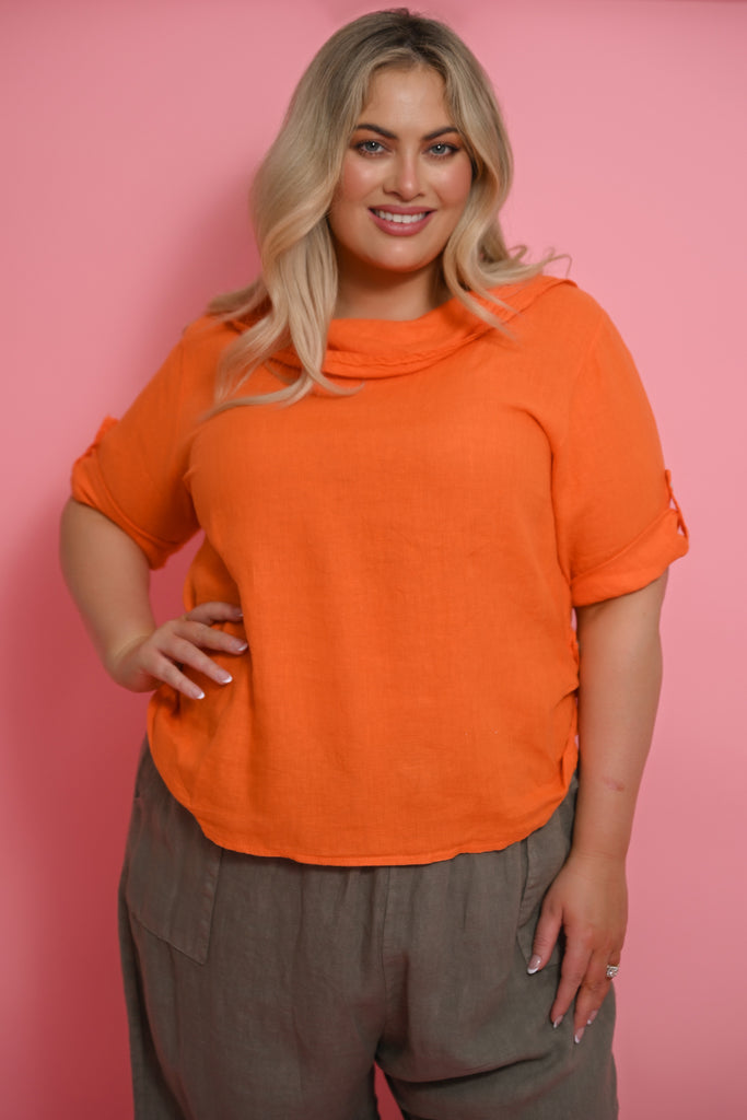 The Hepburn Top in a vibrant orange hue is crafted from lightweight linen, offering a breathable and comfortable fit. Its high cowl neckline drapes softly for a relaxed yet stylish look, while the cropped length creates a contemporary silhouette that pairs effortlessly with high-waisted trousers or skirts.