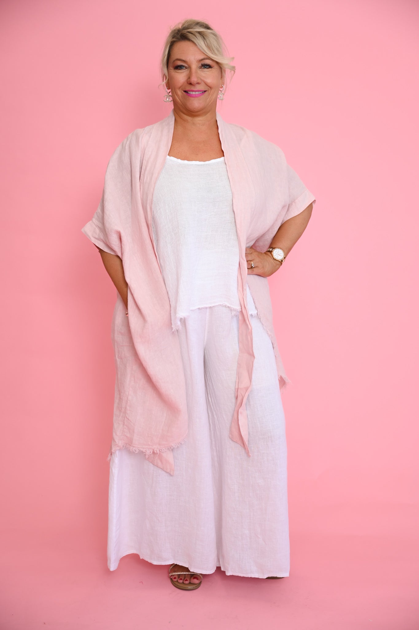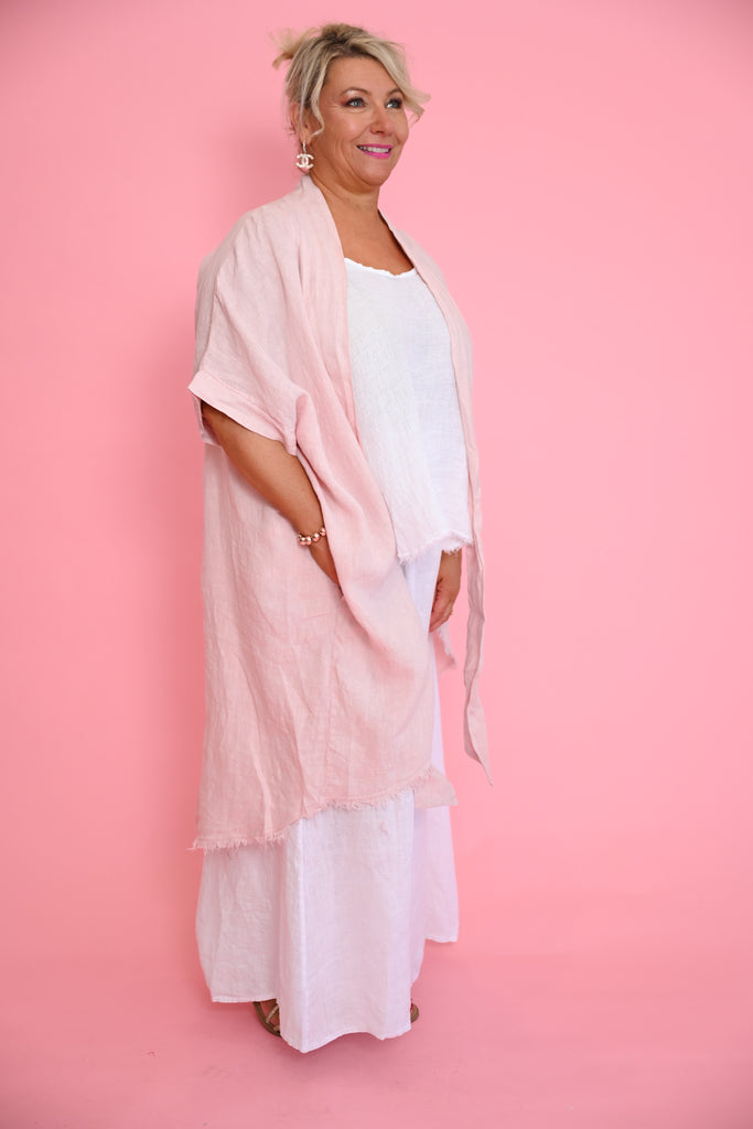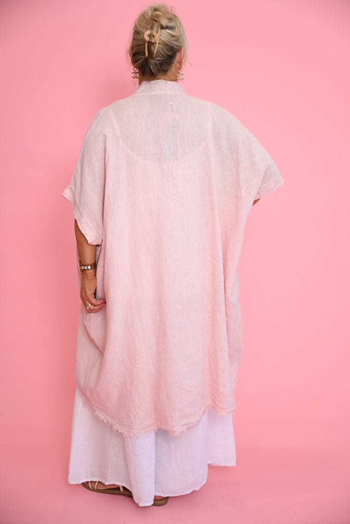 The Isabella Top in gentle pink is a graceful expression of relaxed femininity. Crafted from 100% Italian linen, this longline jacket-inspired silhouette drapes softly to mid-calf at the back, creating a flowing, elegant shape that feels light and effortless.